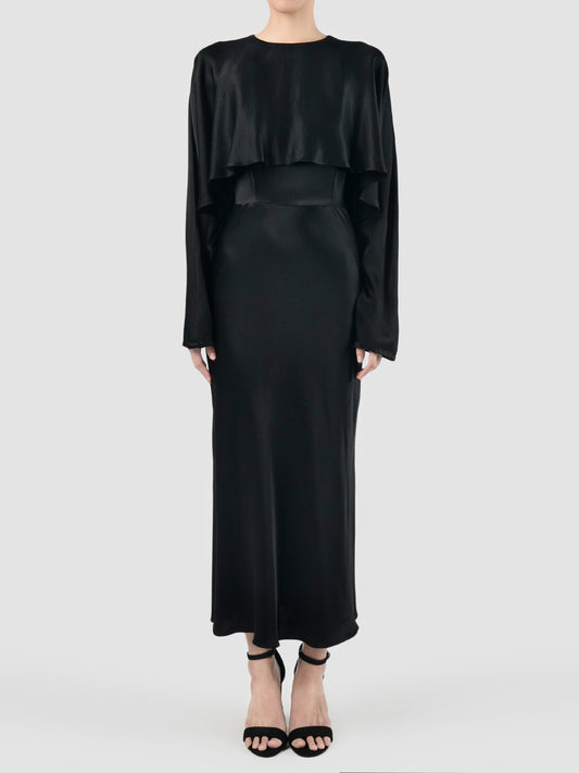 Black satin long-sleeved caped midi dress