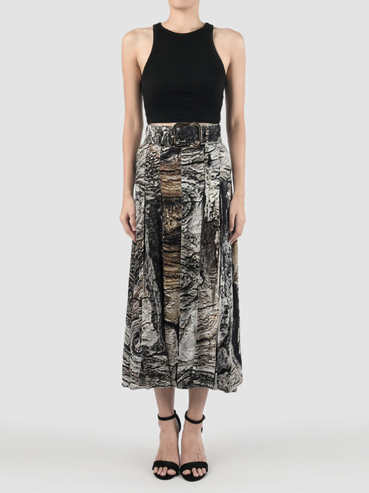 Bark Print Pleated Cupro Belted Skirt