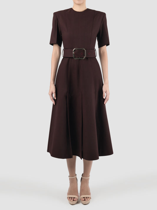 Slits Around rosewood wool fitted midi dress with belt