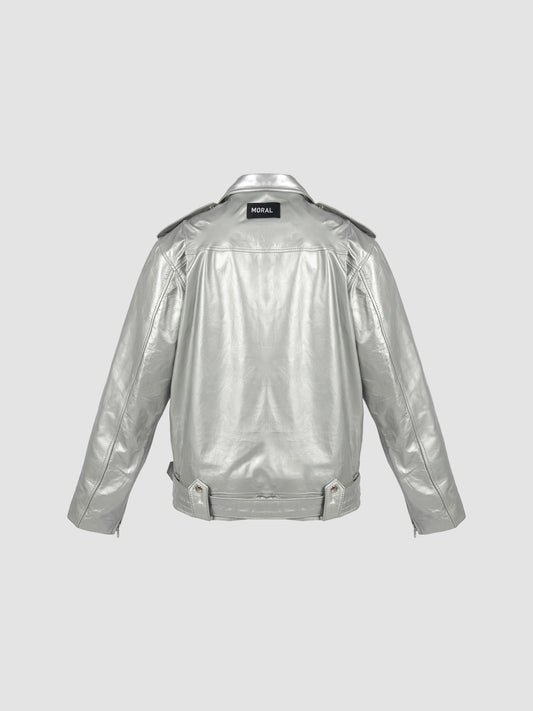 Regular Cut Leather Biker Jacket in Silver