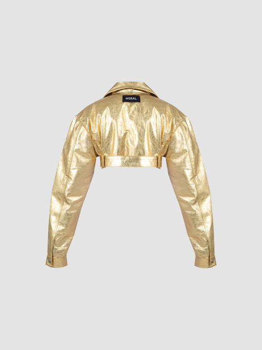 Cropped Leather Biker Jacket in Metallic Gold