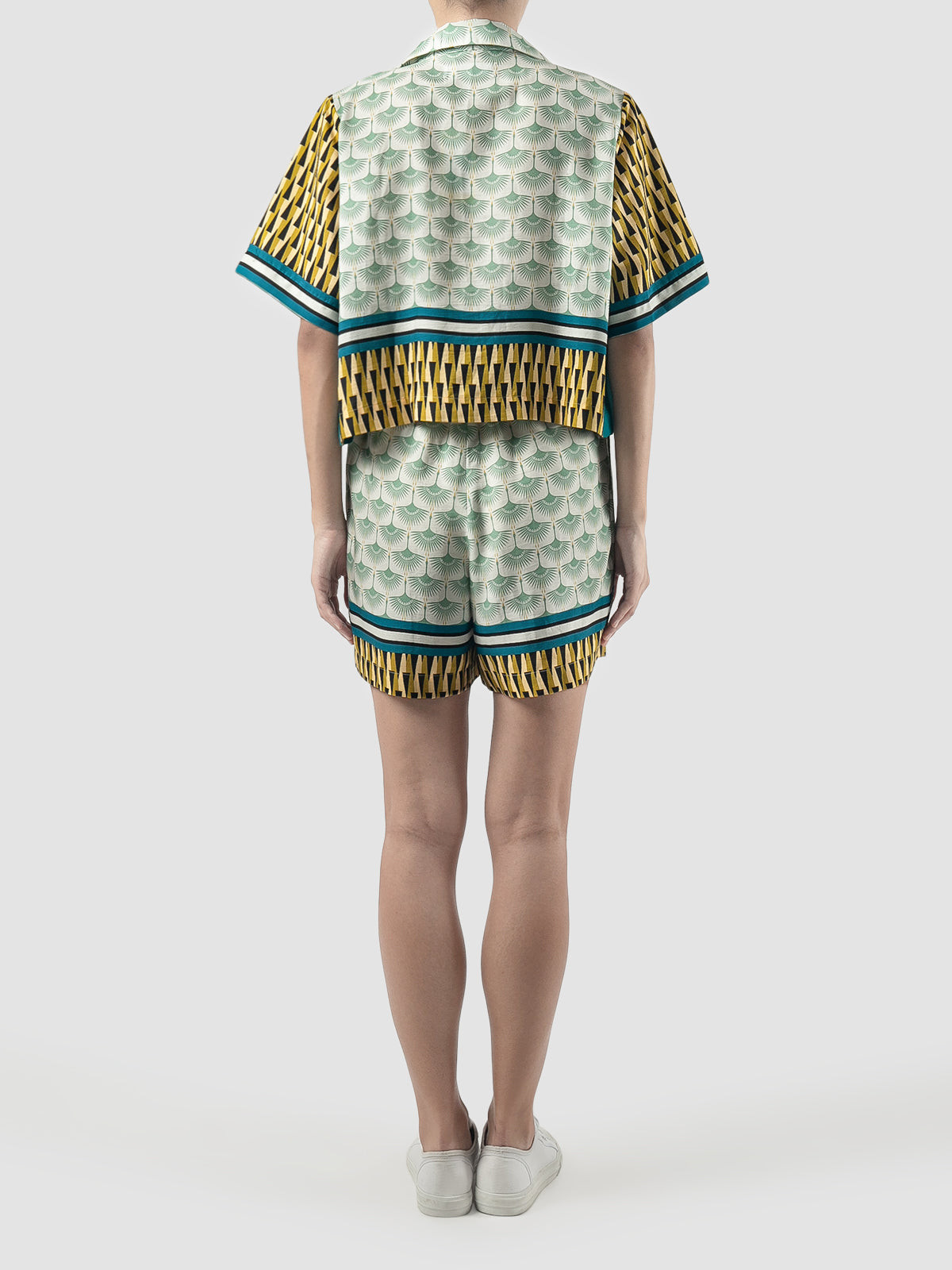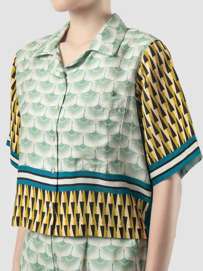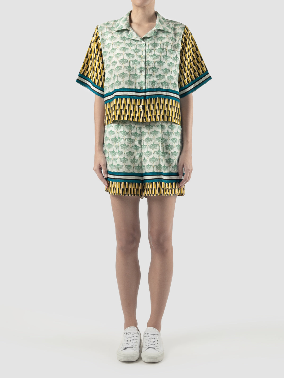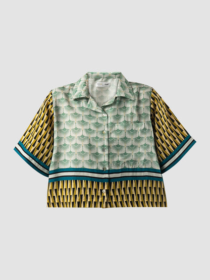 This printed cropped-length shirt features a classic notched collar, a front button opening, and a seamless breast pocket.