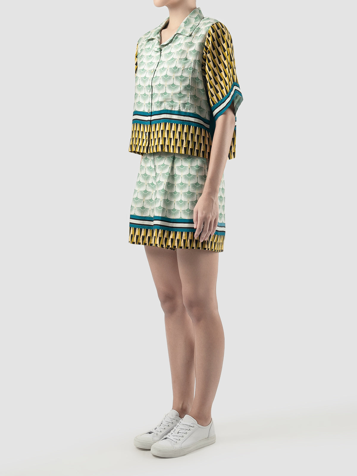 Adorned with a delightful swan-inspired mint-white pattern, the top is complemented by a captivating black-yellow geometric design on its hemline and short sleeves.