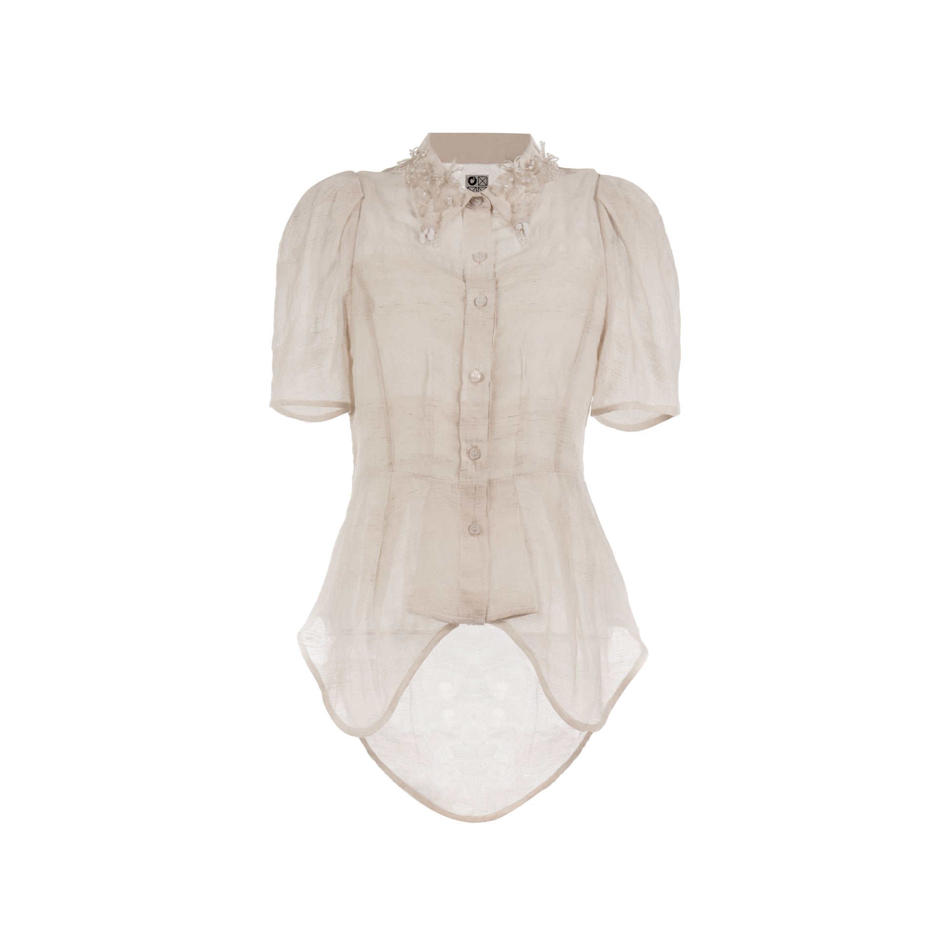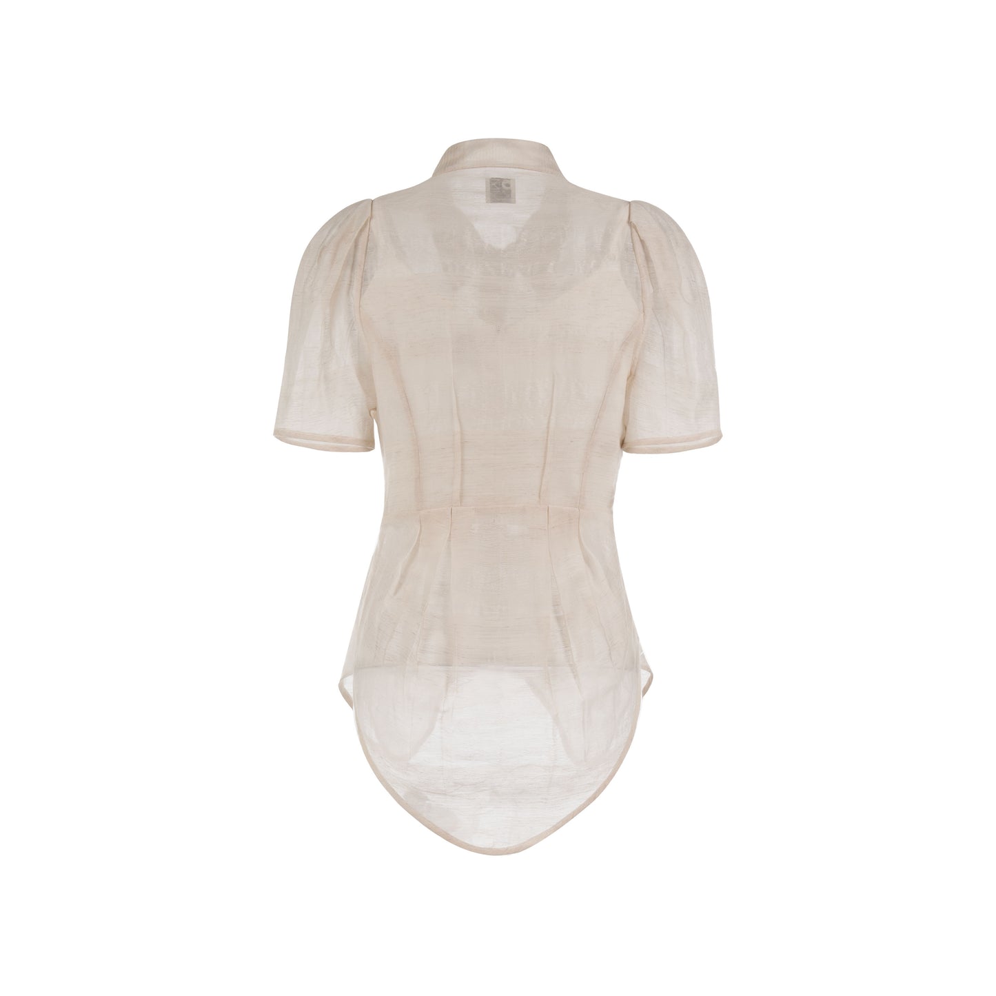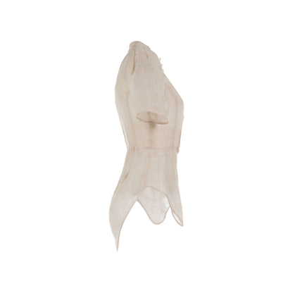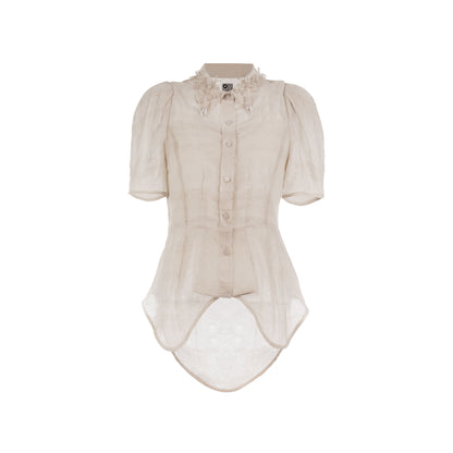 A sheer blouse featuring short puff sleeves and a flattering peplum waist cut.