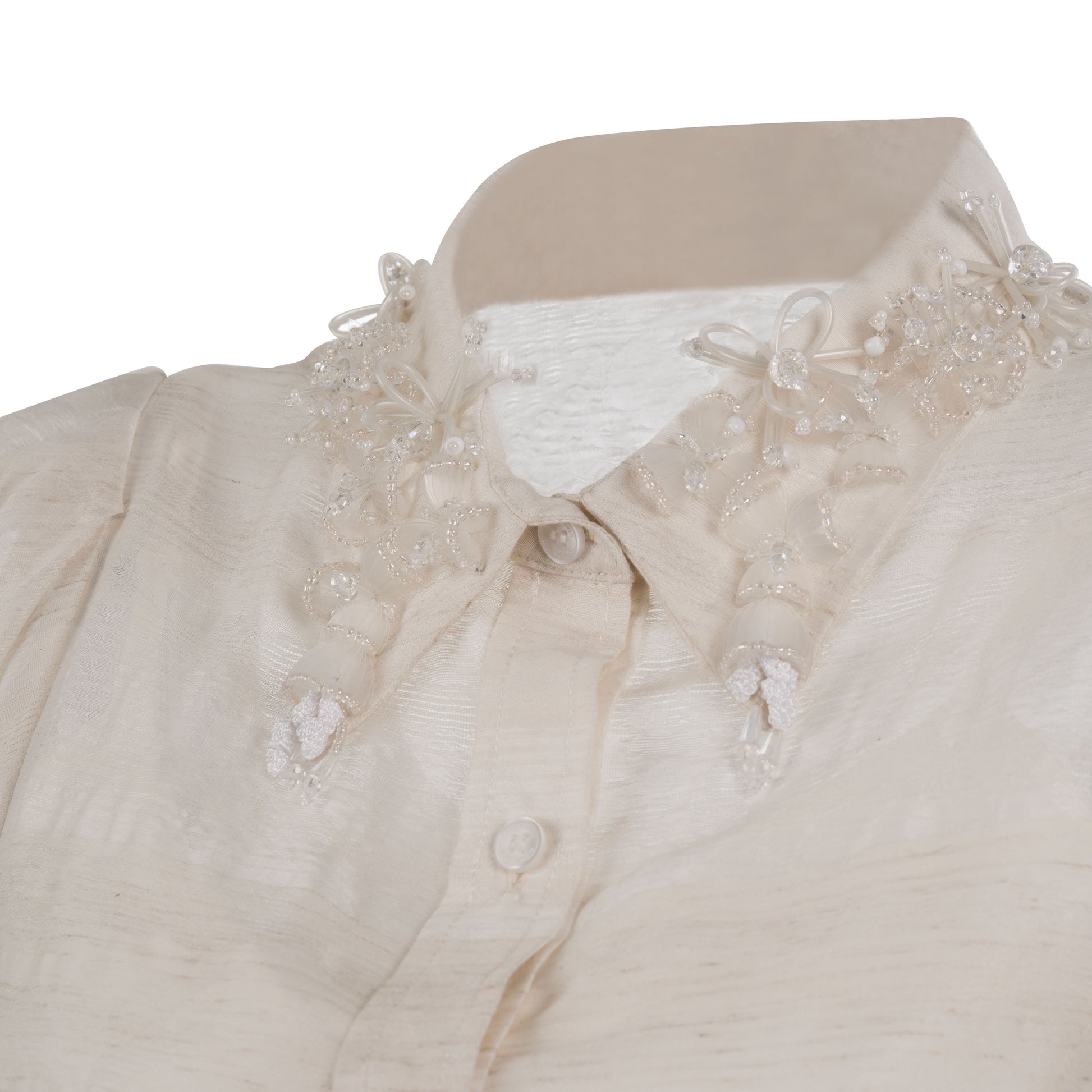 Its classic collar is elegantly adorned with 3D flower embellishments for a touch of delicate charm.