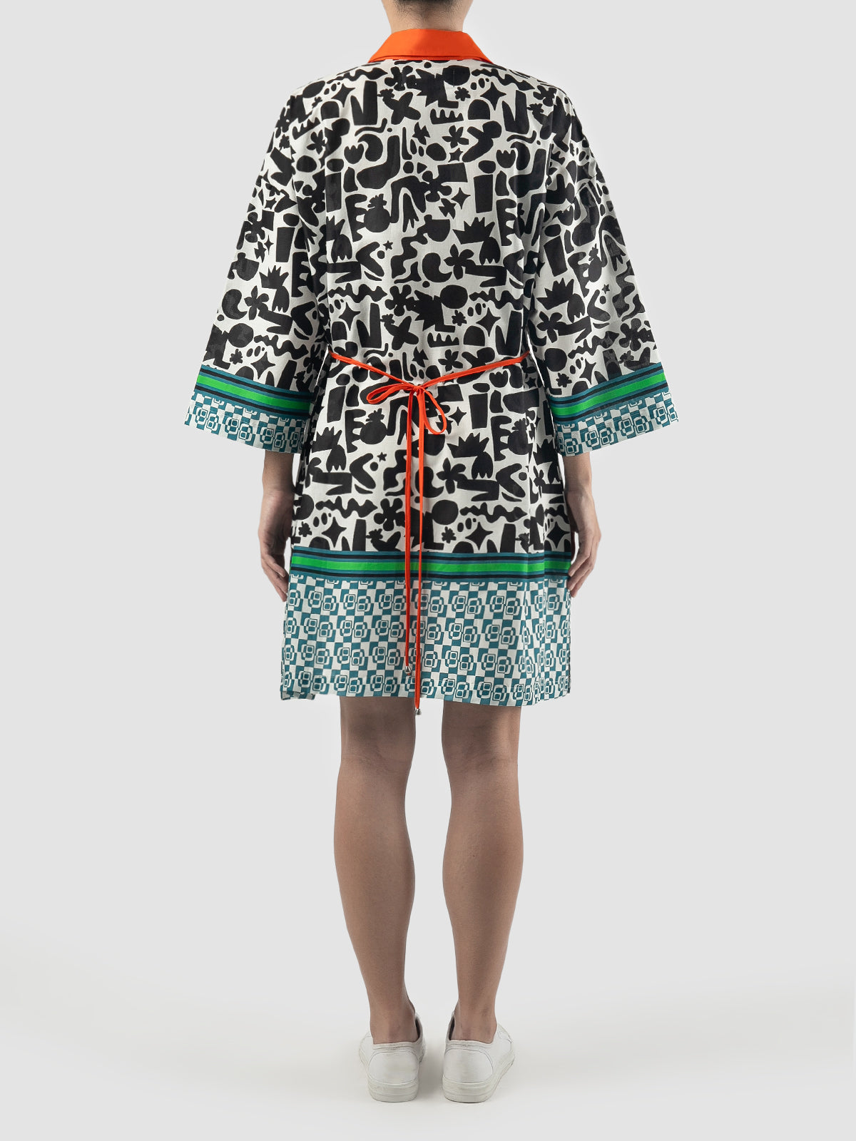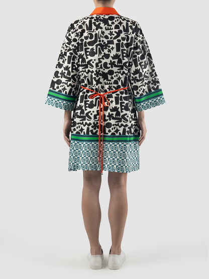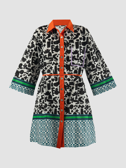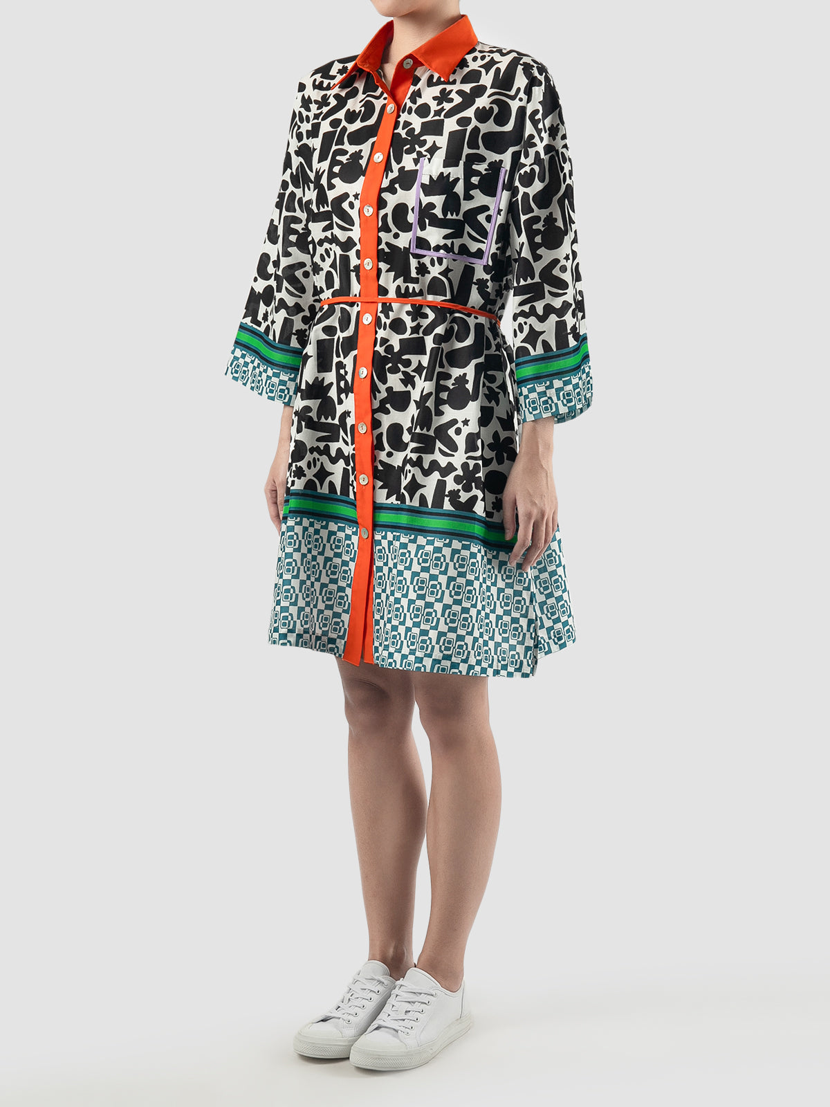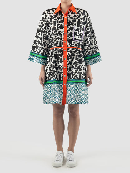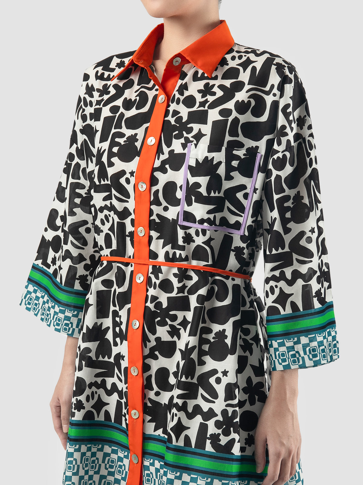 This playful midi-length shirt dress features a black-and-white doodle pattern with wide sleeves and a breast pocket to add a relaxed and casual vibe.