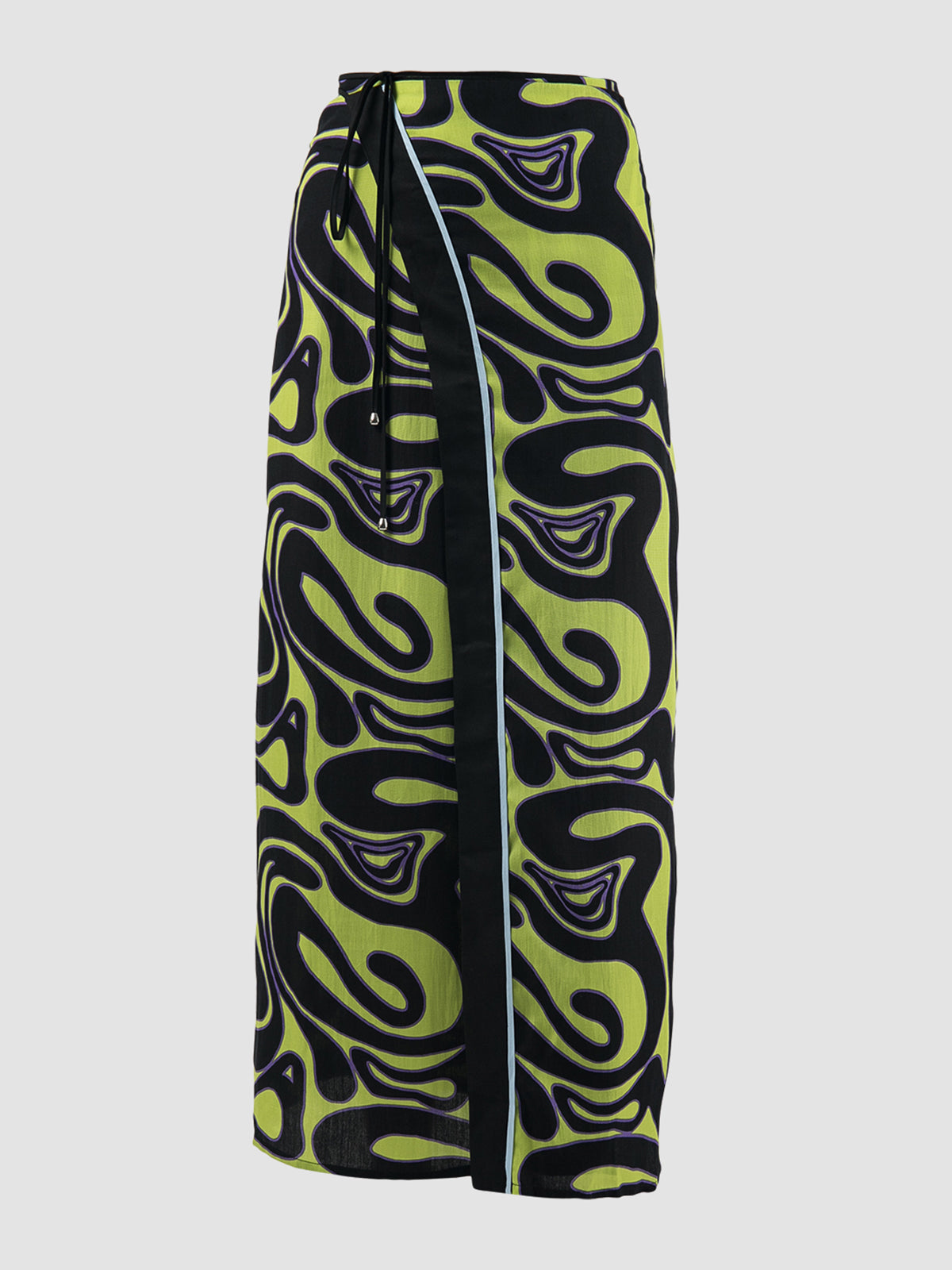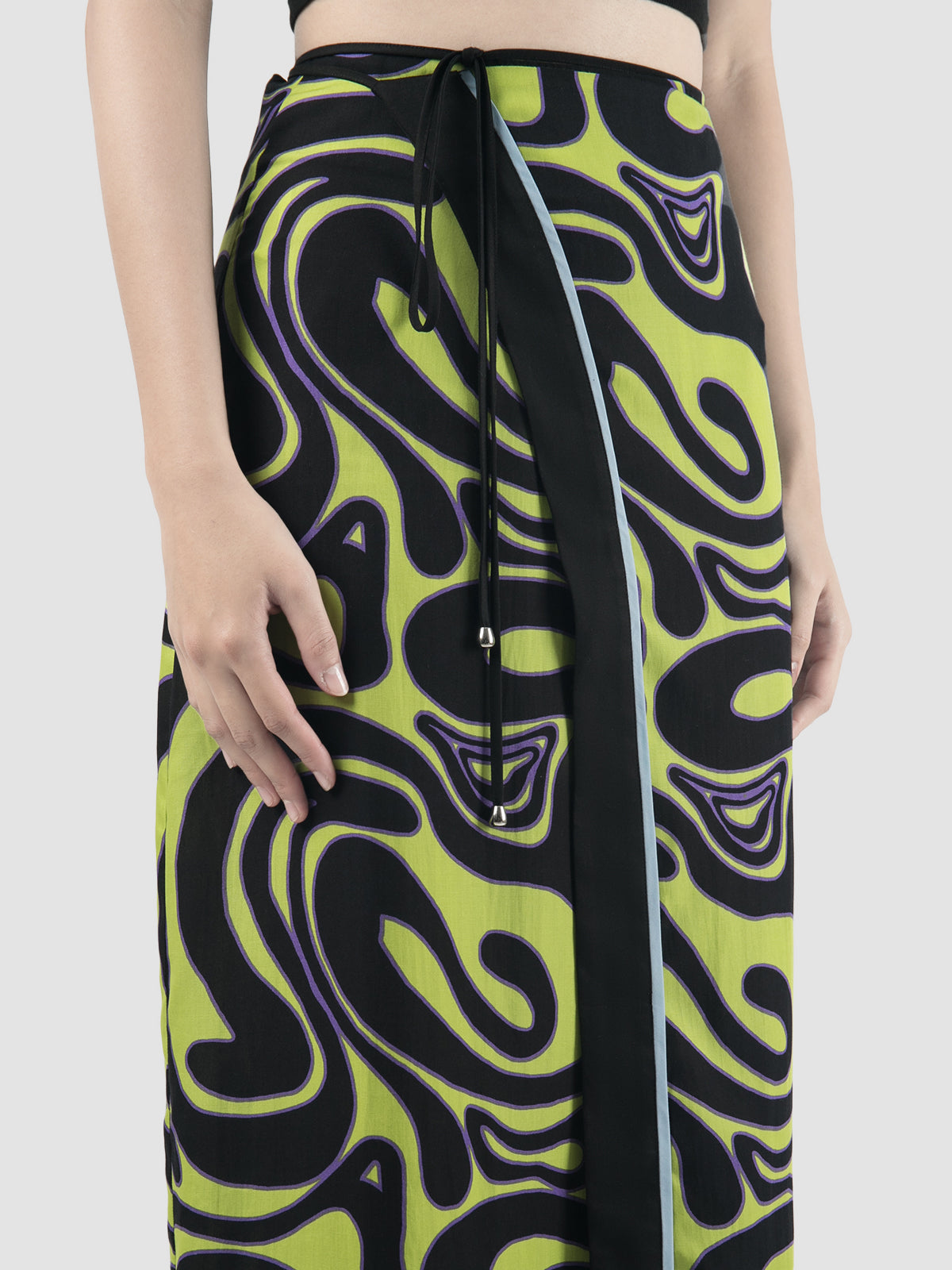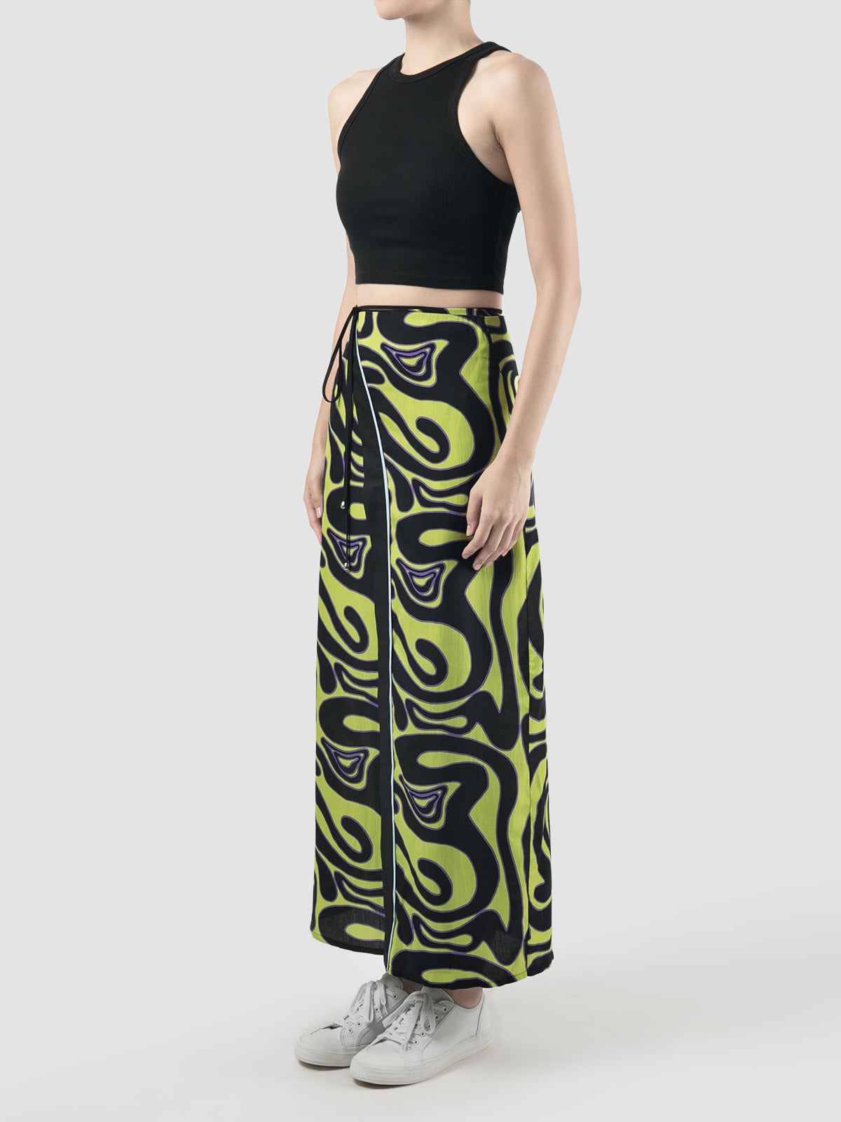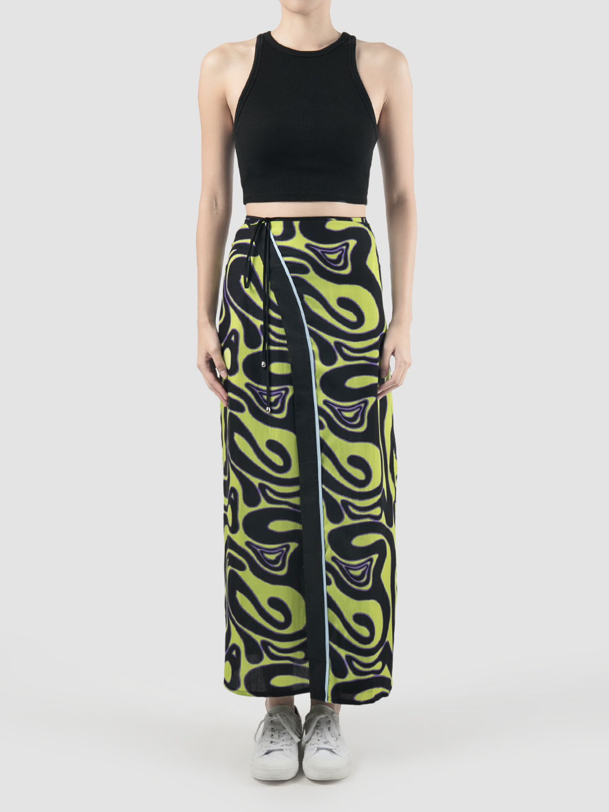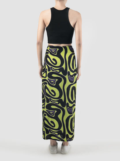 This full-length sarong features a captivating black swirl pattern on a vibrant neon green base, creating a bold and dynamic visual.