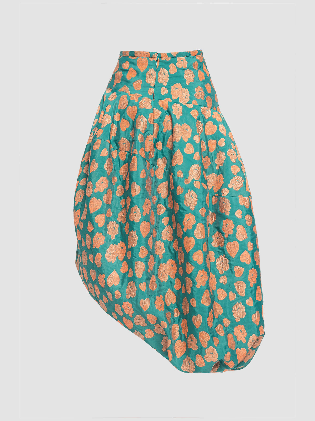 Crafted from cloqué jacquard with all-over floral and heart patterns, this cocoon shaped skirt features billowing voluminous skirt and cut for a midi length. Invisible zip closure at back. Fits true to size.