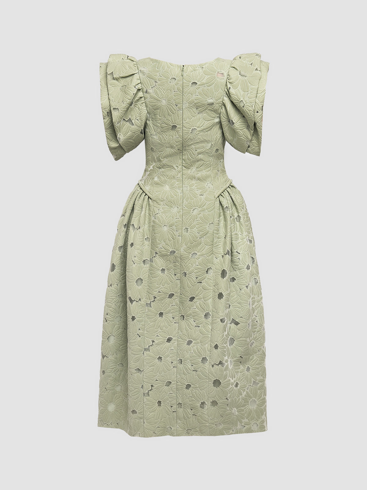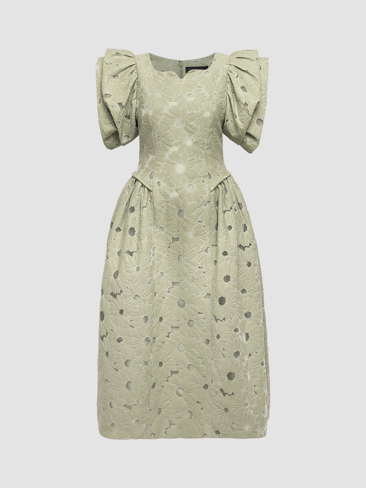 Crafted from jacquard with all-over floral patterns, this midi dress features unstructured gathered sleeves, a sweetheart neckline, and a voluminous cocoon skirt. Invisible zip fastening at back. Fits true to size.