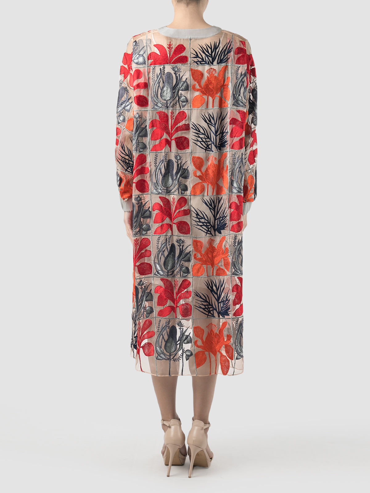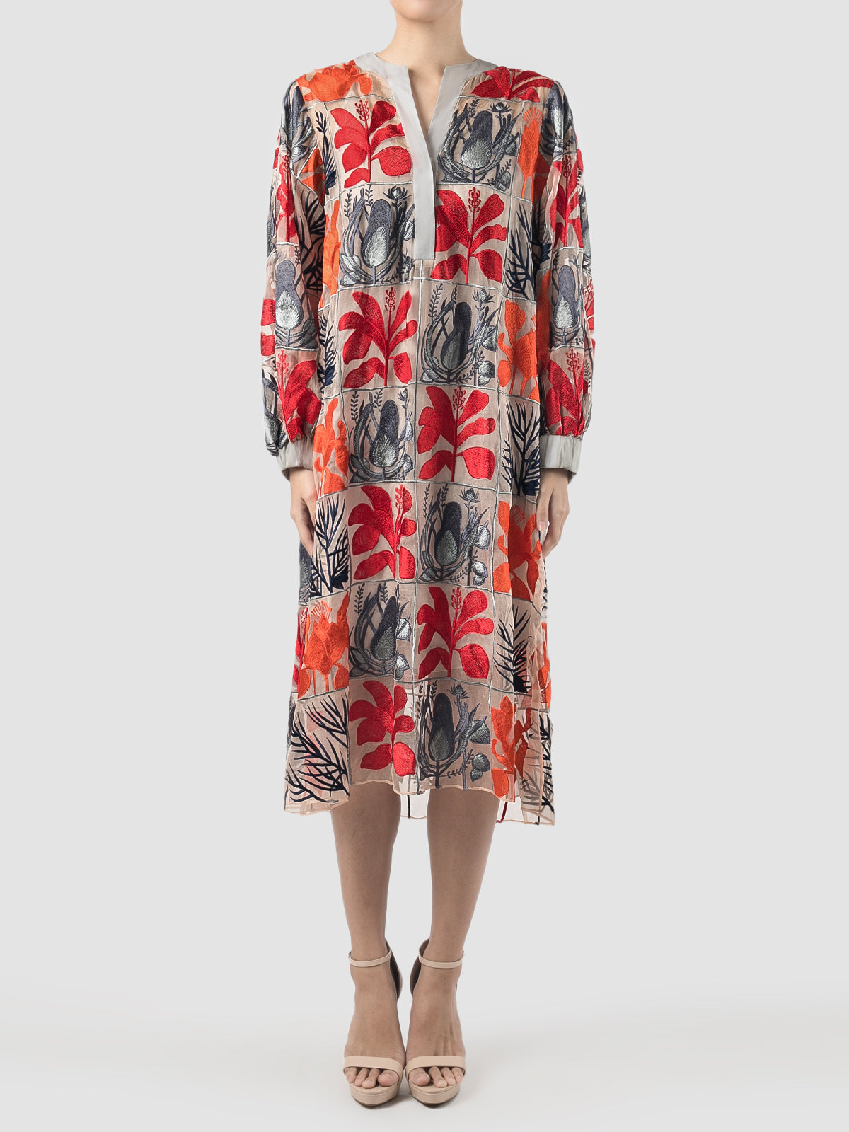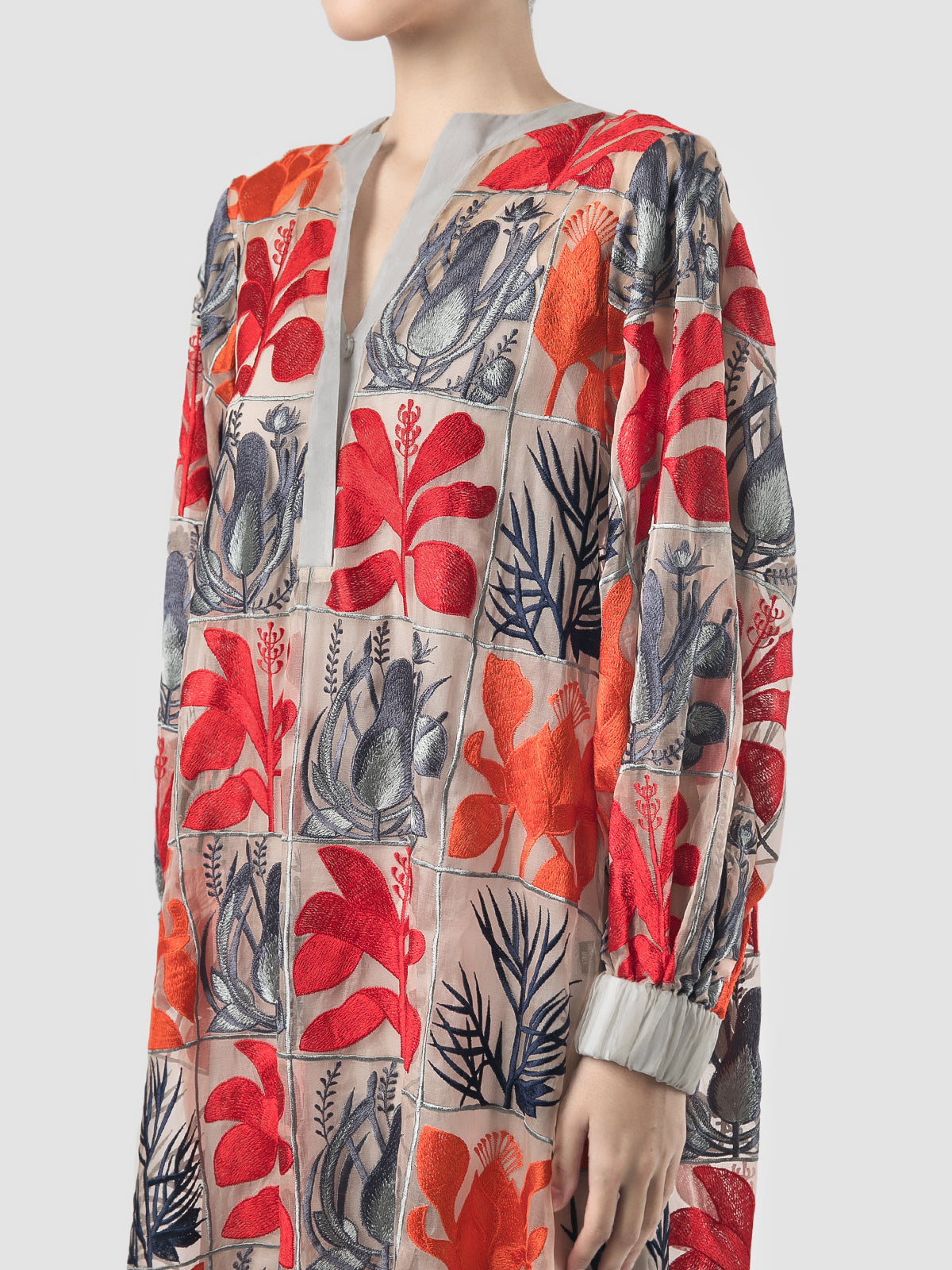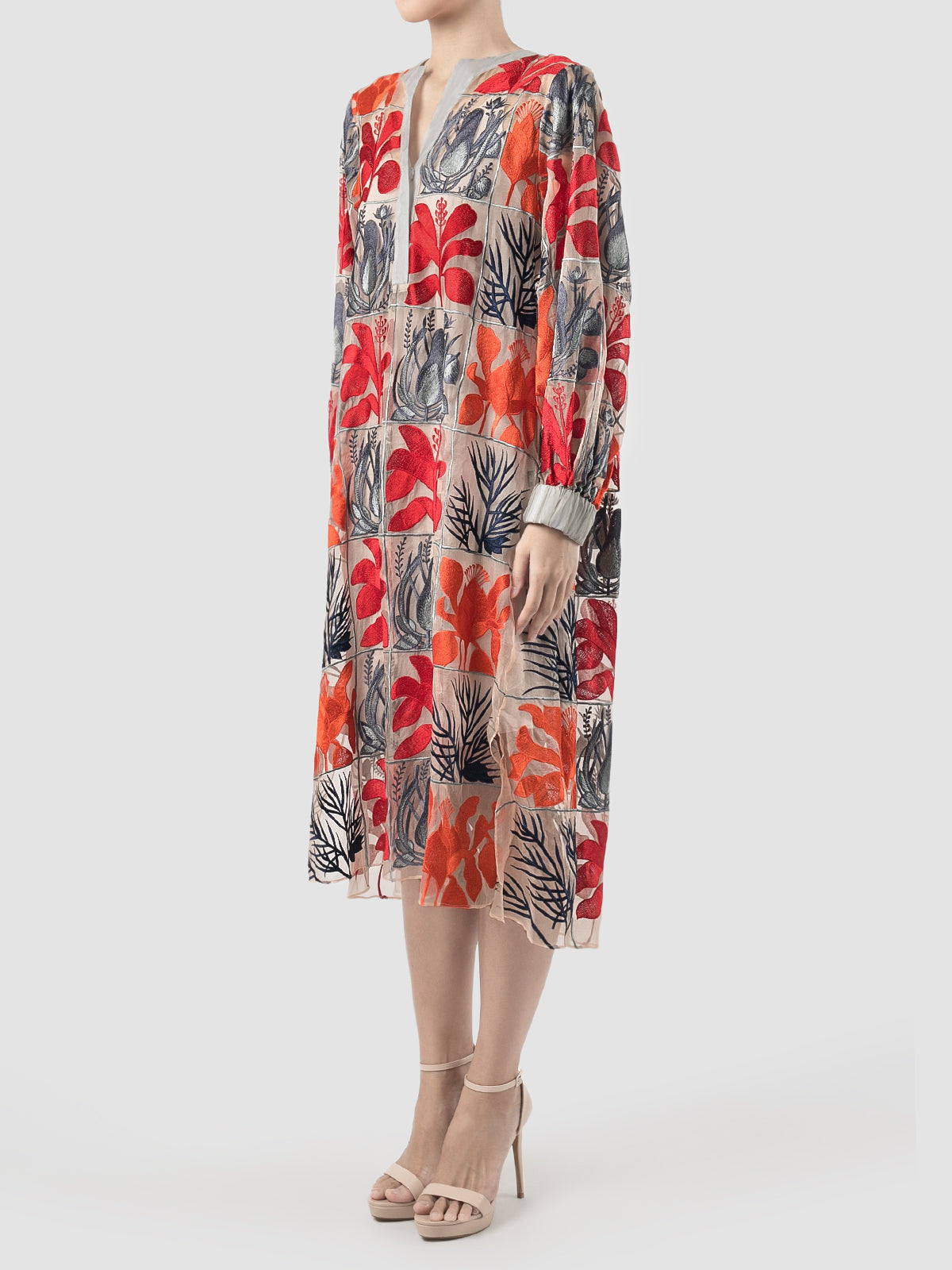 Make a statement in the multicolored Basia silk organza midi dress from Major Minor. This A-line dress is adorned with nature-inspired floral and foliage embroideries over lightly translucent organza fabric.