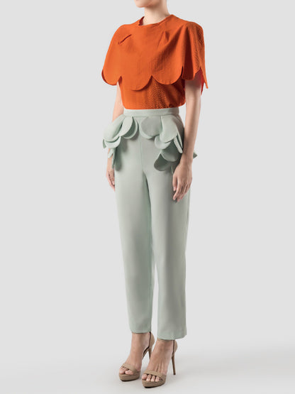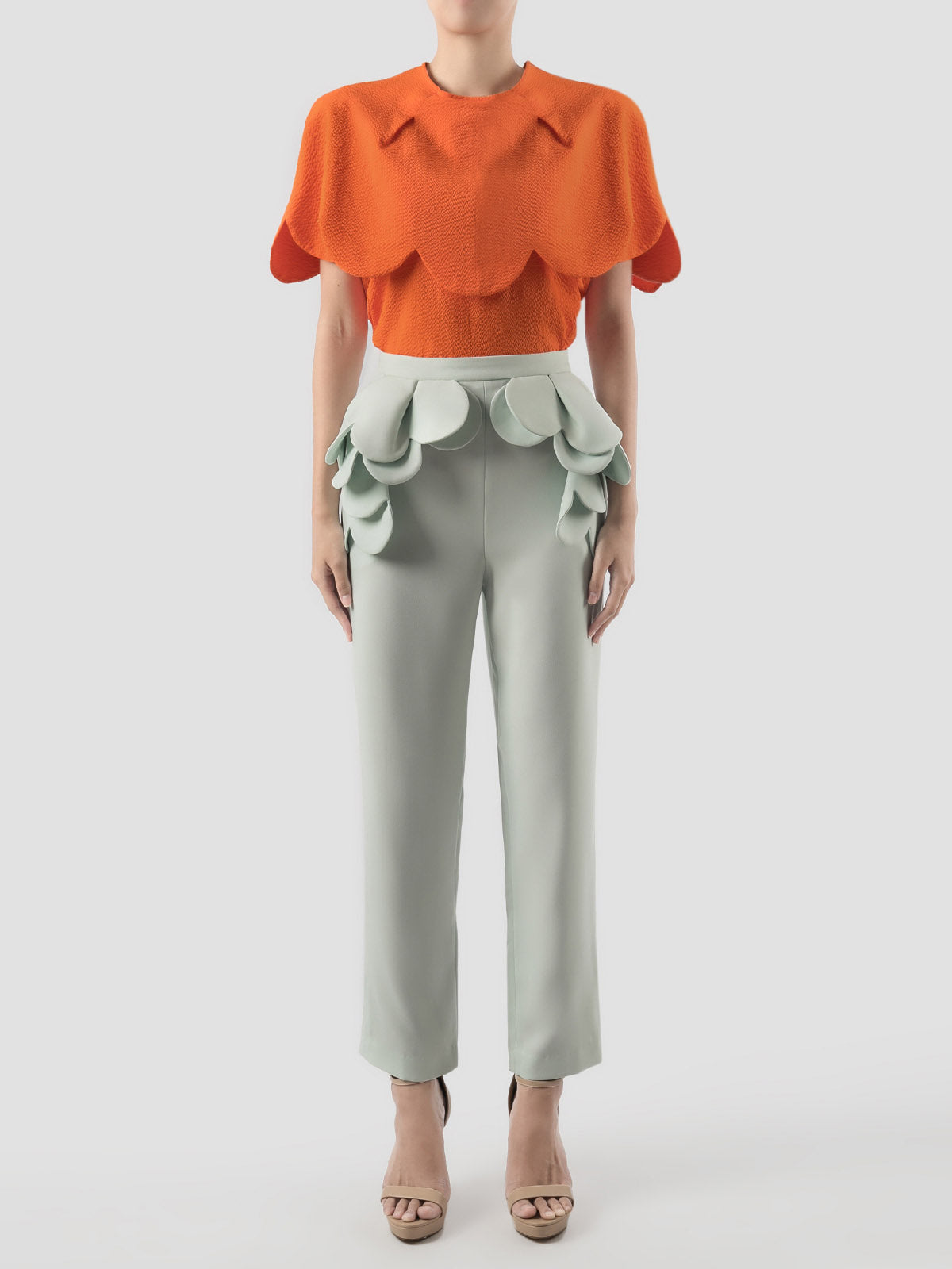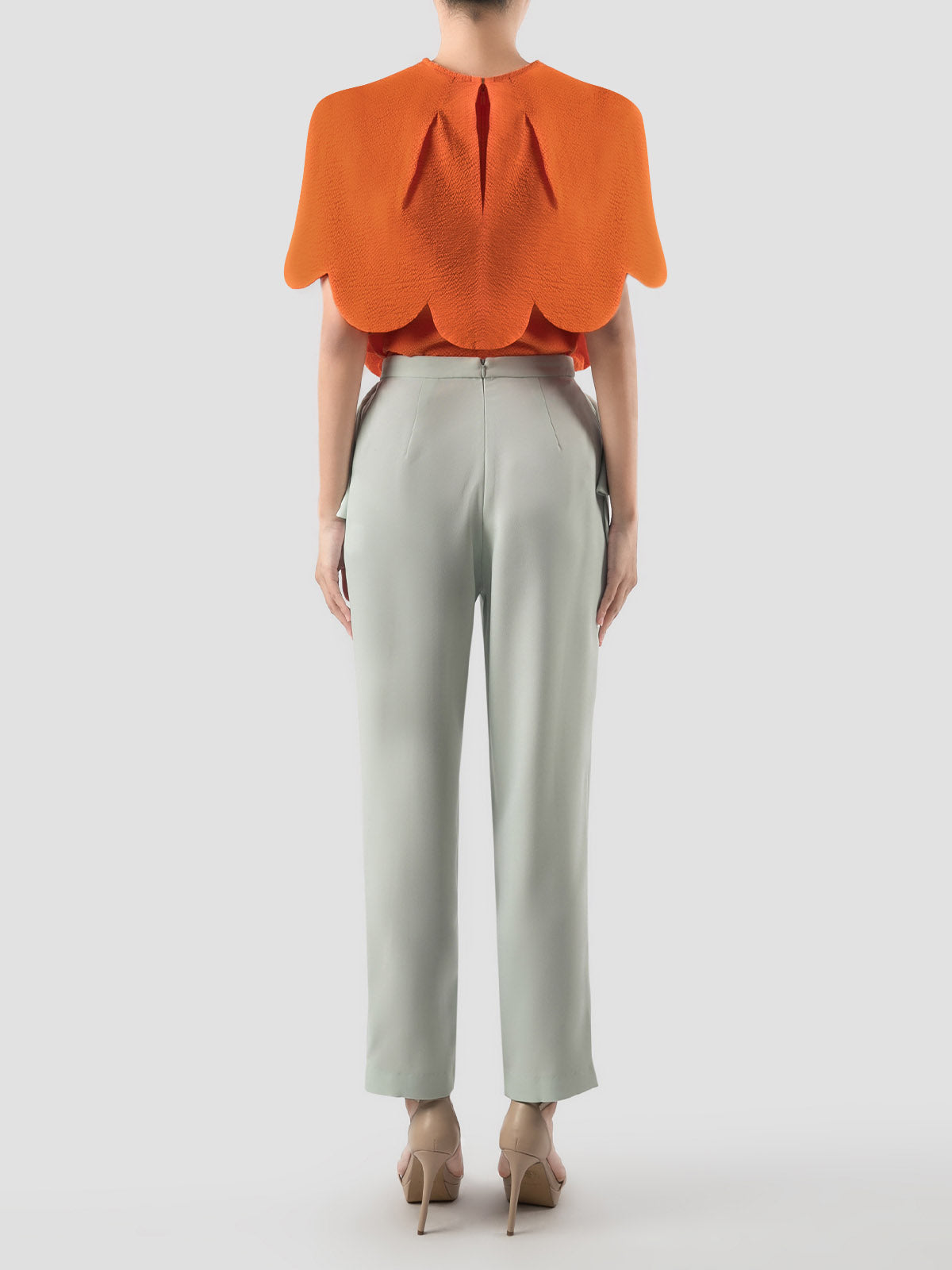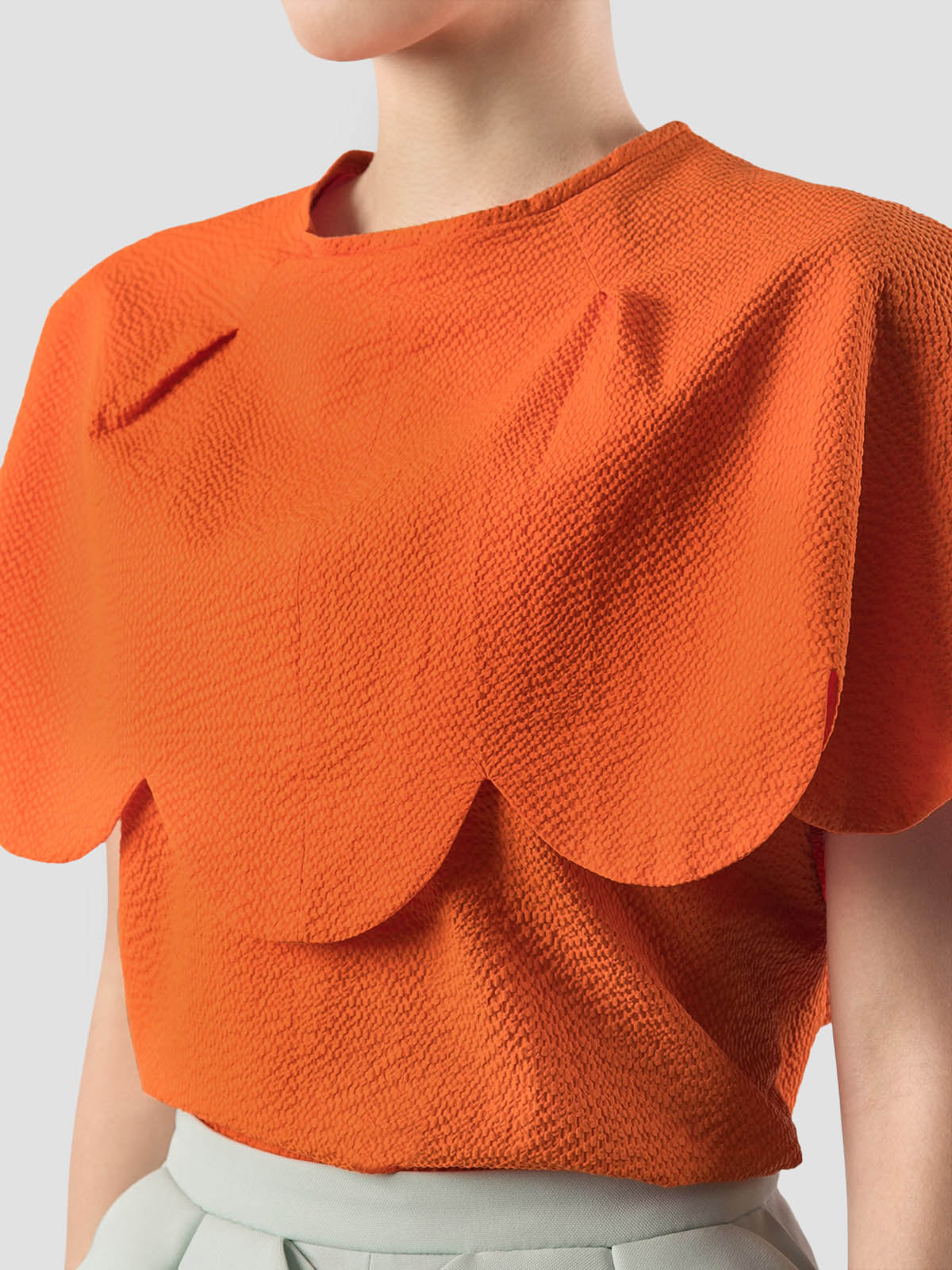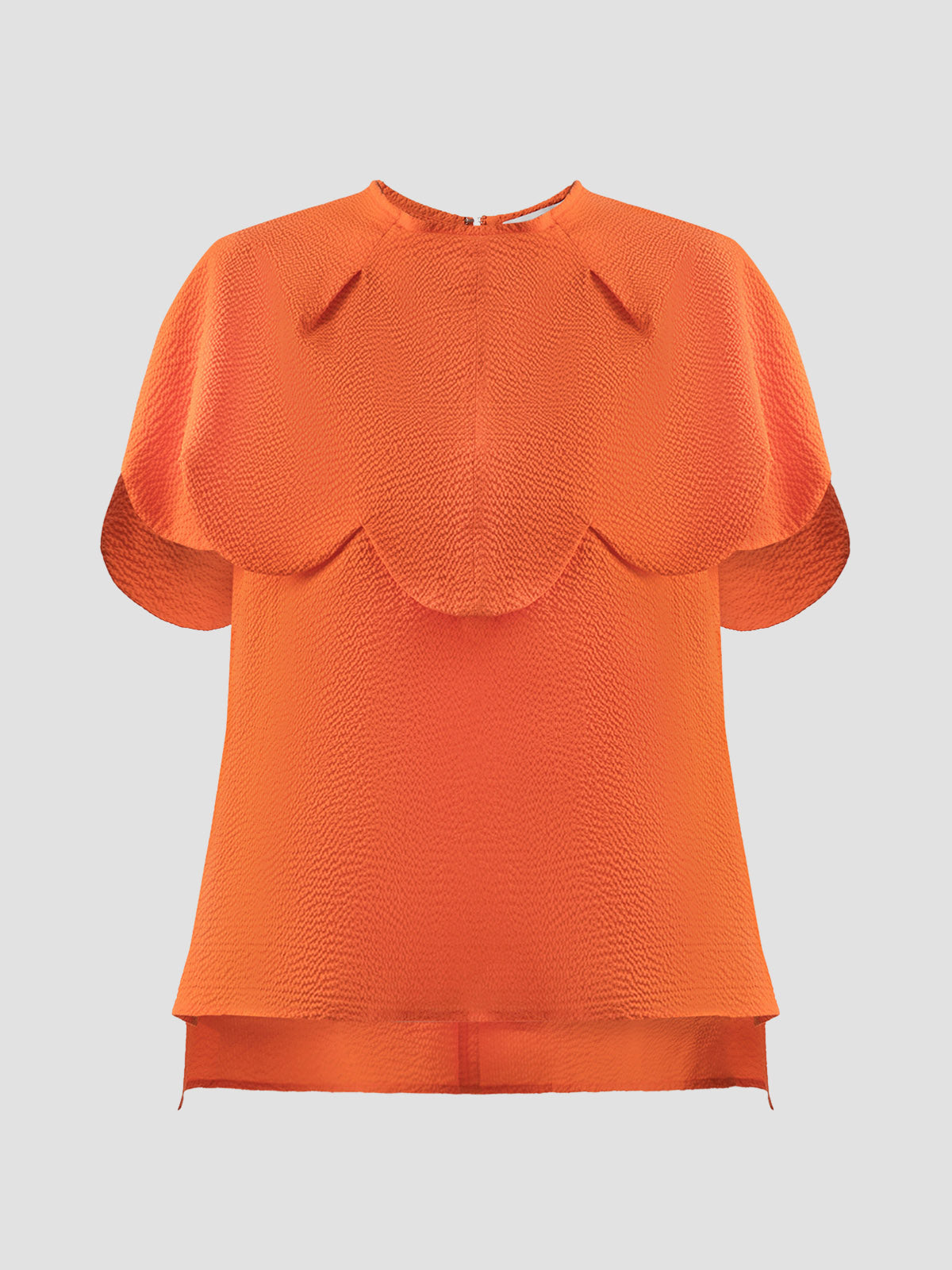 The short sleeve blouse with a back zipper opening comes in vibrant orange. Its round neat collar is detailed with an extended scallop lapel that goes around the upper part of the blouse.
