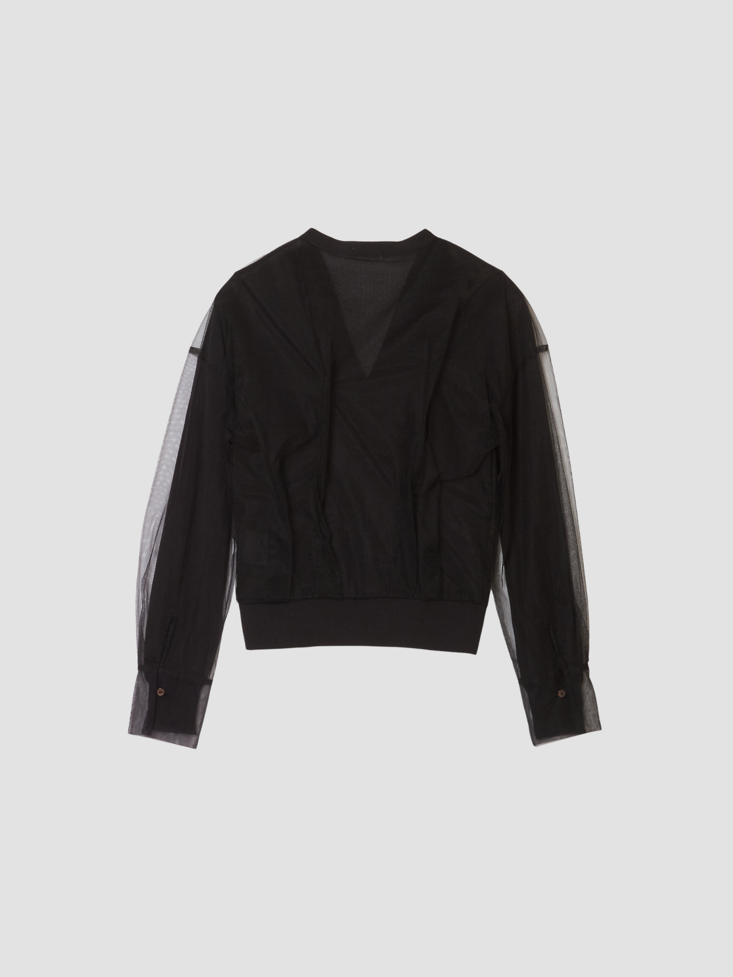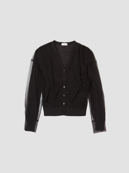 A signature Chika Kisada design, this knit cardigan is a study in texture and volume. Soft, cozy knit is layered with airy tulle, with voluminous sleeves that creates a silhouette that feels both structured and fluid.