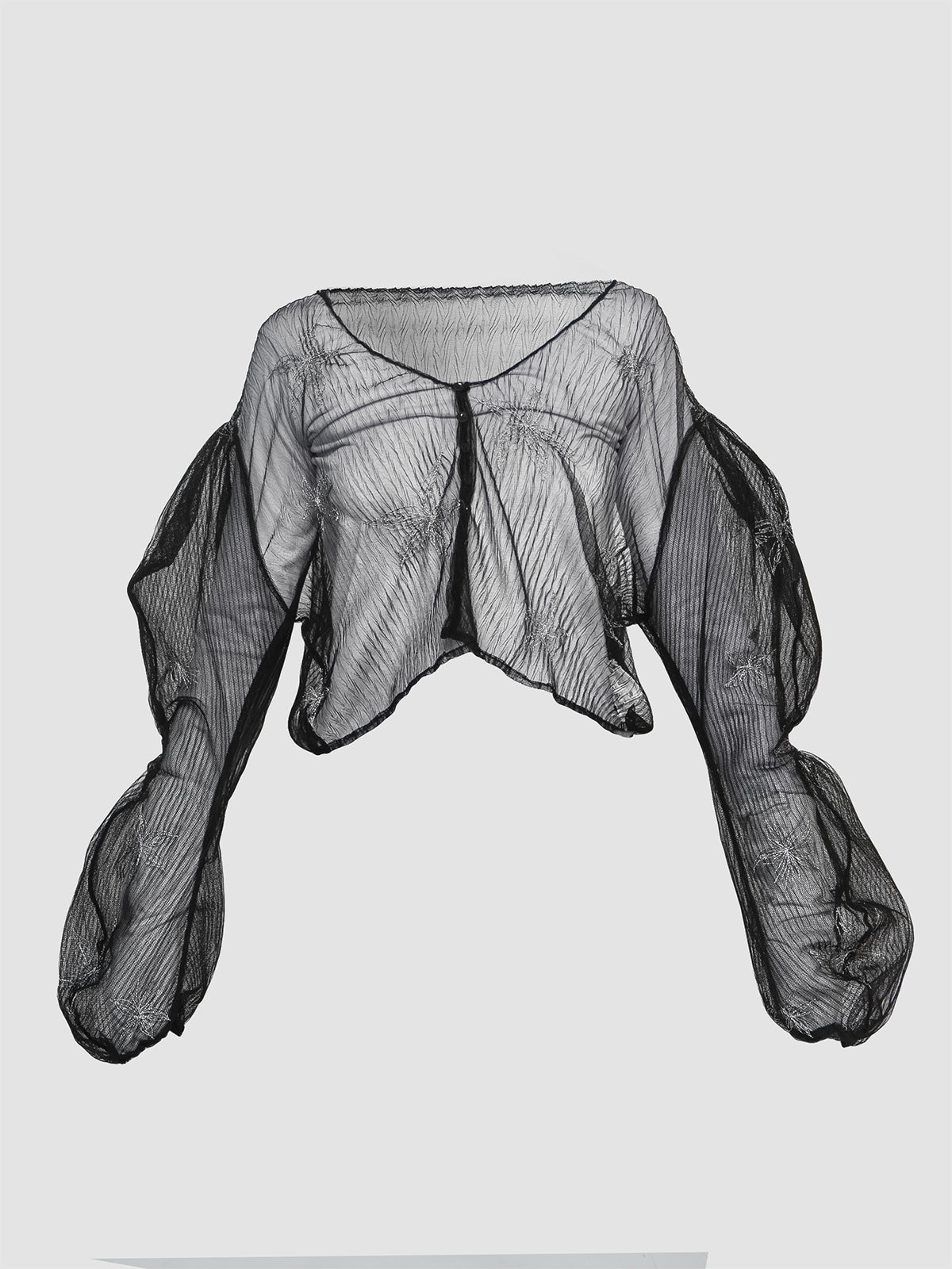 Black with Silver Embroidery Sheer Gorden Structured Puffed Sleeve Top