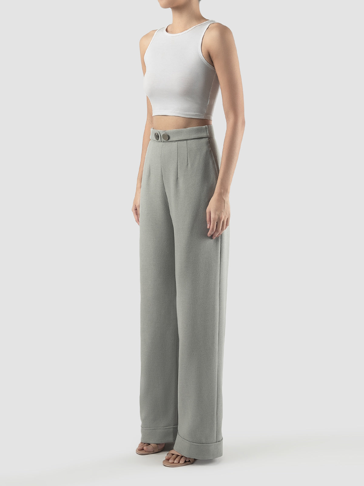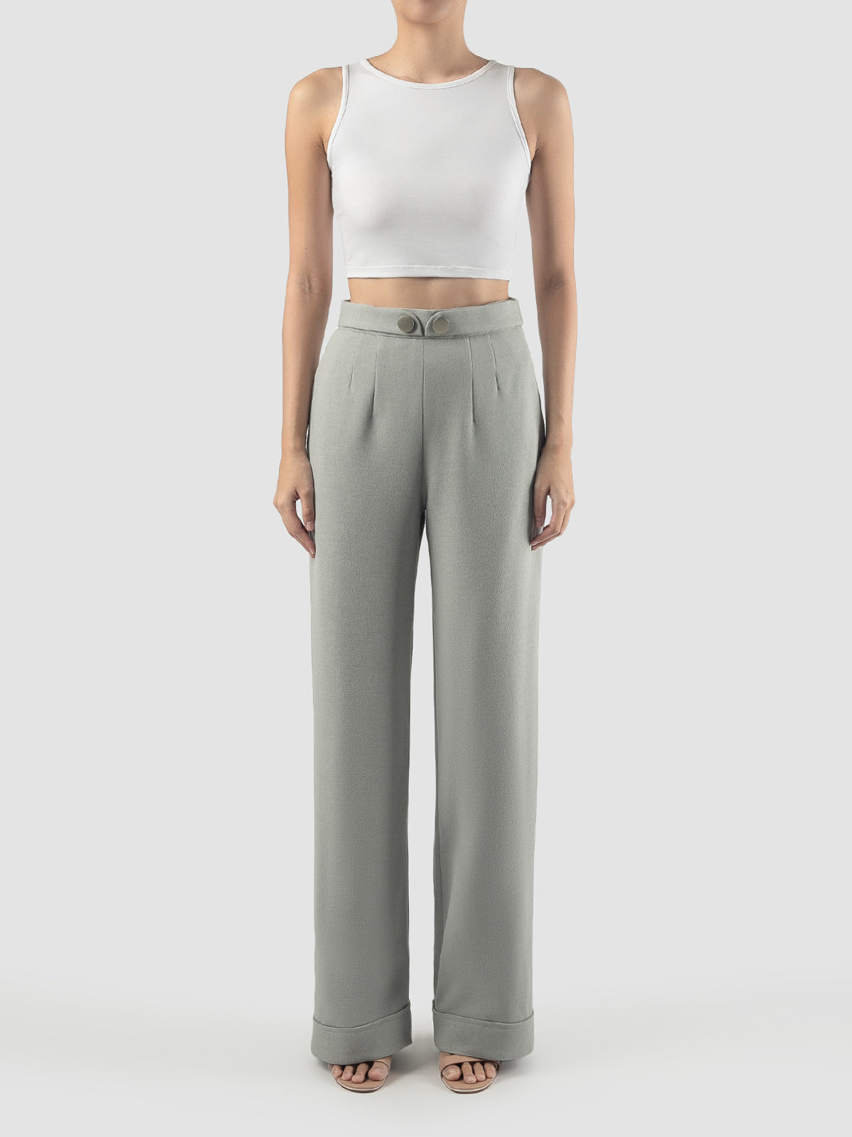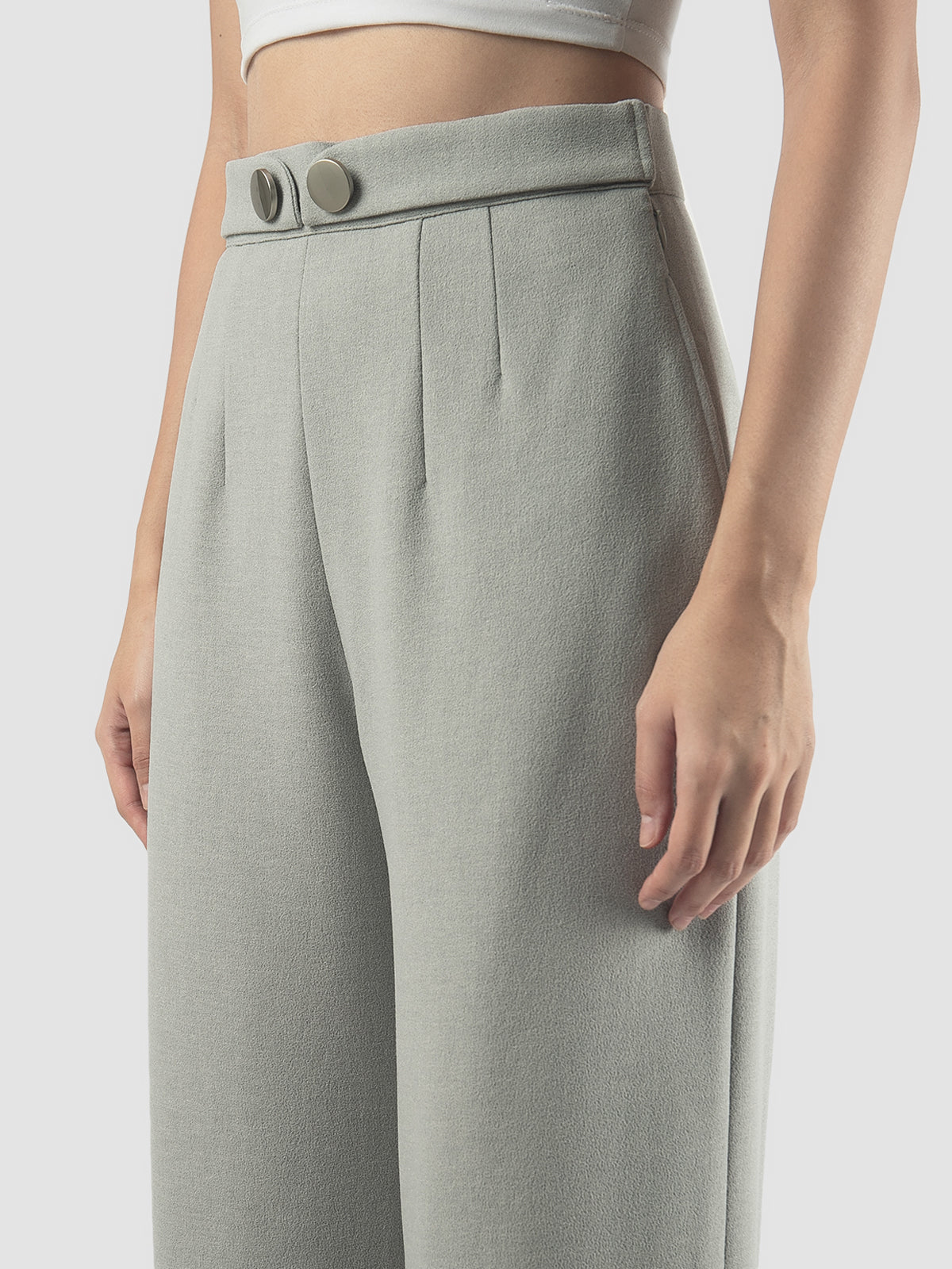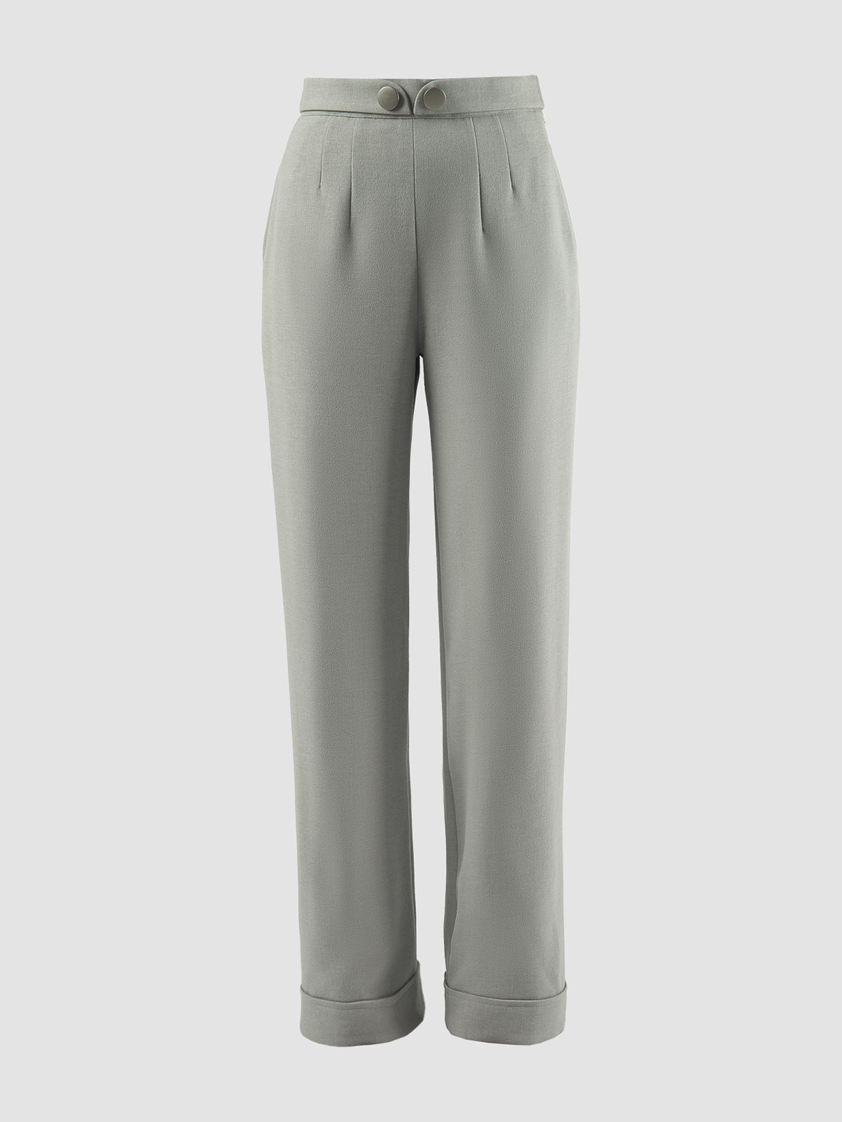 These straight-leg trousers feature a sleek design adorned with double metal buttons at the front, adding a touch of understated elegance.