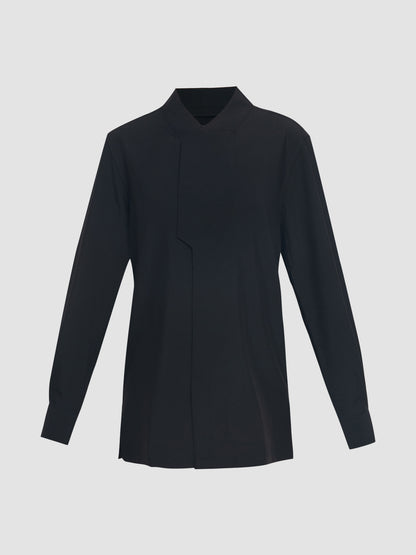 A long-sleeved slim-fit shirt featuring a collarless high neck and side slits.