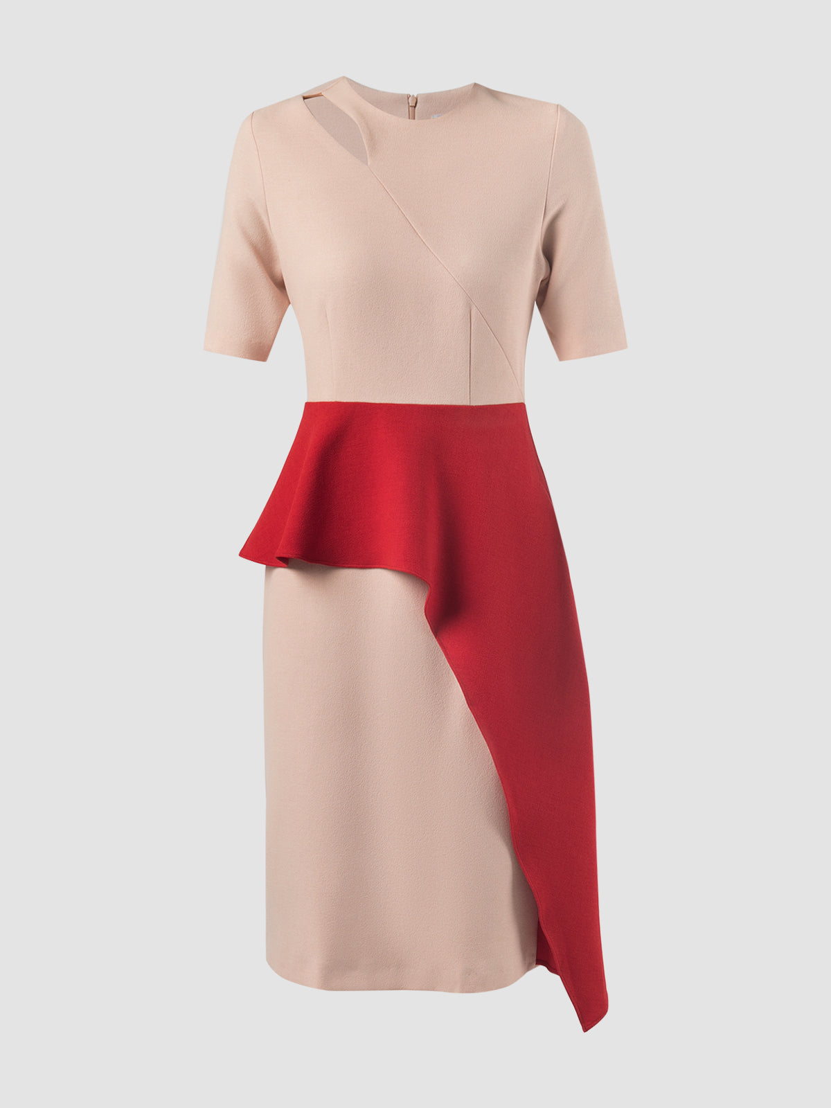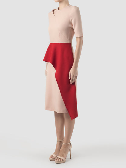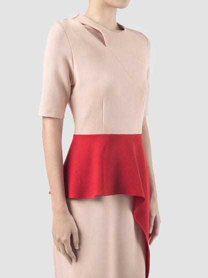 Turn heads in this stunning blush pink dress with a bold red peplum accent that cascades dramatically down the front, while the shorter panel adds a touch of flair all the way to the back yet stops midway for a further twist.