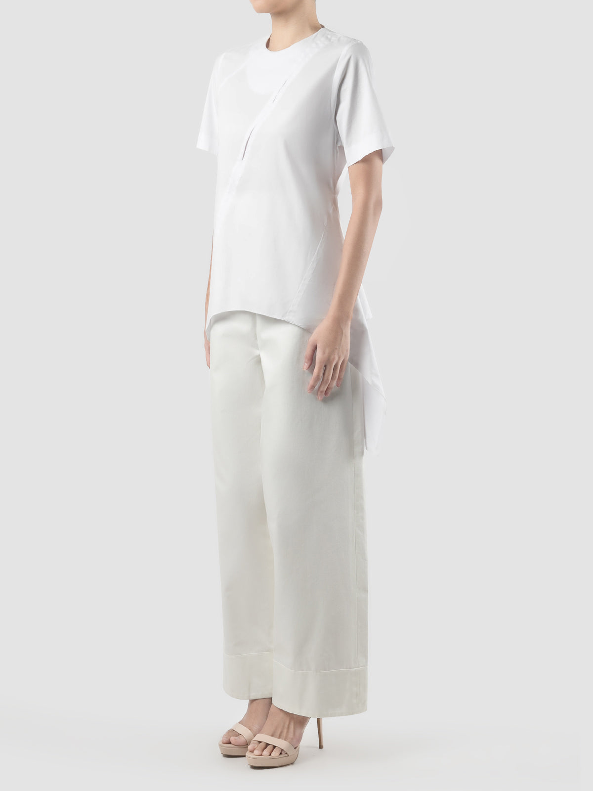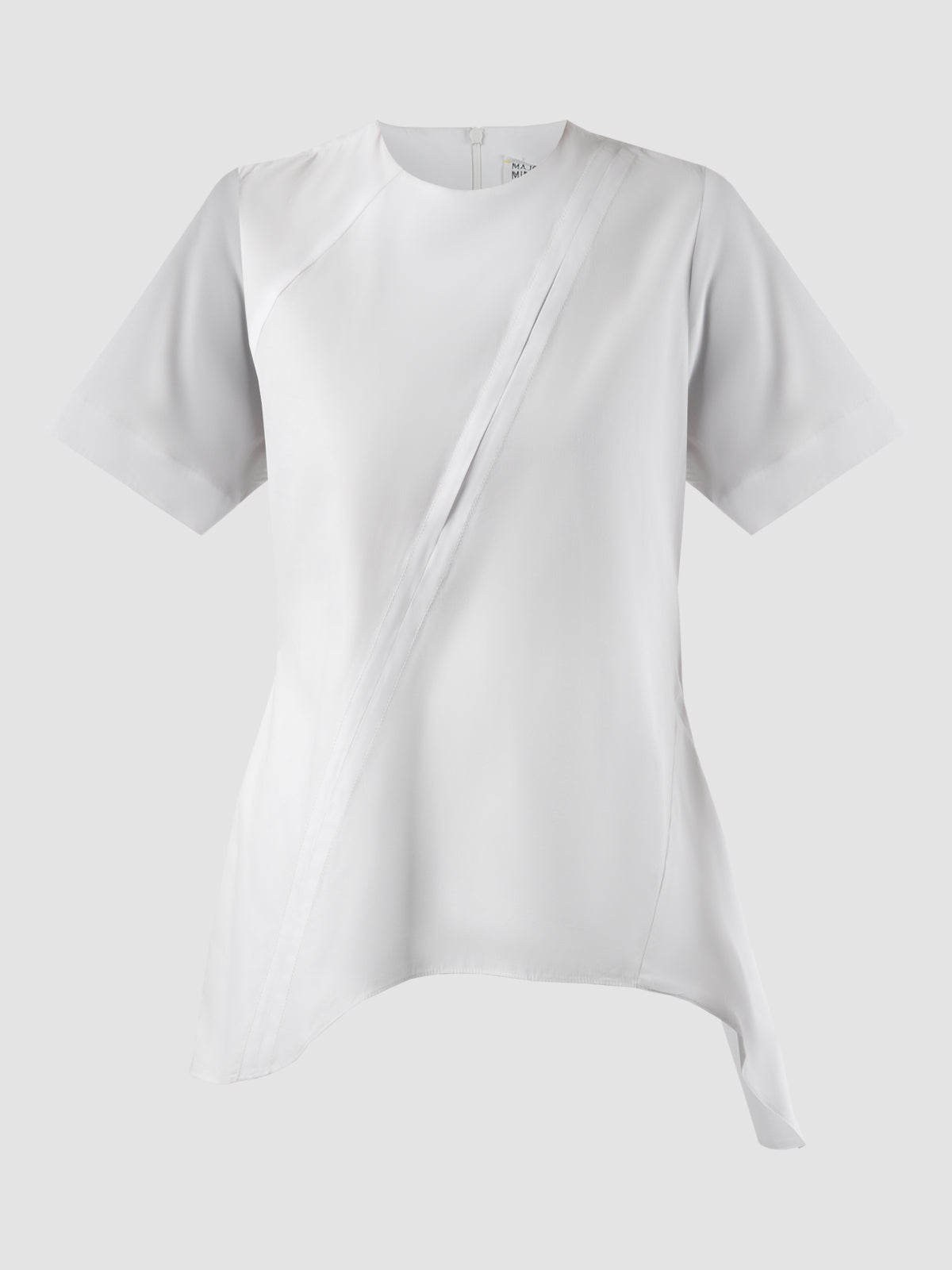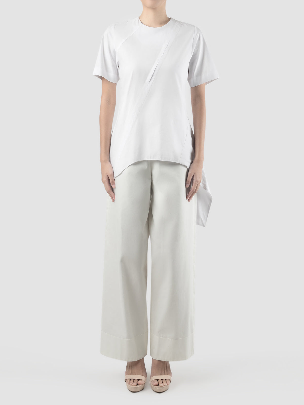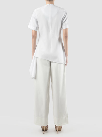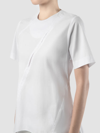 Elevate your casual stroll with this chic white blouse featuring a round collar, a raglan-look short sleeve on one side, and a regular tapered short sleeve on the other.