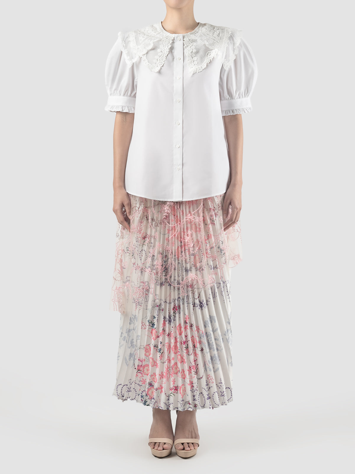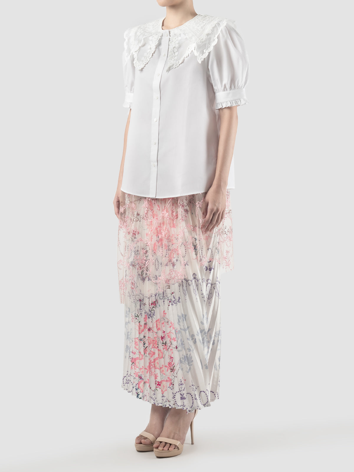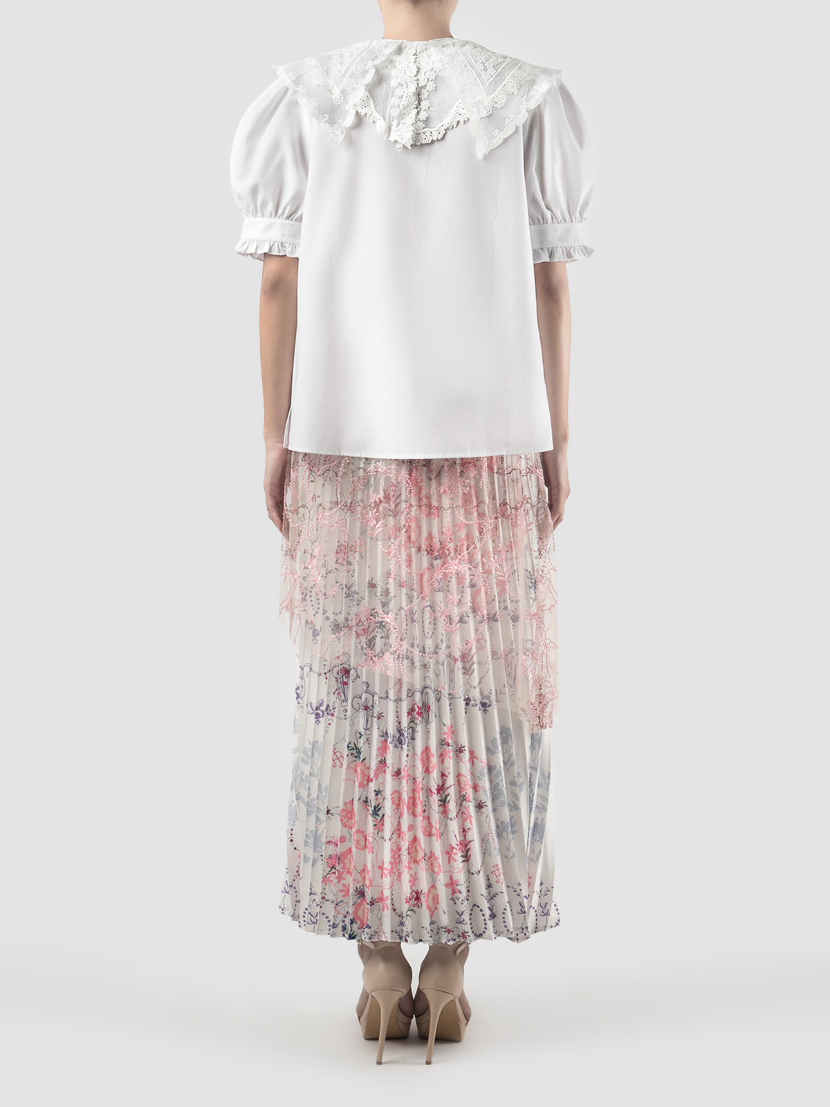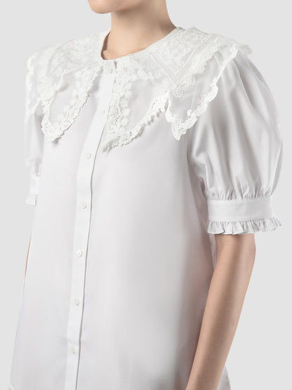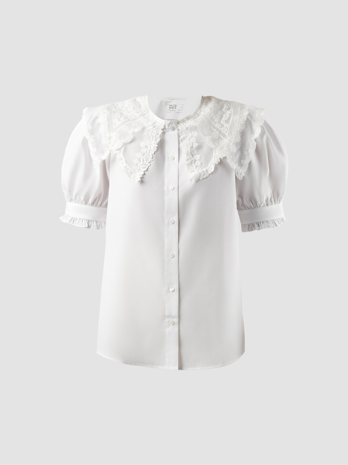 This beautiful blouse features a double-layered Puritan collar from delicate lace, adding a feminine touch to the design.