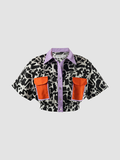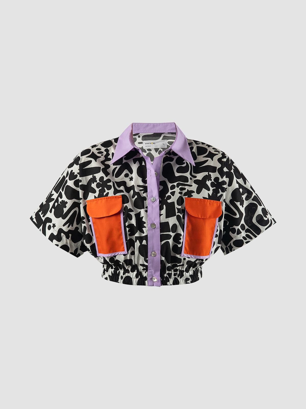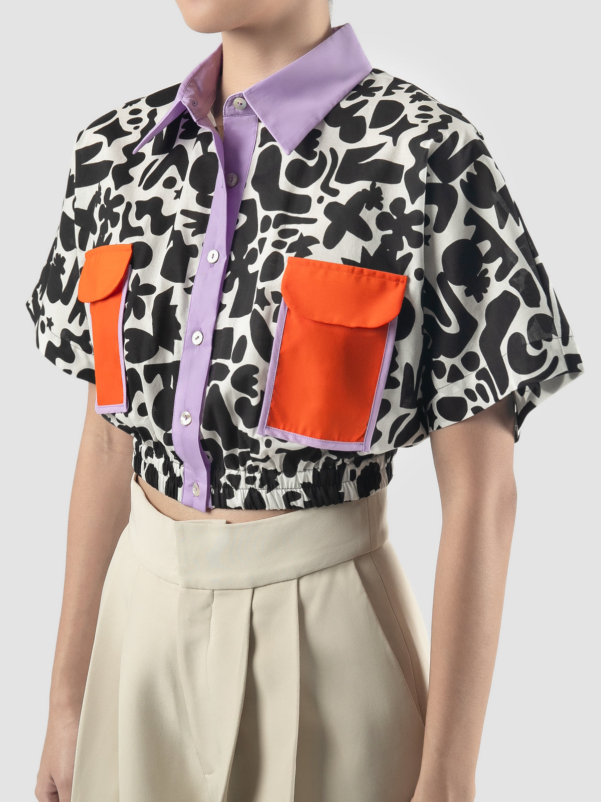 The black and white doodle pattern adds a lively element as it meets the contrasting red flapped patch pockets with lilac lining.