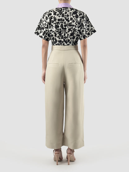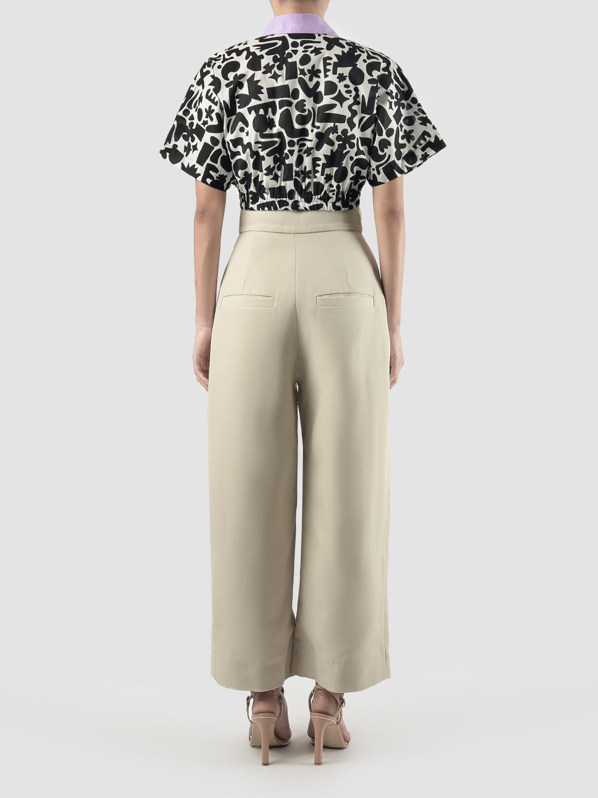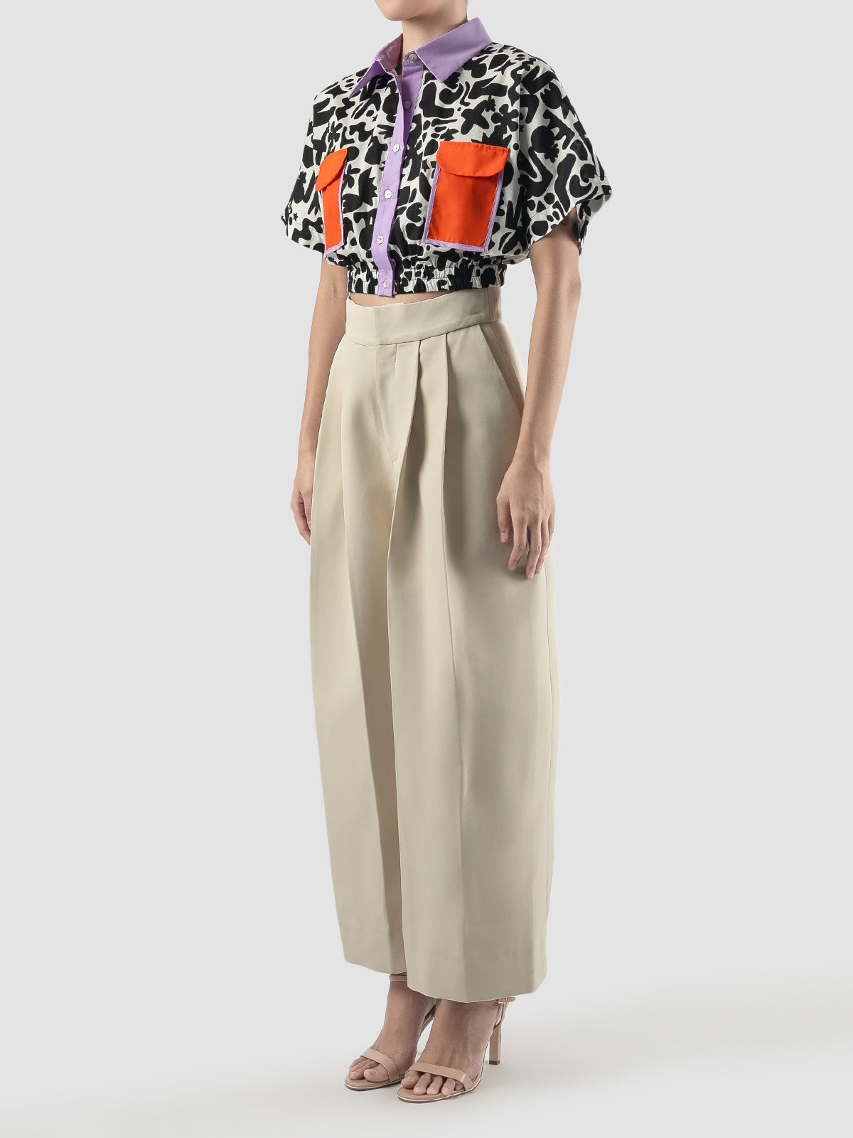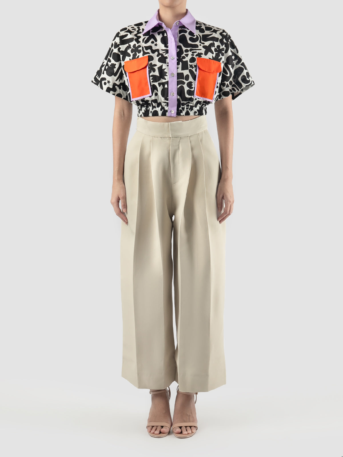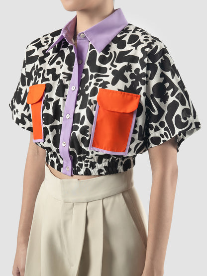 This short-sleeved cropped shirt features a ruched waist for a flattering figure.