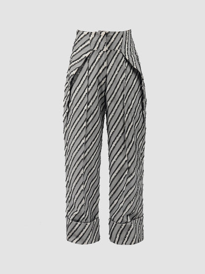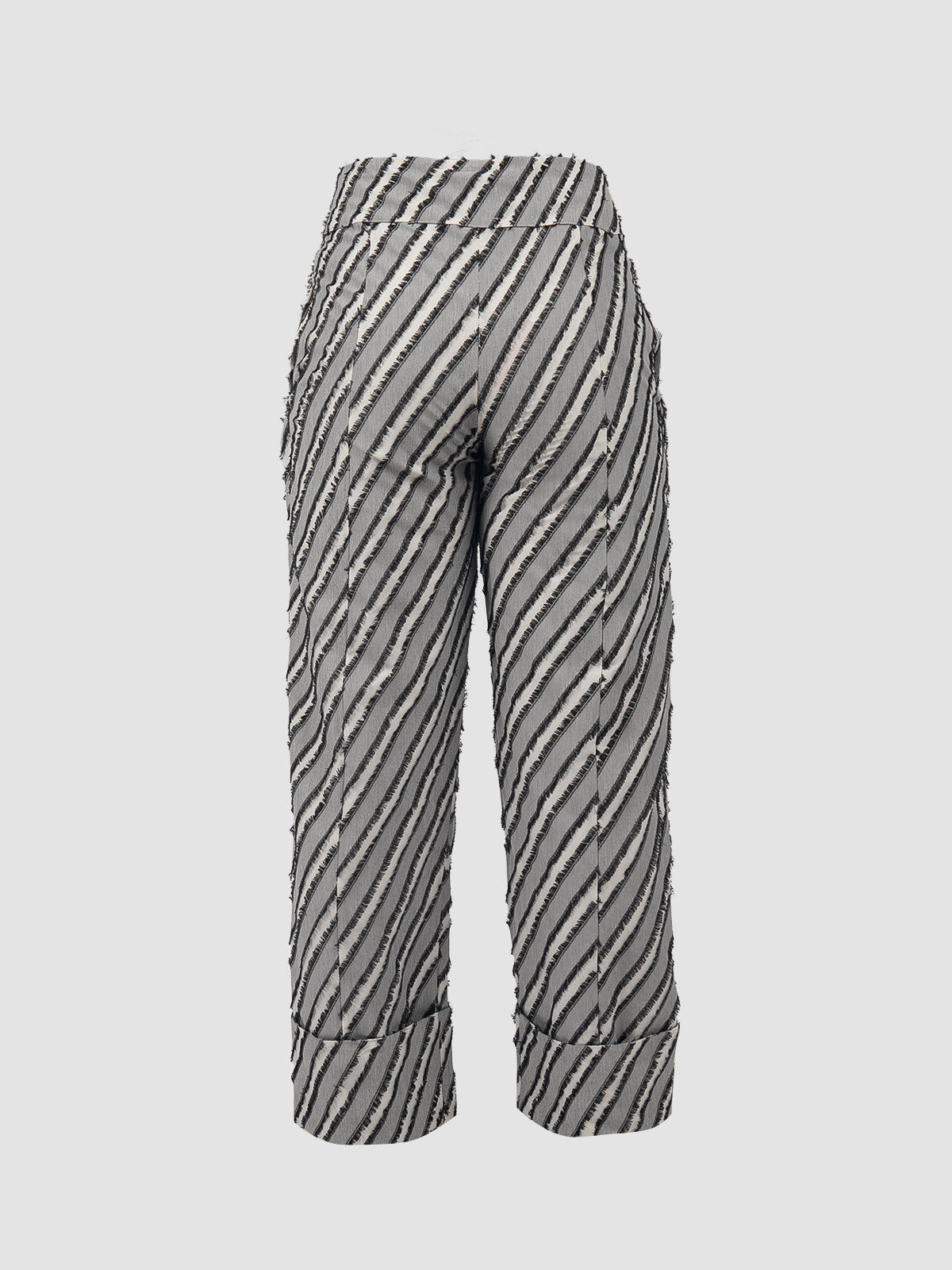 These jacquard textured trousers have a structured, all-over design that creates a timeless silhouette with a modern twist. The sharp pleats at the waist and cuffed hem add sophisticated details, while the zip-up front and practical side pockets make them a functional choice.