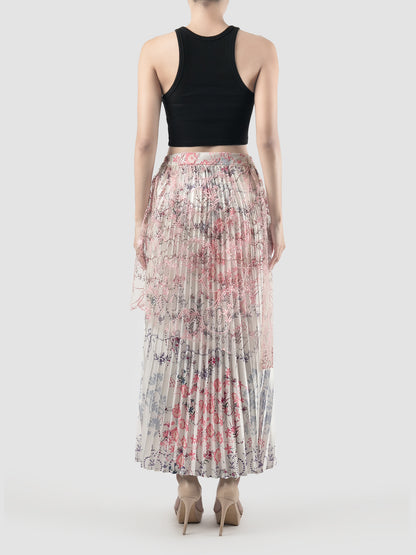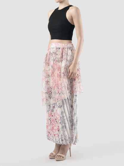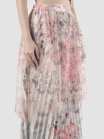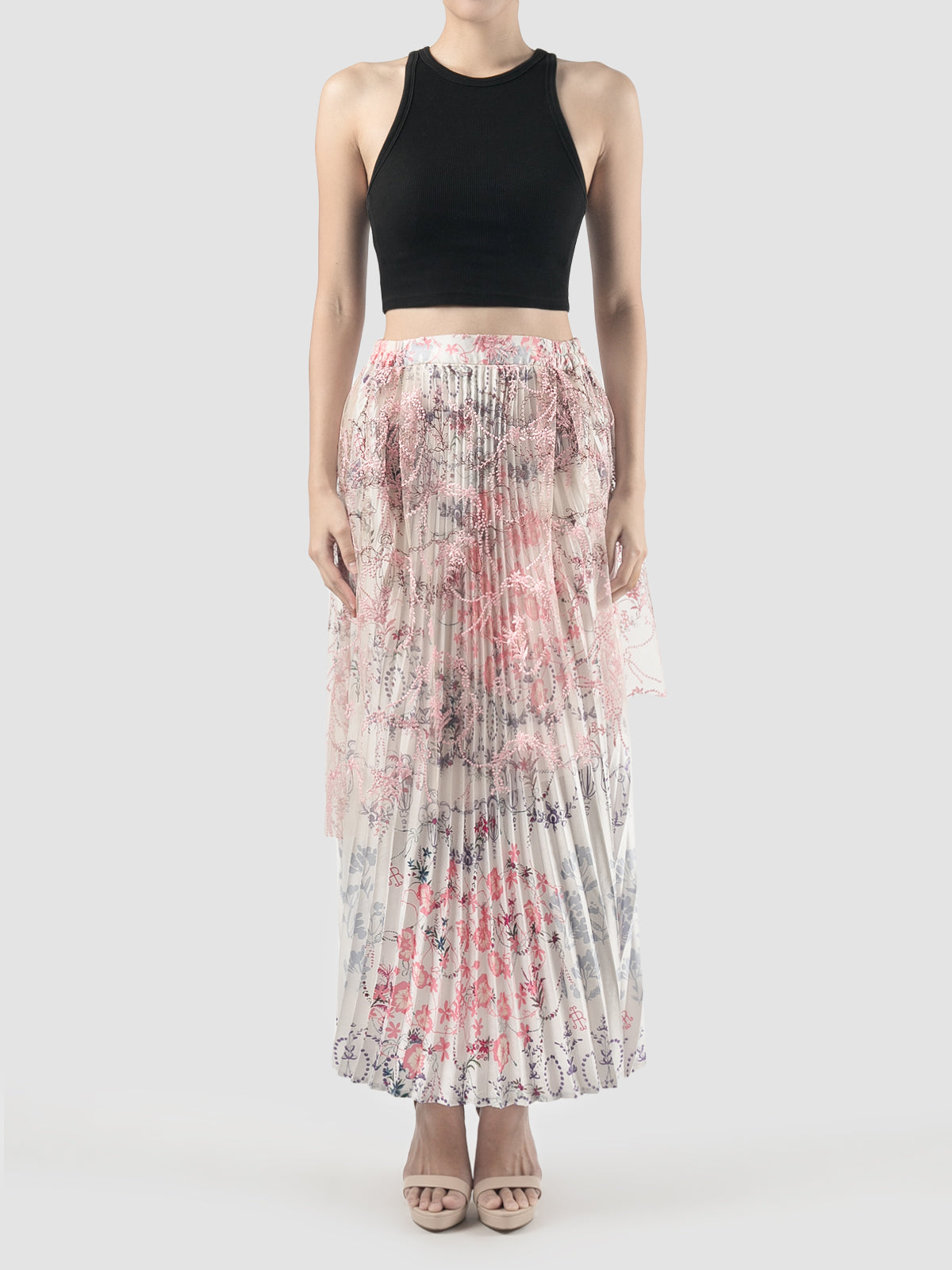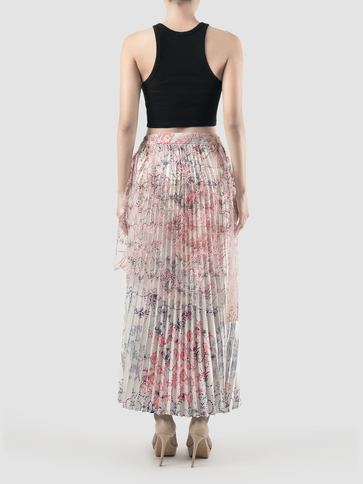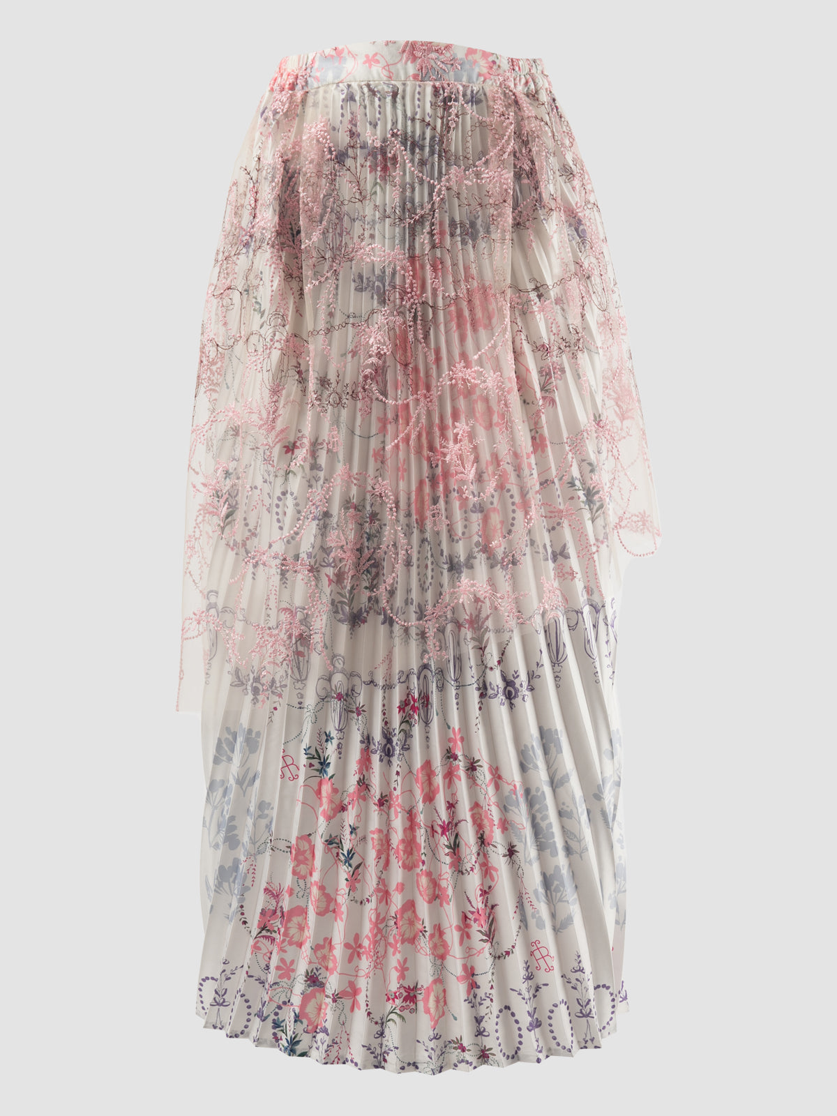 This intricately layered skirt features a combination of embroidery lace and sateen printed pleats.