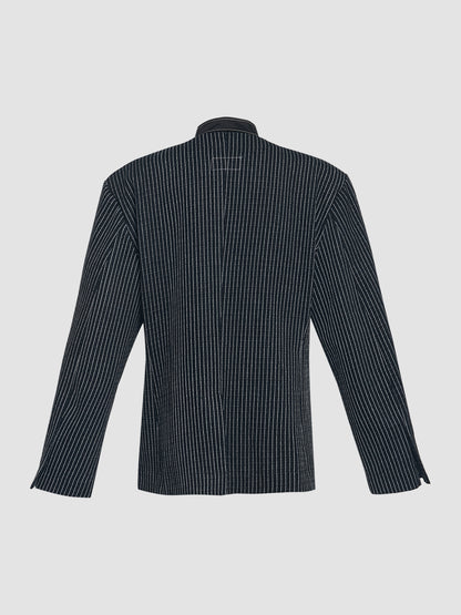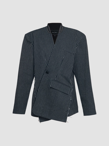 A double-breasted blazer crafted from denim with a pinstripe pattern, featuring a side slit with unfinished details.