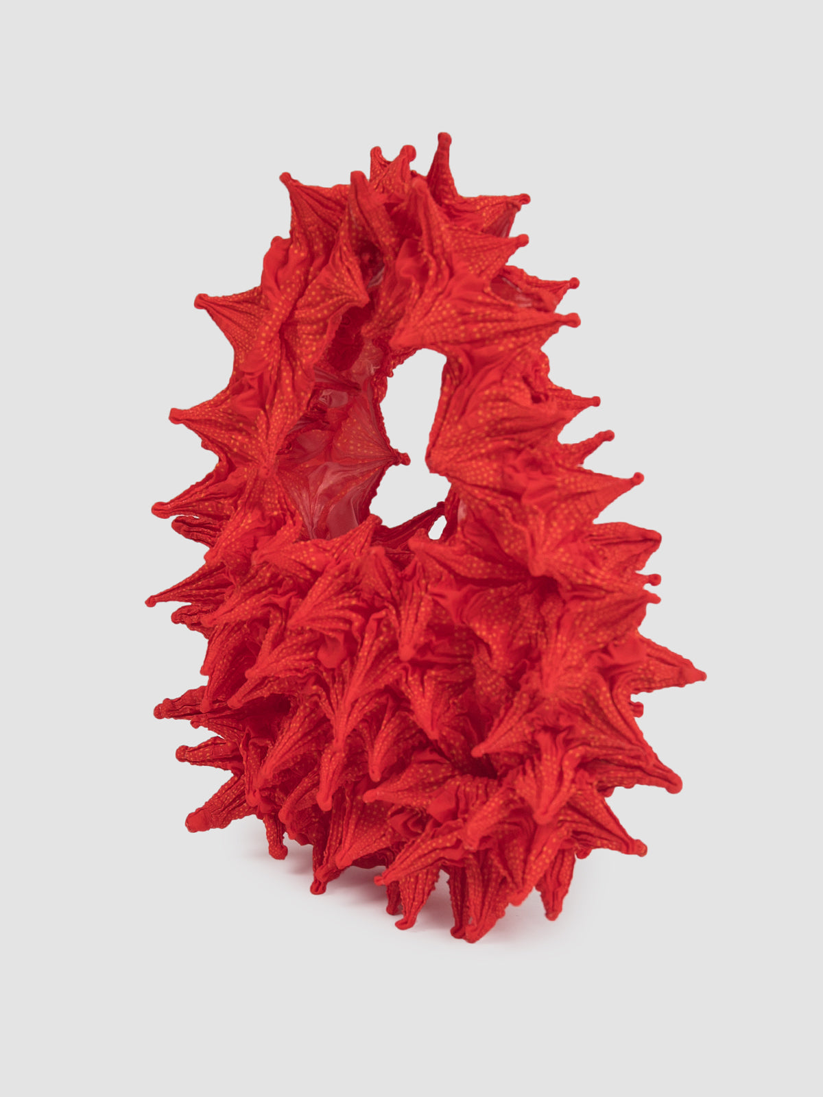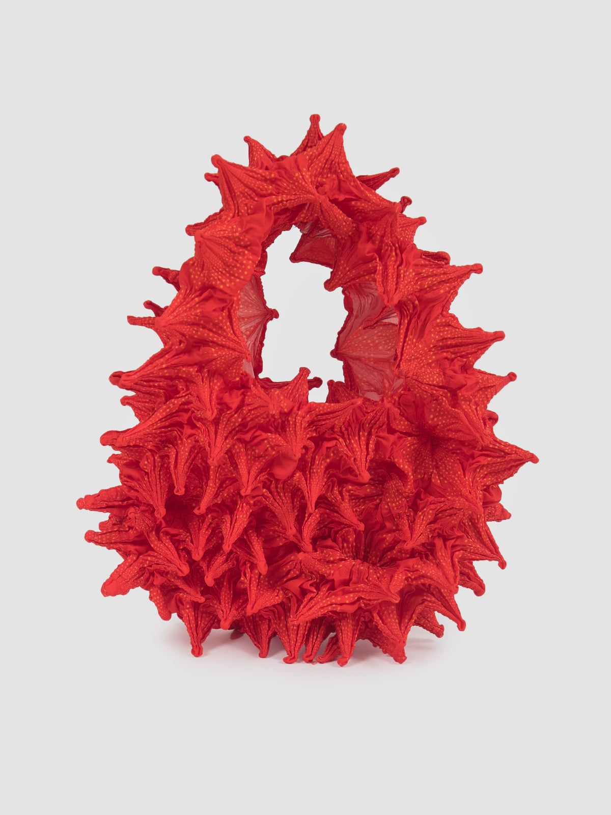 Colored with the shibori technique, the bag also stands out with the spikey texture that comes from fabric manipulation. The 32x38 cm bag shrinks to 13x17 cm when emptied.