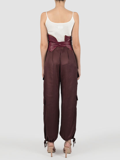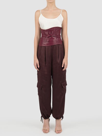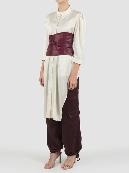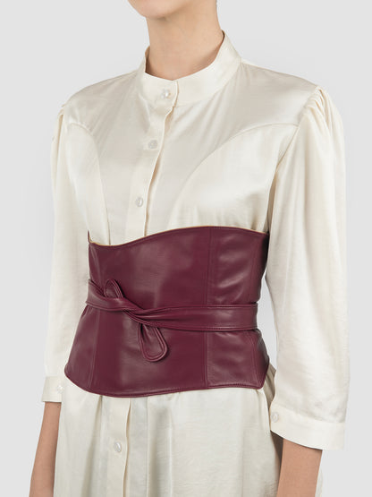 Made from genuine leather, Gia is an obi-style belt with a smaller sash accent that allows the wearer to adjust its size freely. Its wavy asymmetrical front design adds to its slightly stiff structure while its back features a wide opening to allow more movements.