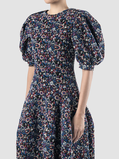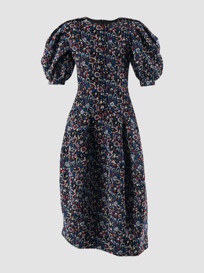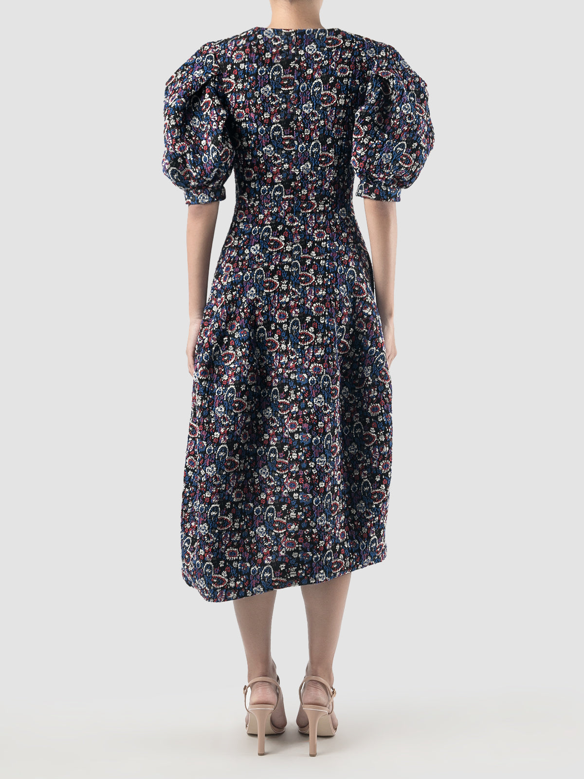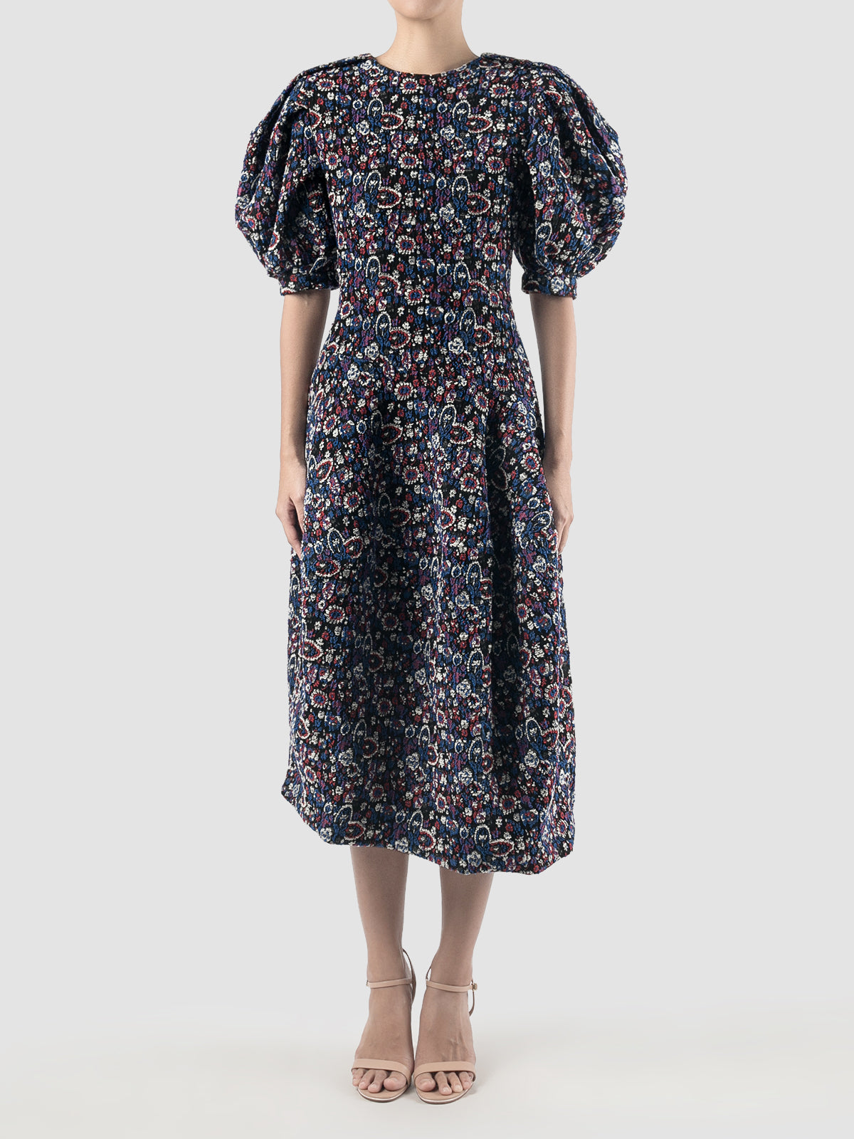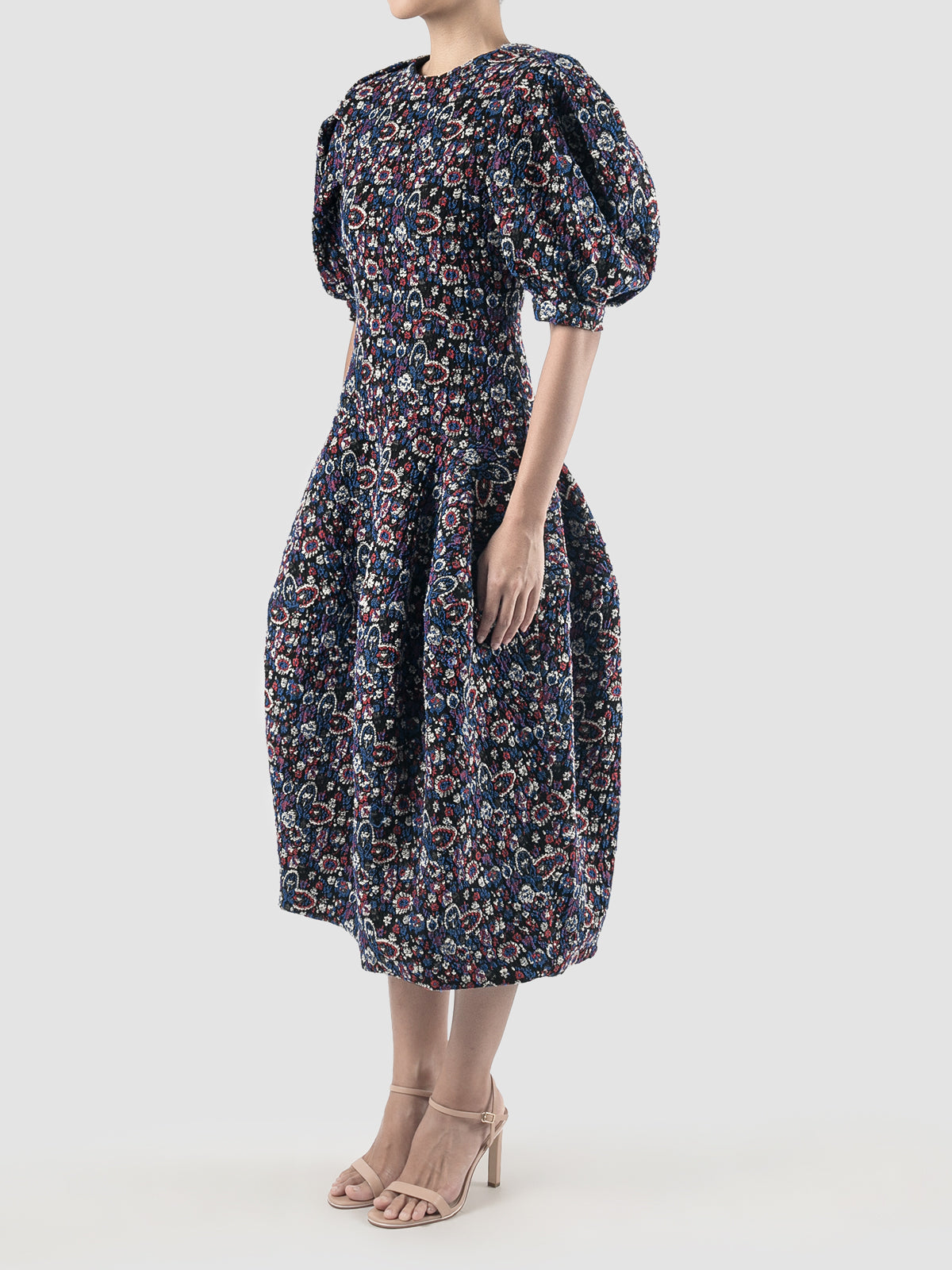 Cobalt blue jacquard midi dress with pouffe sleeves