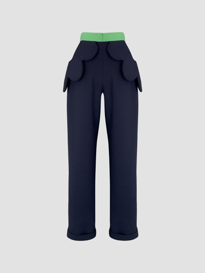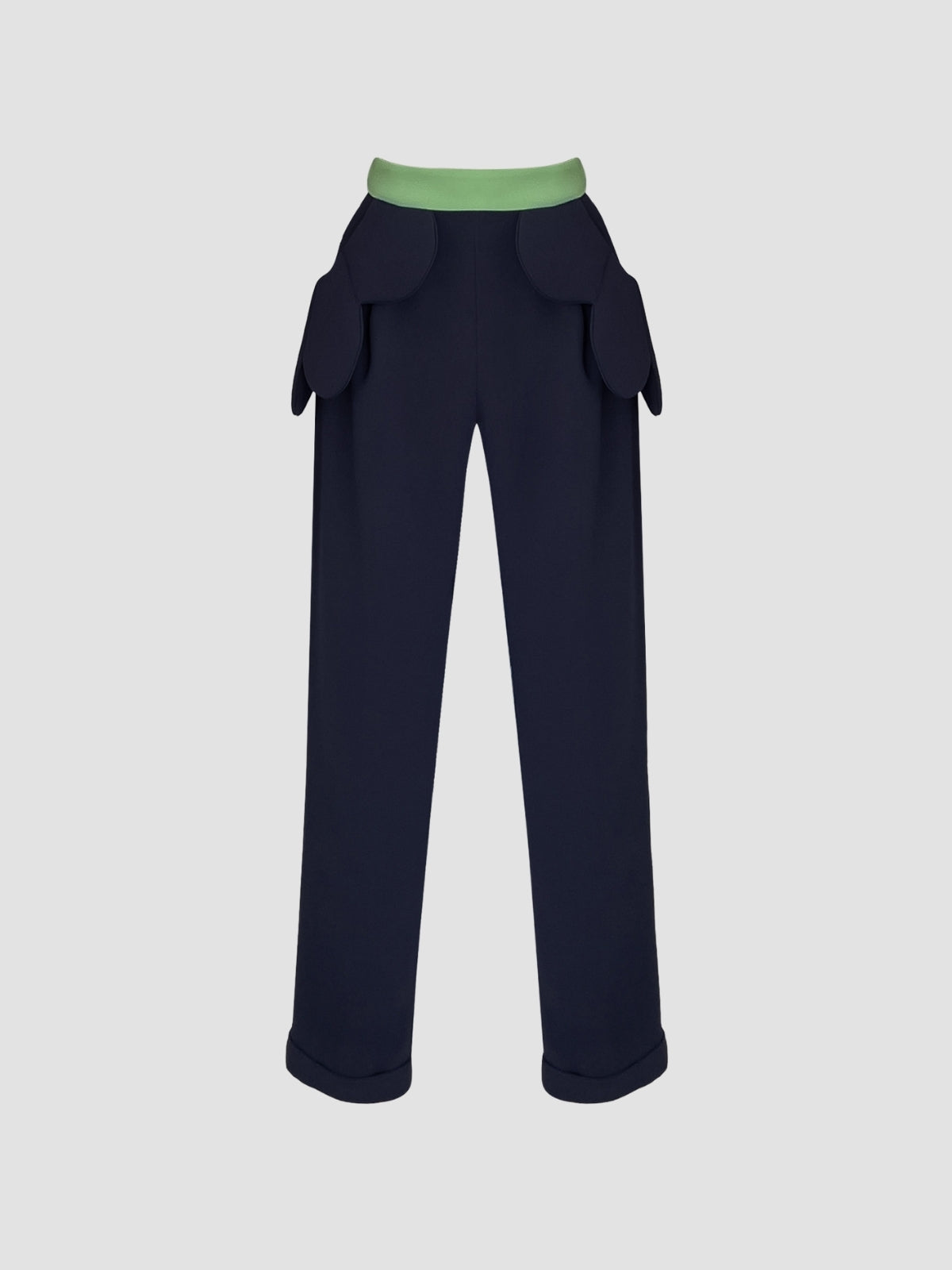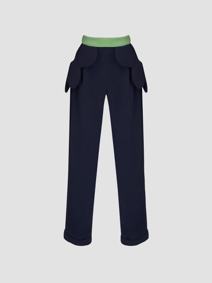 These sleek two-toned straight pants feature a contrasting waistband in vibrant Olivine green.