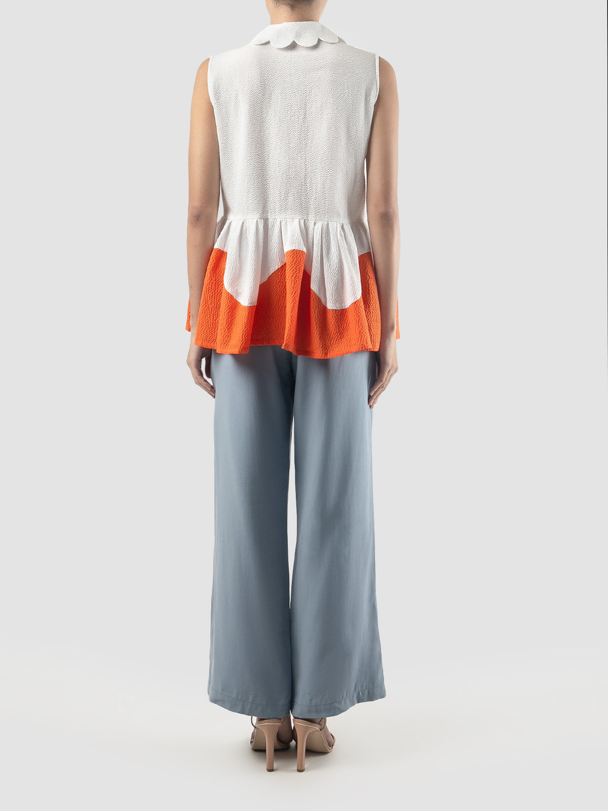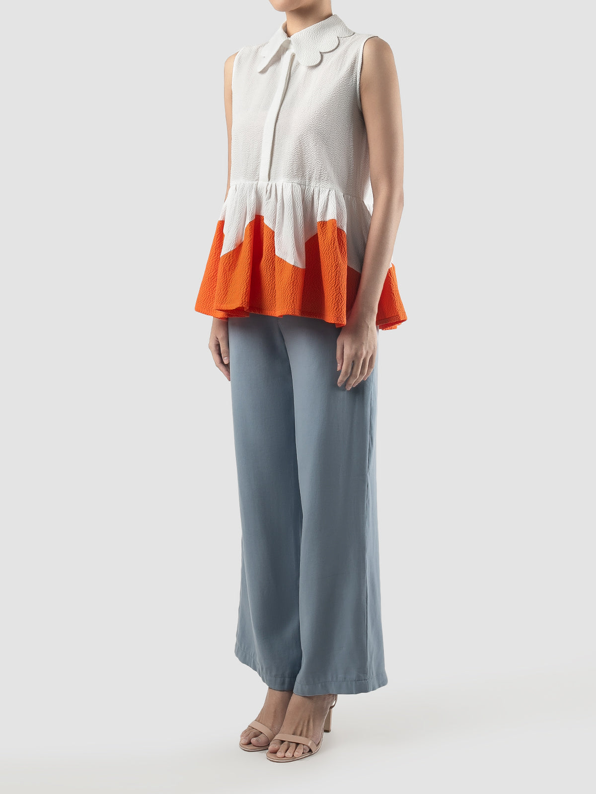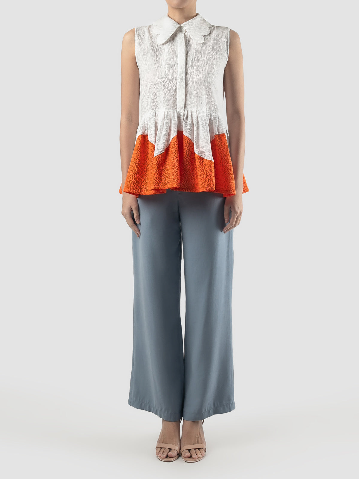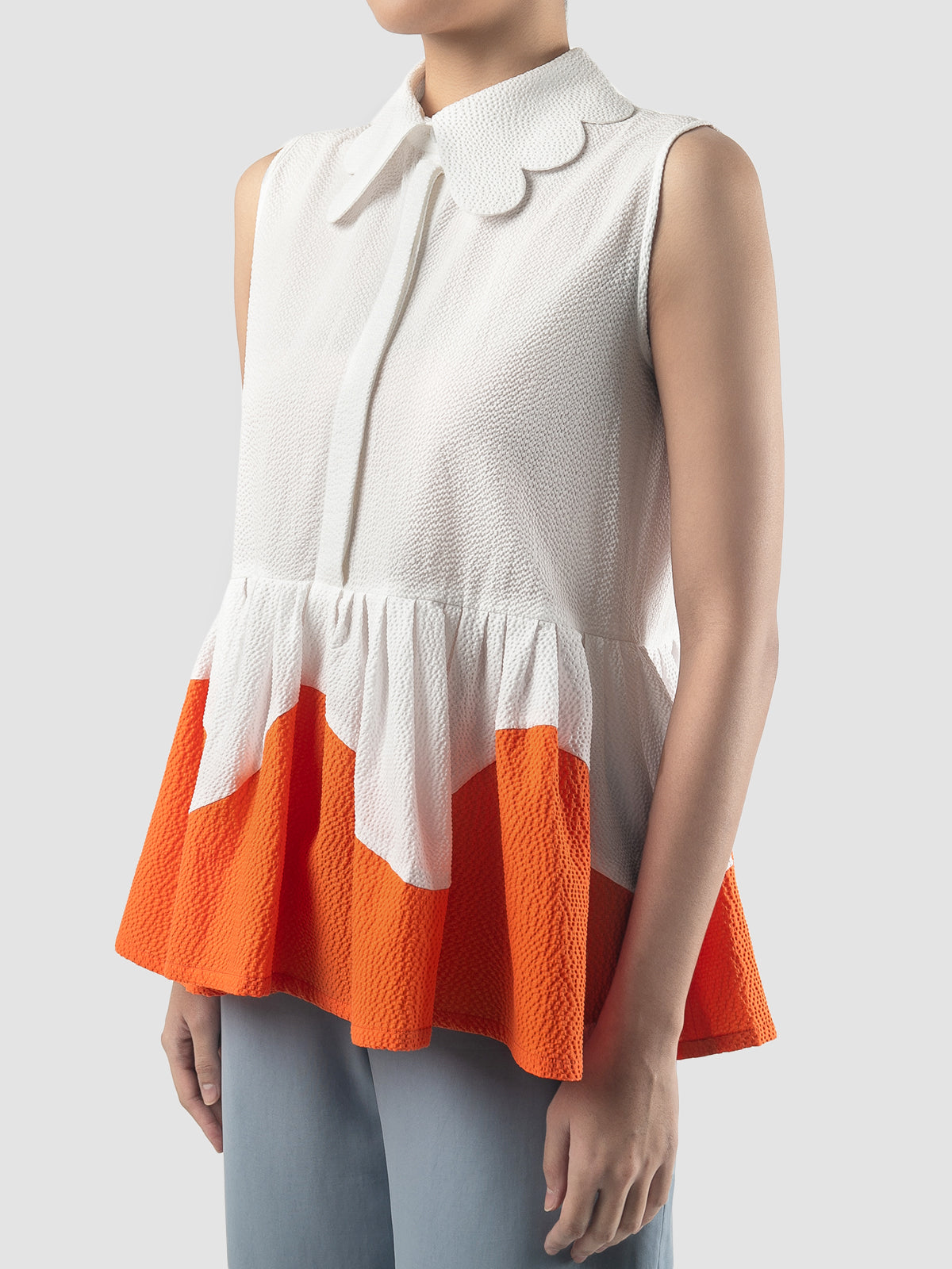 The two-toned design further accentuates the dynamic silhouette with an asymmetrical flaring hem.