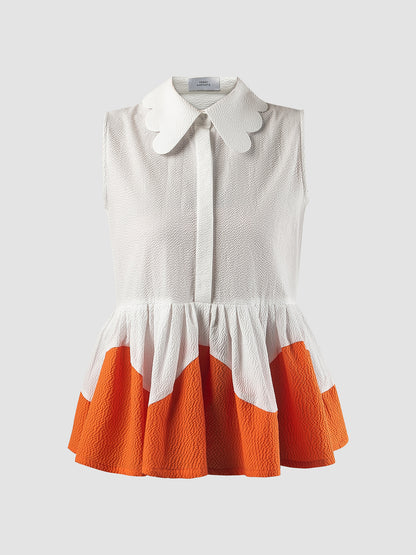This sleeveless shirt features a concealed front button opening for a polished look and a classic scalloped neckline.