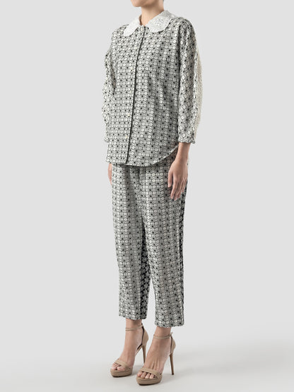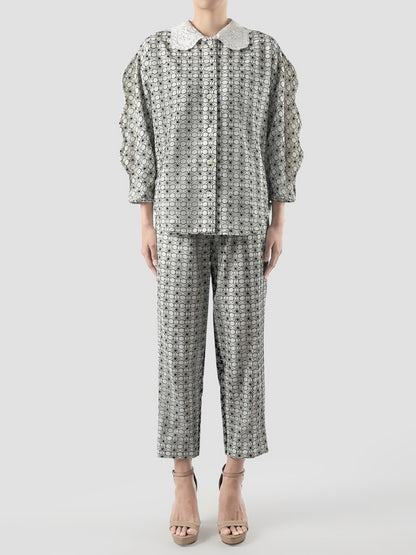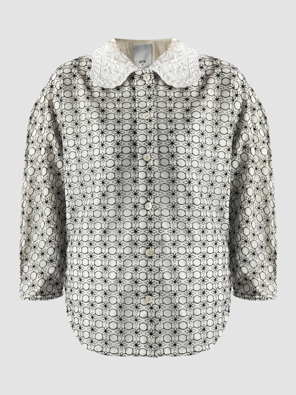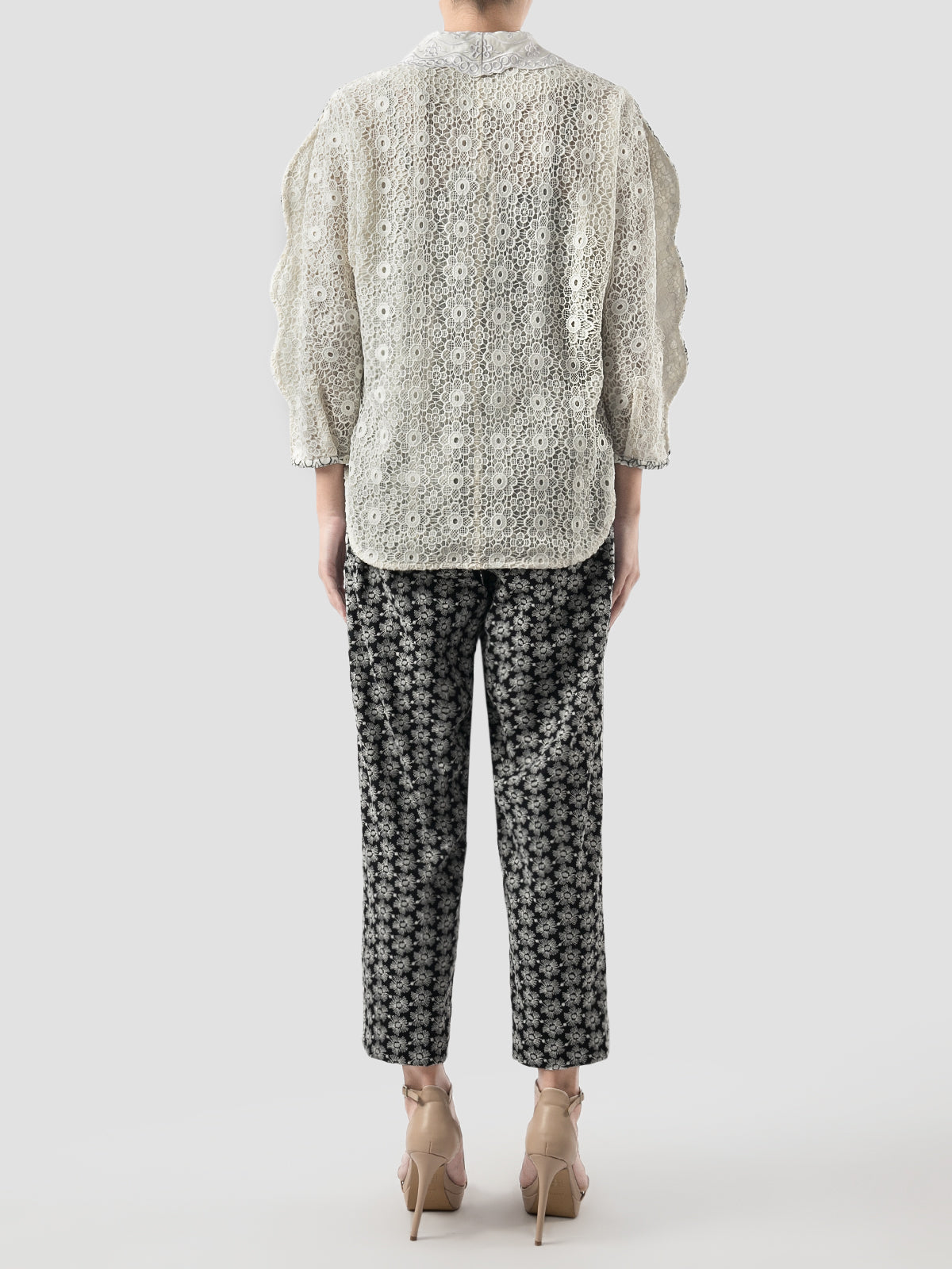 The lace shirt features wrist-length peasant long sleeves and a rounded embroidered collar with front button opening and rounded hem.
