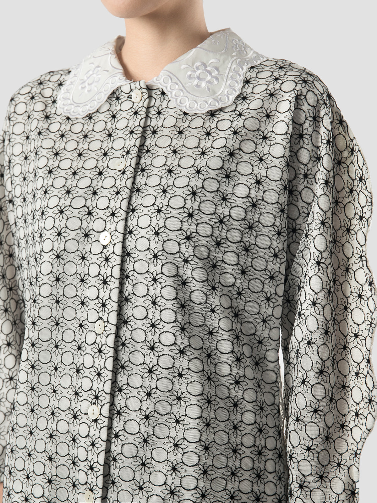 Material: Embroidered tulle, cotton voile lining, poly-cotton collar