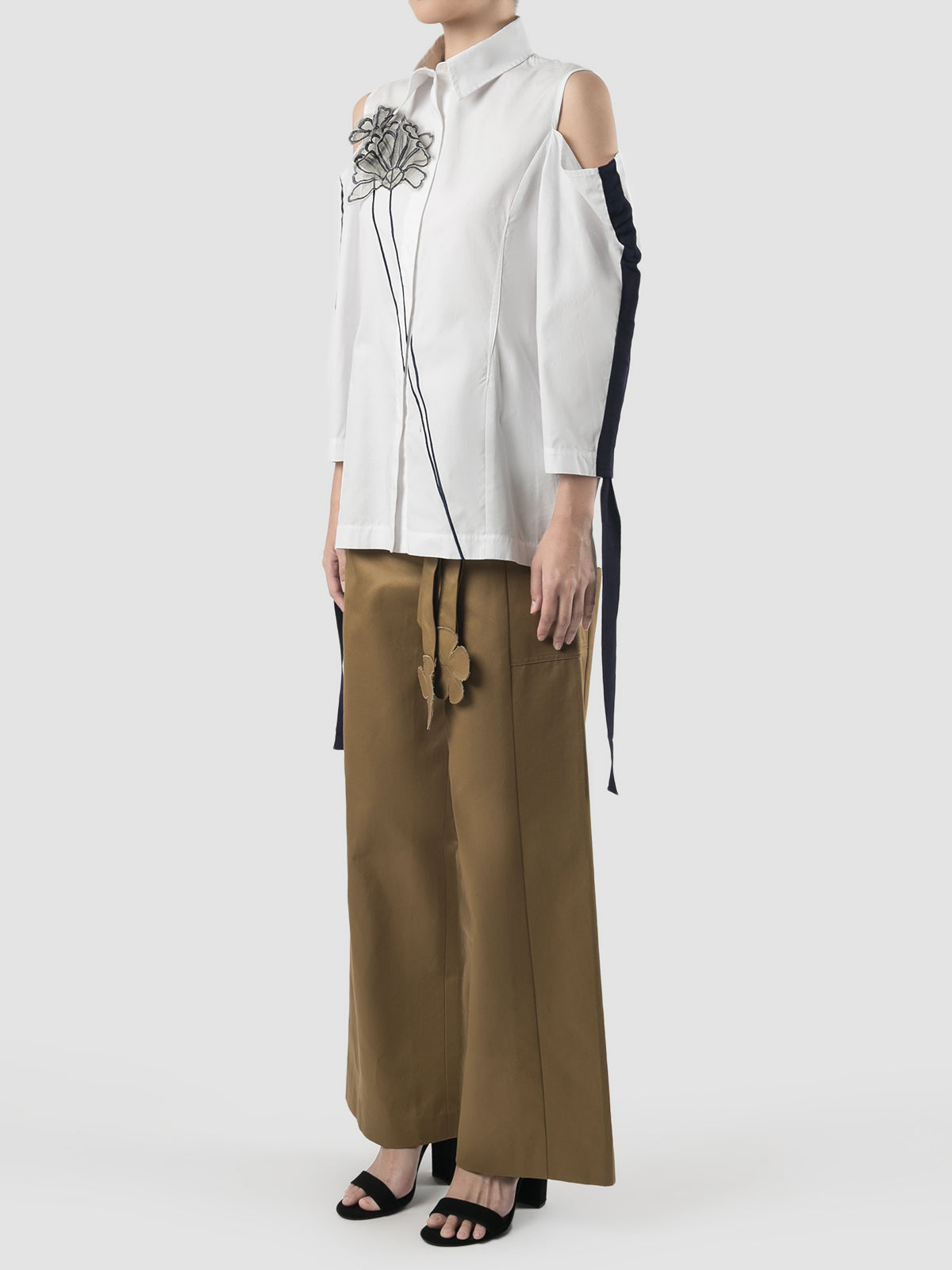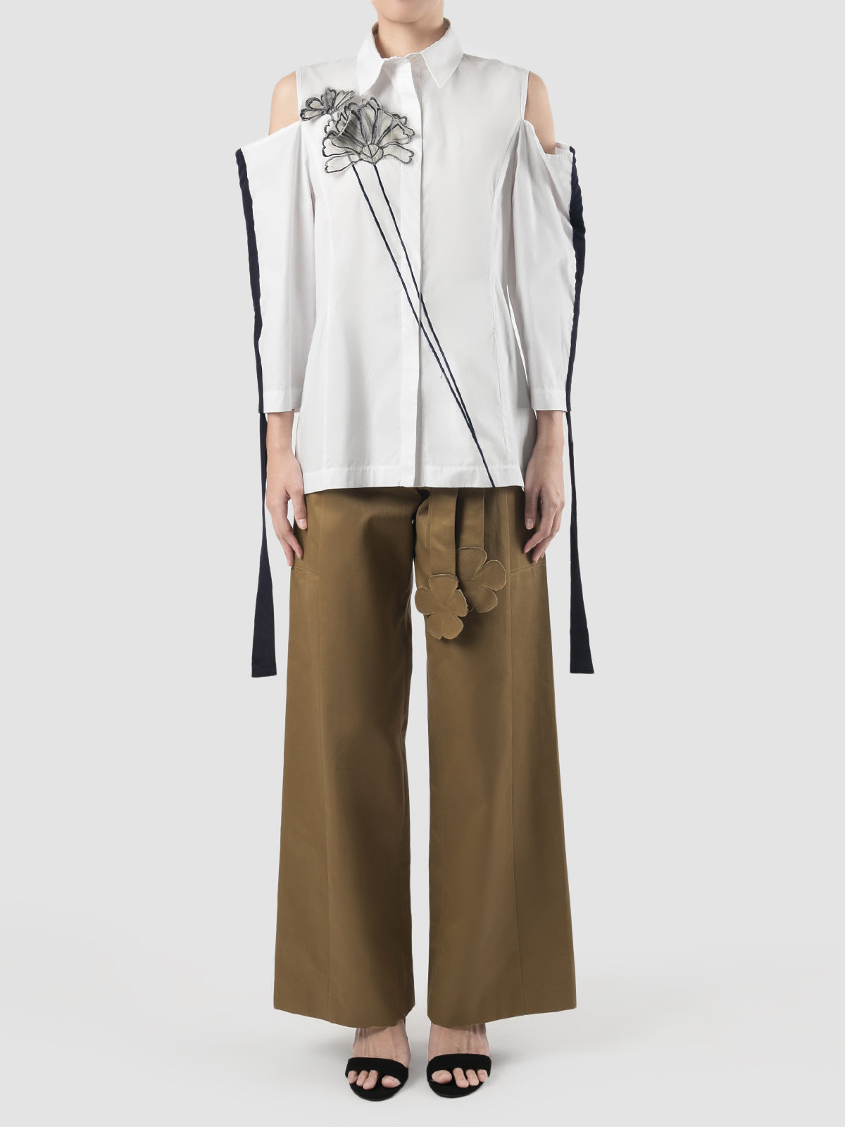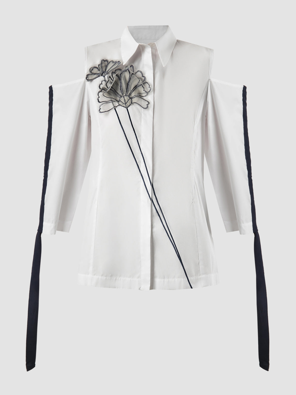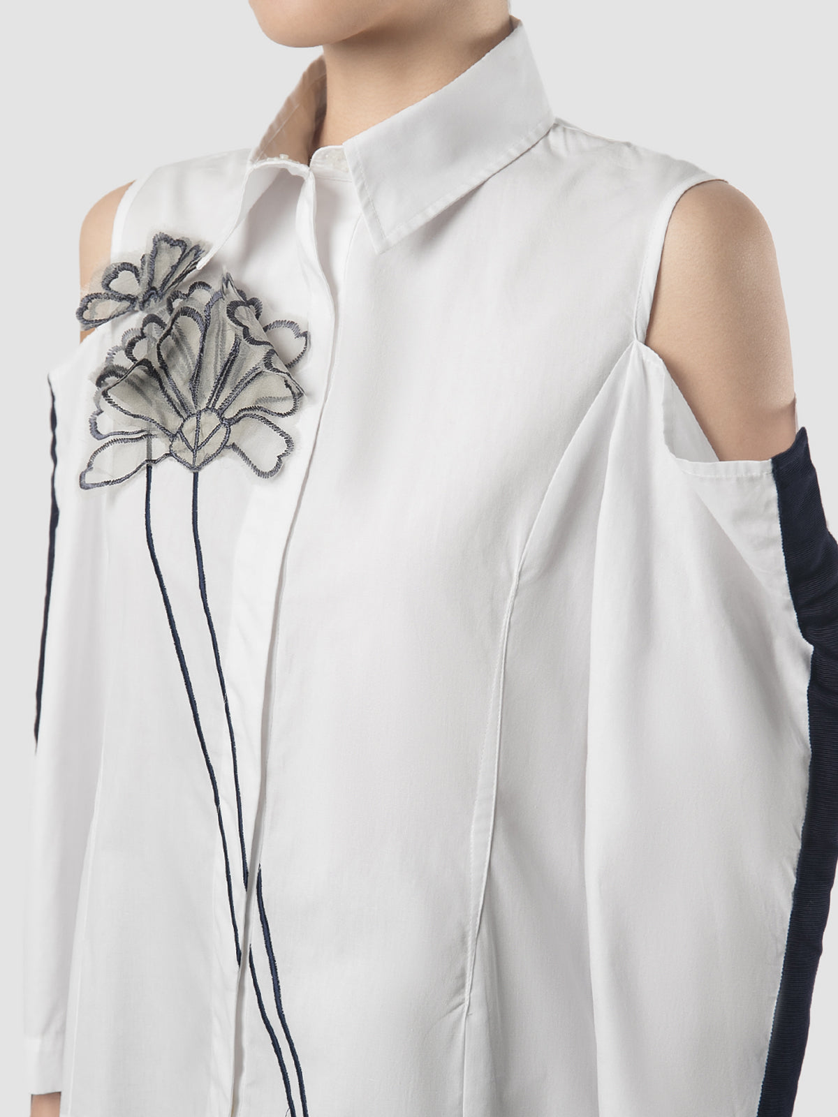 The Maiko is a versatile white shirt that features hand-embroidered 3D grey flowers with navy stalks crossing diagonally at the front.