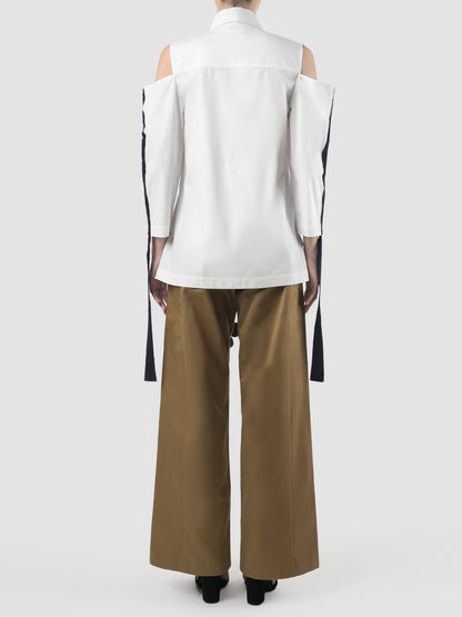The collar, lapels, and front button opening are all classic details, while cold-shoulder cut-offs and the side drawstrings add a touch of personality. The cool-toned shirt is made from crepe fabric and polyester, perfect for both hot and rainy days.