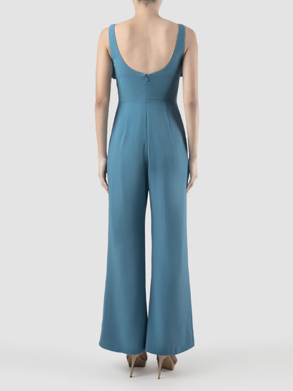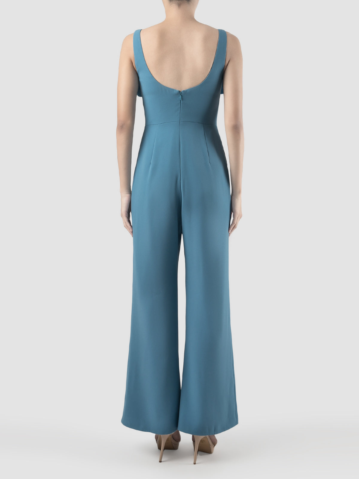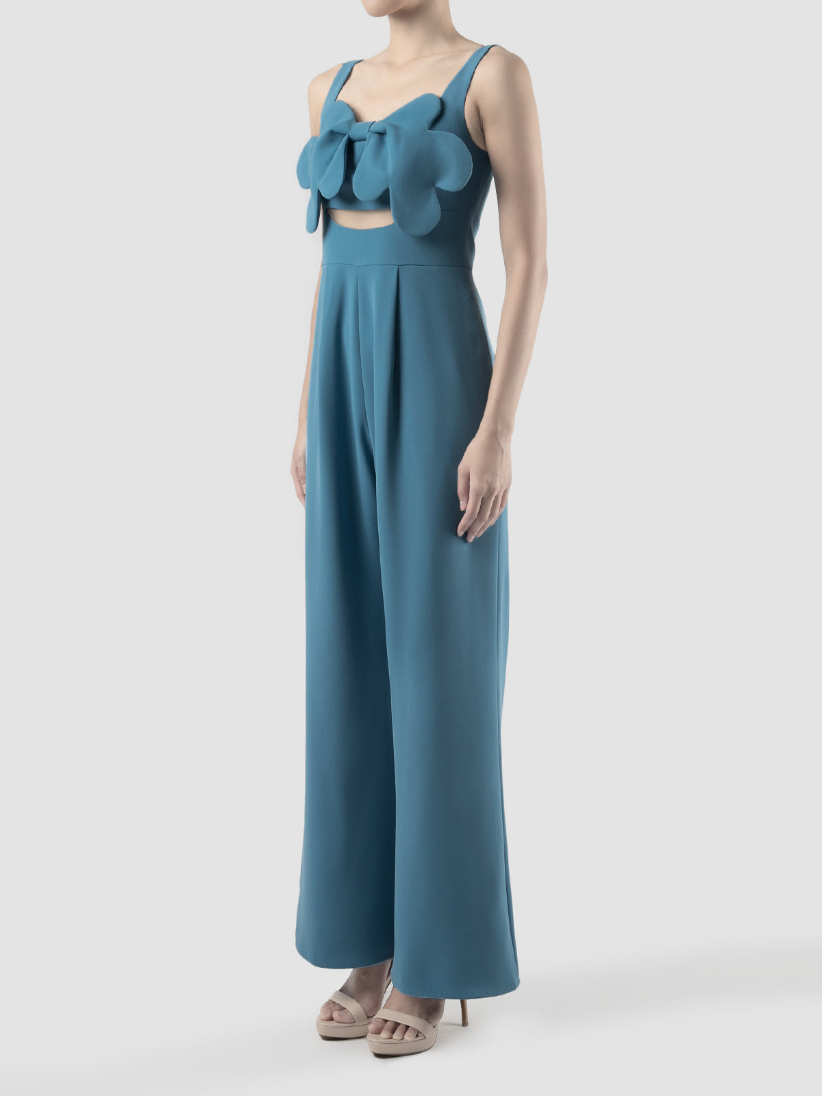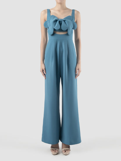 The stunning light royal blue-colored Octave jumpsuit features a wide-leg design with wide shoulder straps and a delightful scallop bow accentuating the top.