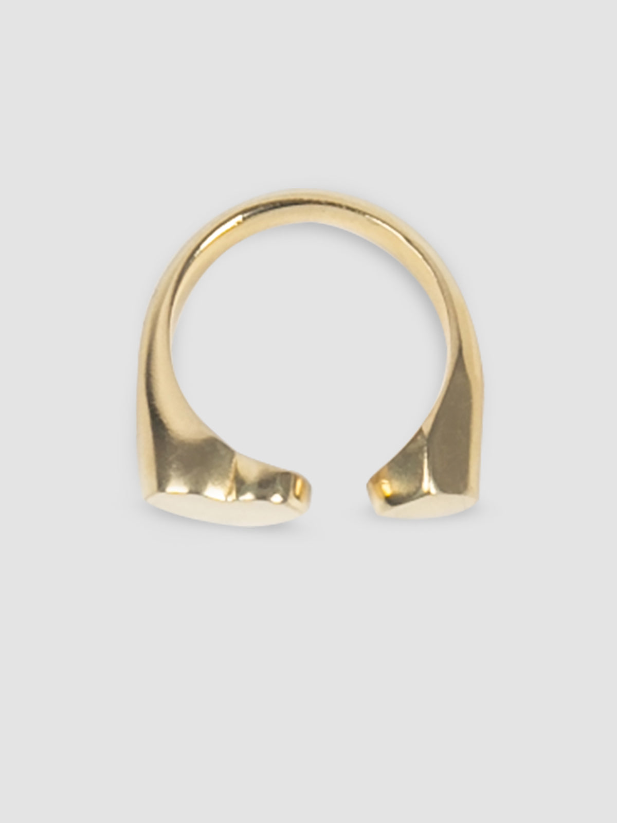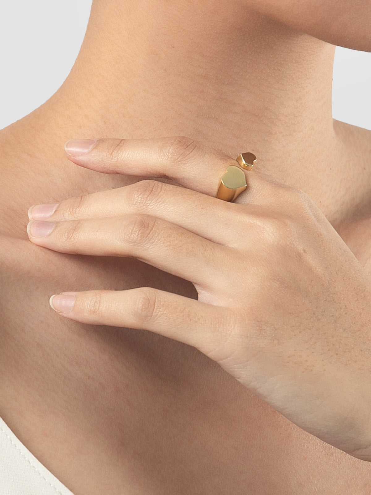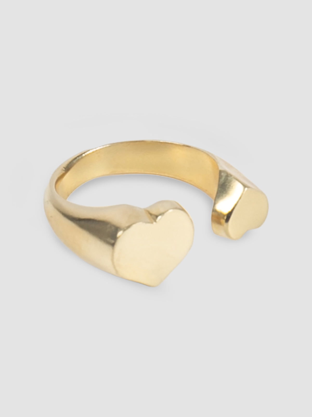 A chunky and stylish golden ring with an open-ended front, featuring heart-shaped accents on each edge, set at opposite angles.
