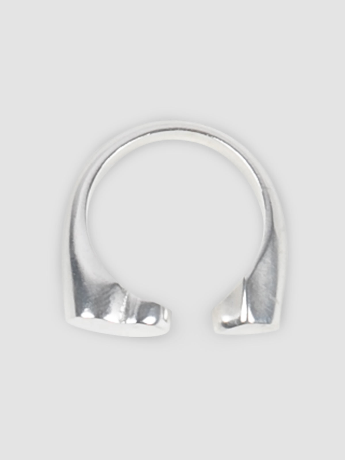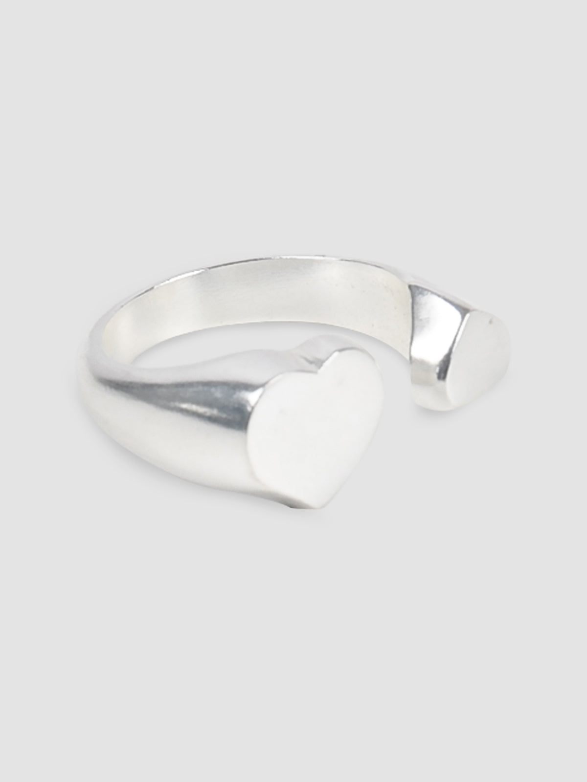 A chunky and stylish golden ring with an open-ended front, featuring heart-shaped accents on each edge, set at opposite angles.