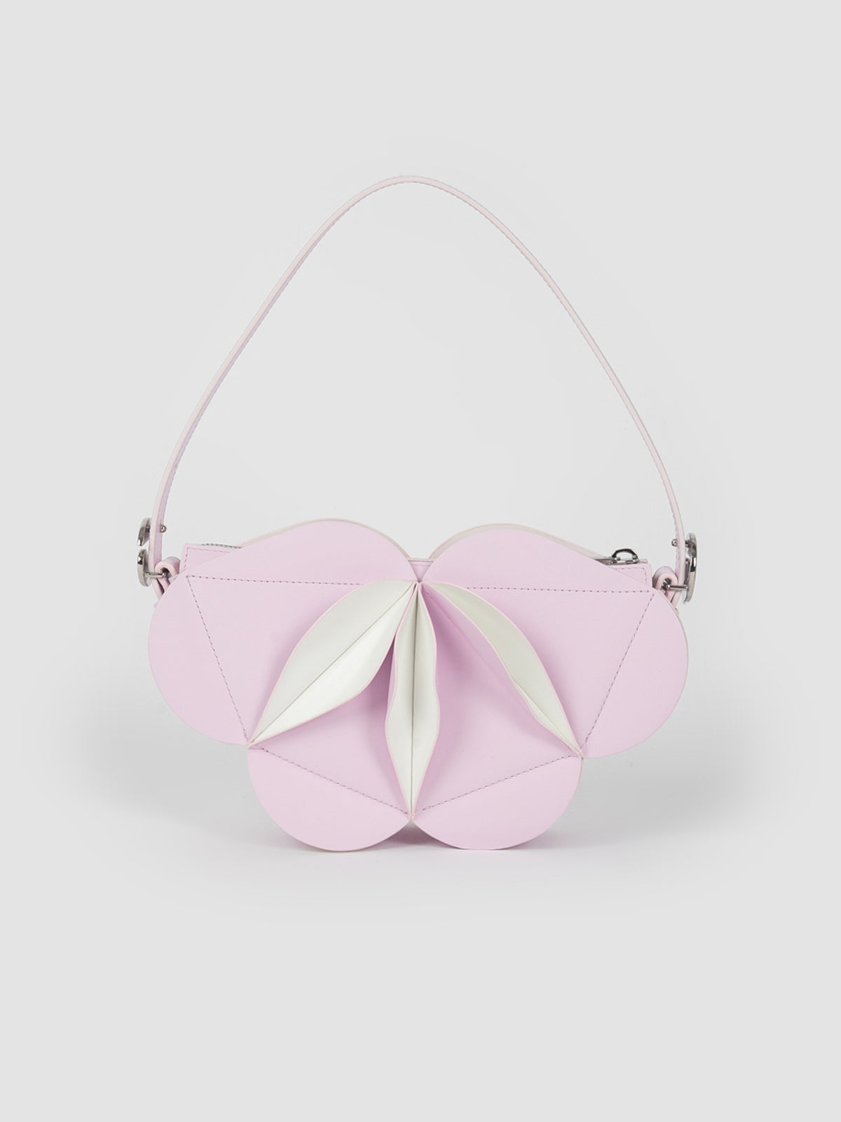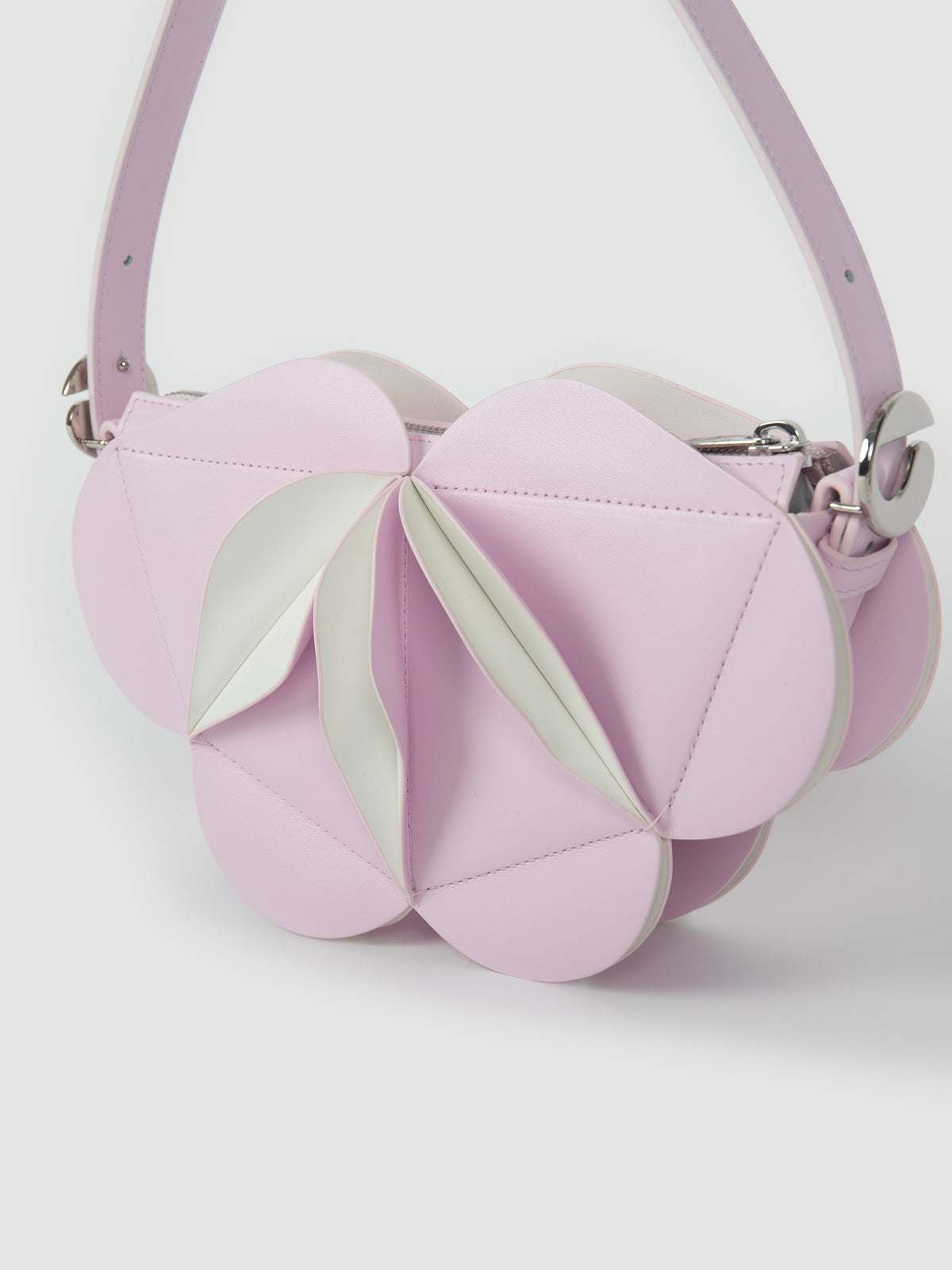 Add a touch of style to your glamor with the Pink Origami Bag from Coperni. This structured bag boasts a unique geometric shape that appears to be crafted from folded concentric squares, giving it a modern and architectural look. The bag is made from soft, smooth pink leather and has an arching top handle that sits comfortably over the shoulder.