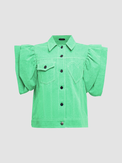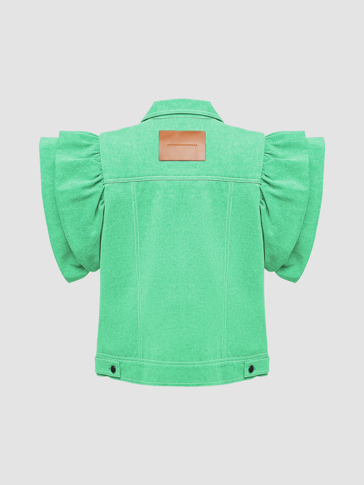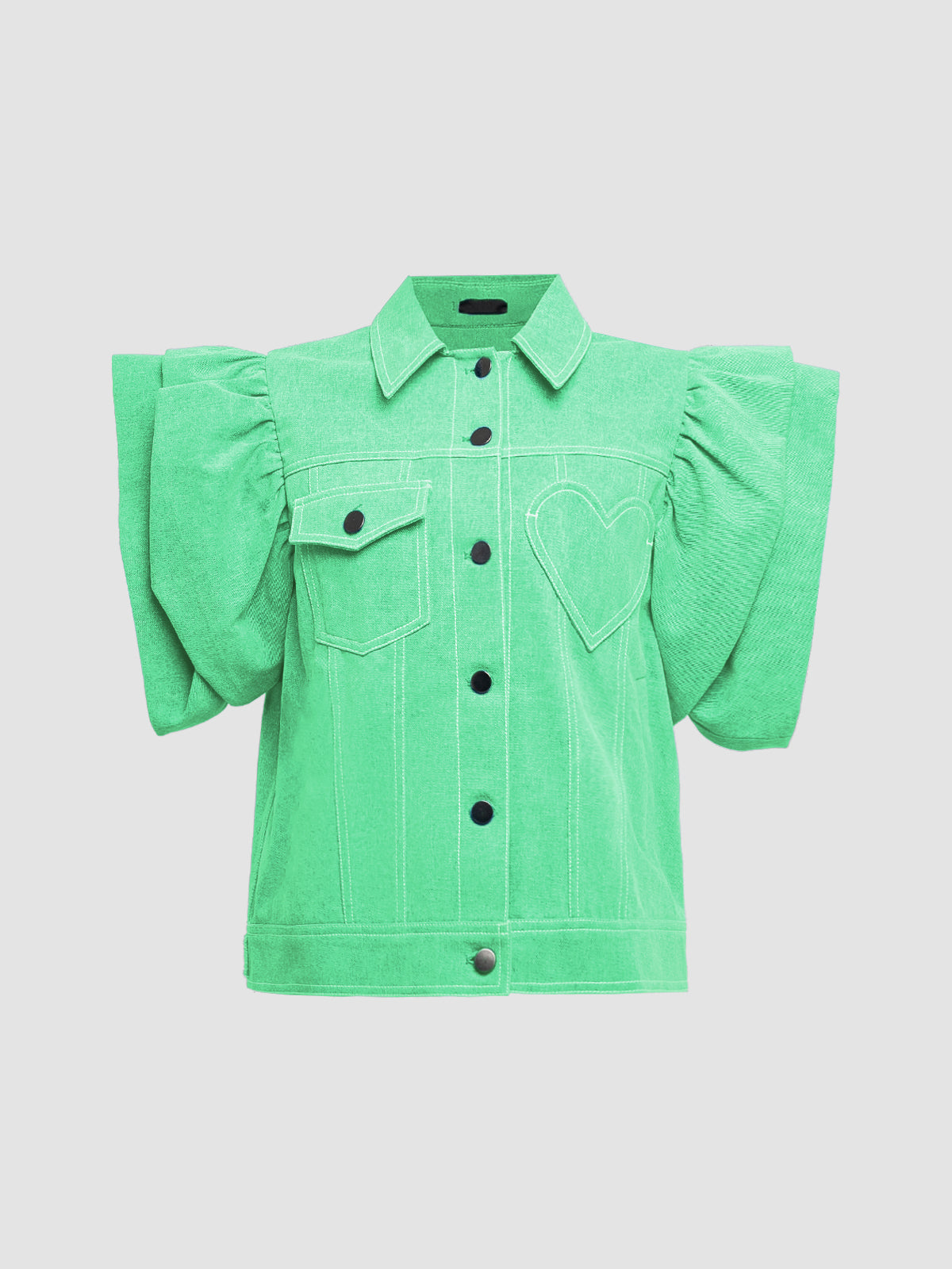 This denim jacket features traditional shirt collar, double pockets at chest, unstructured gathered sleeves, and belt loops. Button fastening at front. Relaxed fit.