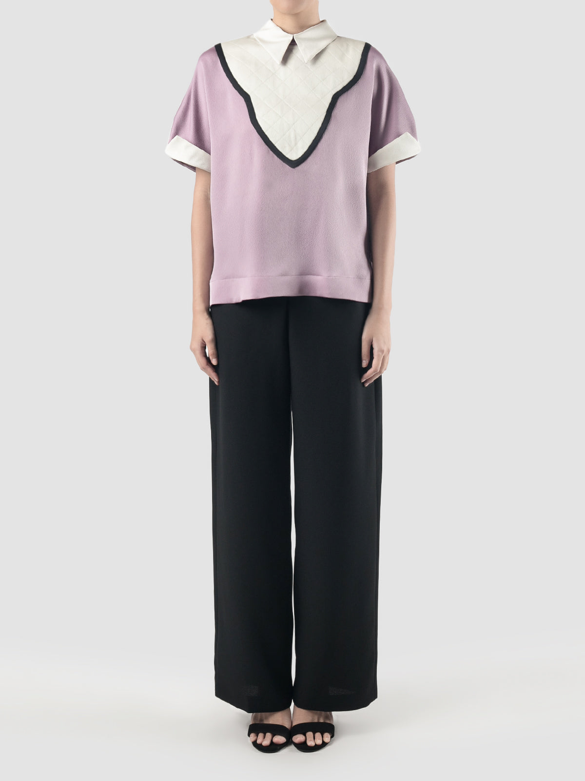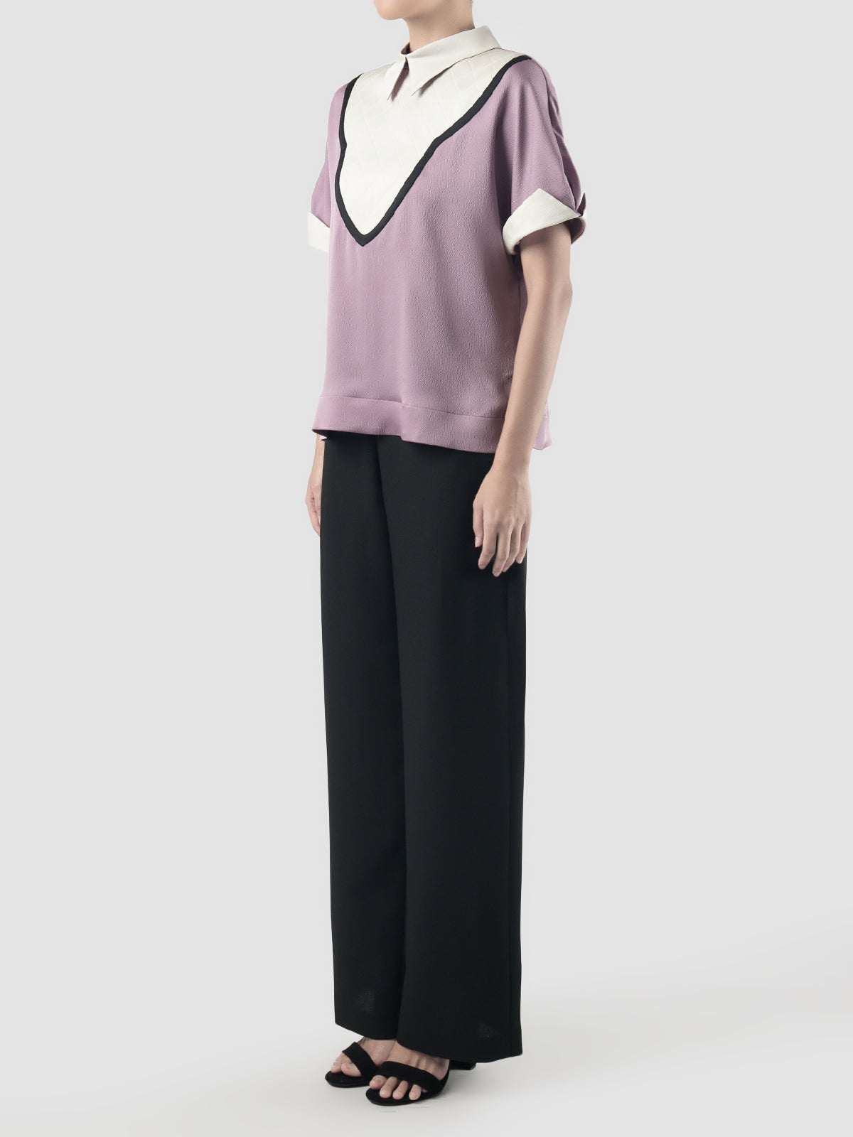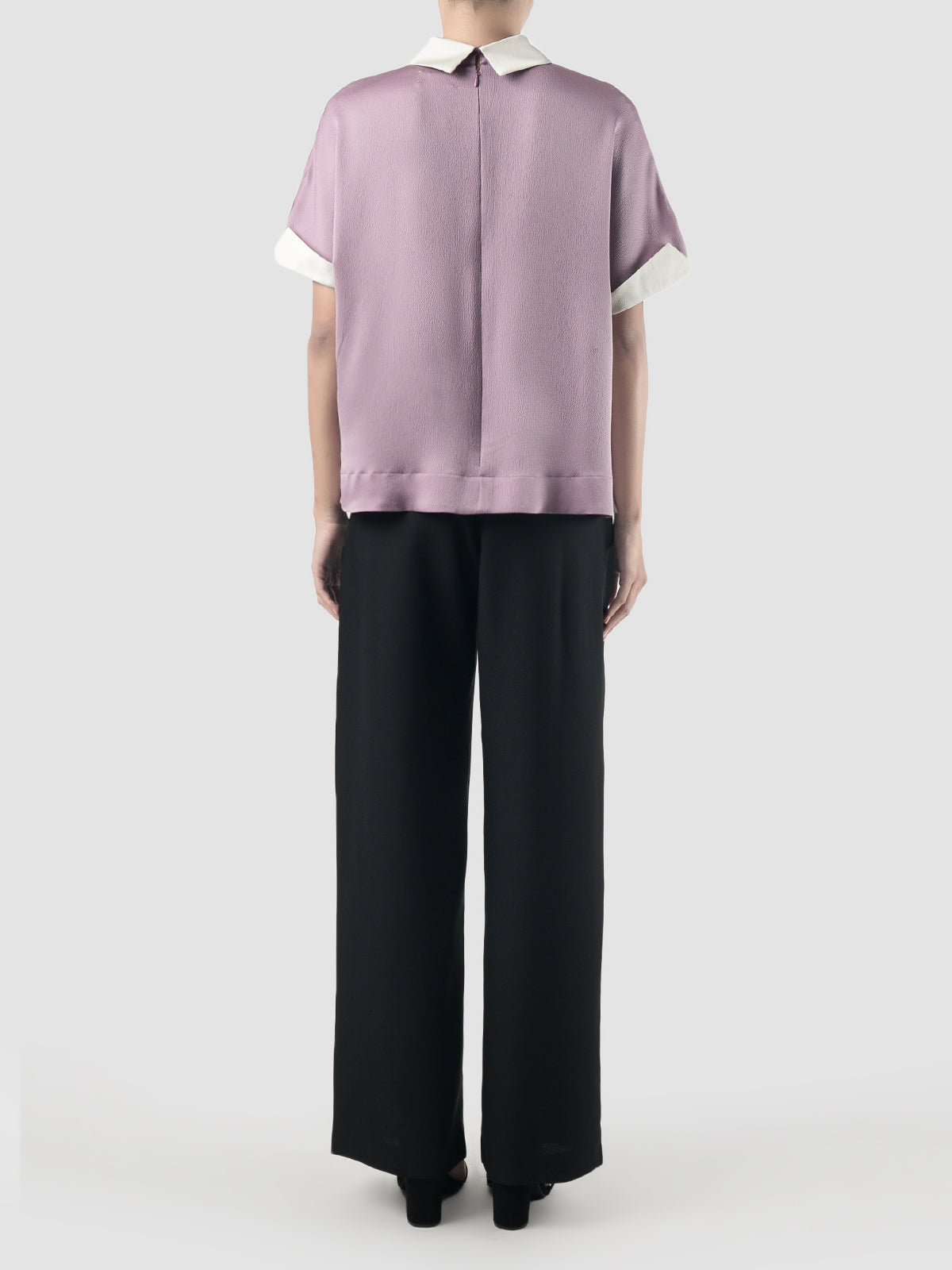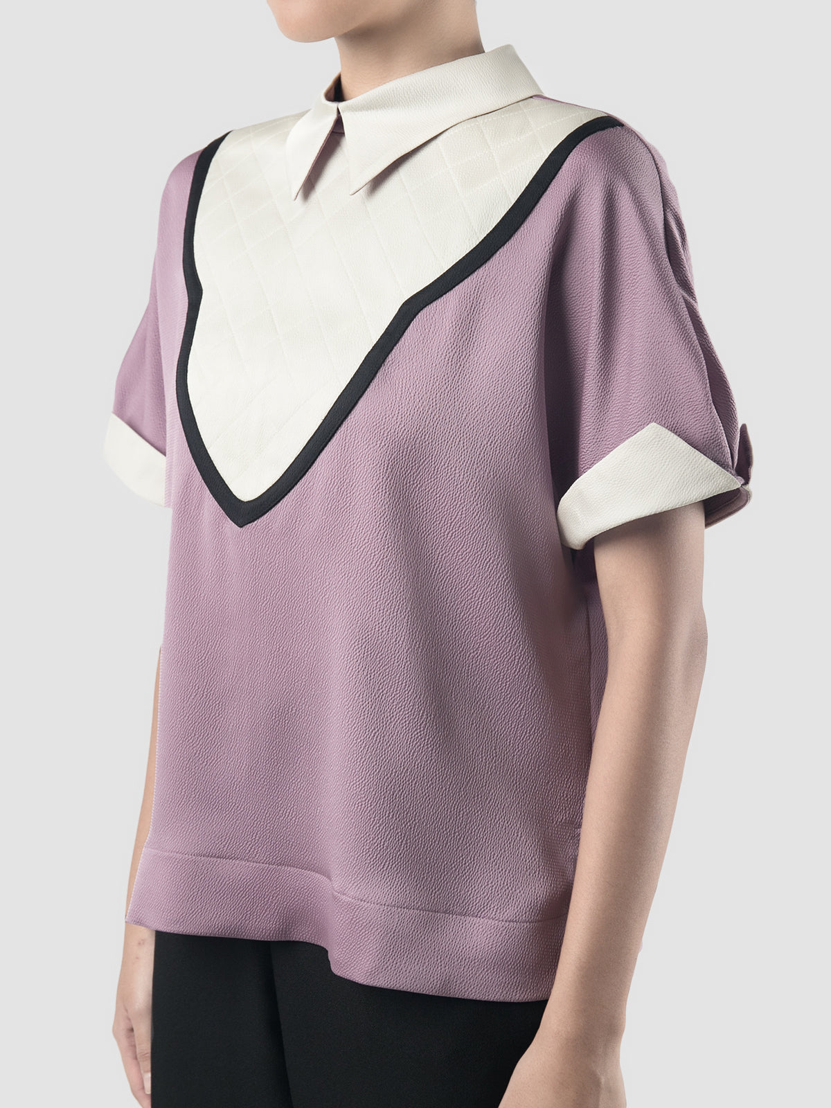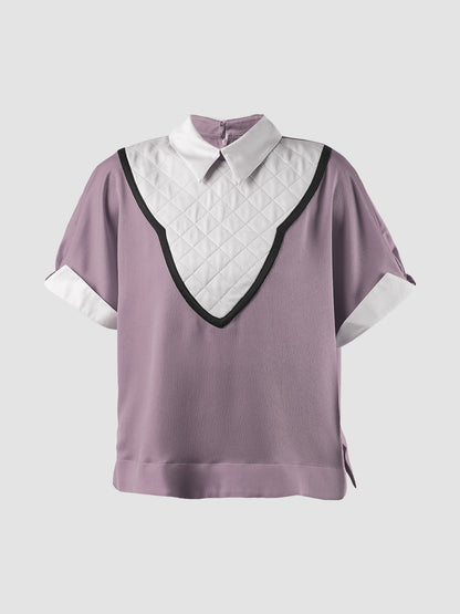 This purple short-sleeve blouse features a classic collar for a touch of timeless elegance and short sleeves with reversed cuffs in crisp white.