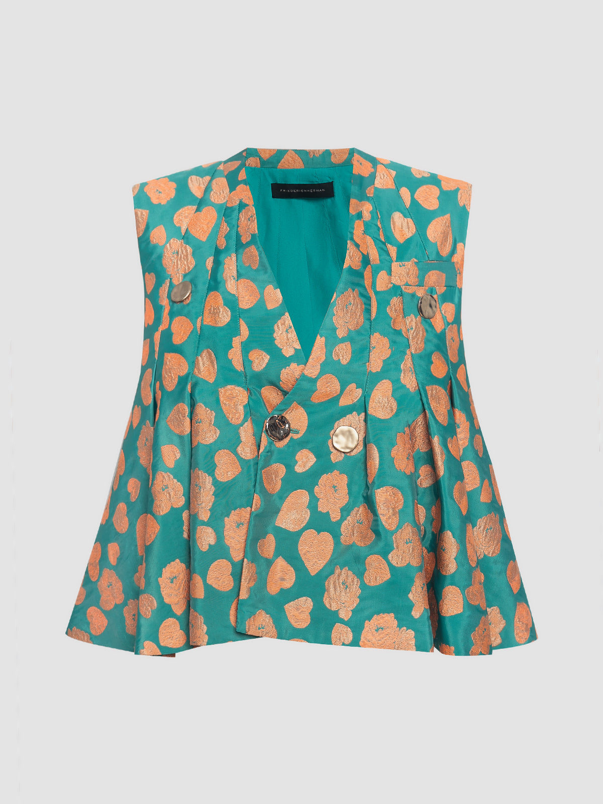 This sleeveless top features double-breasted opening with contrast buttons, faux chest welt pocket, and pleat details throughout. Double-breasted button opening at front. Fits true to size.