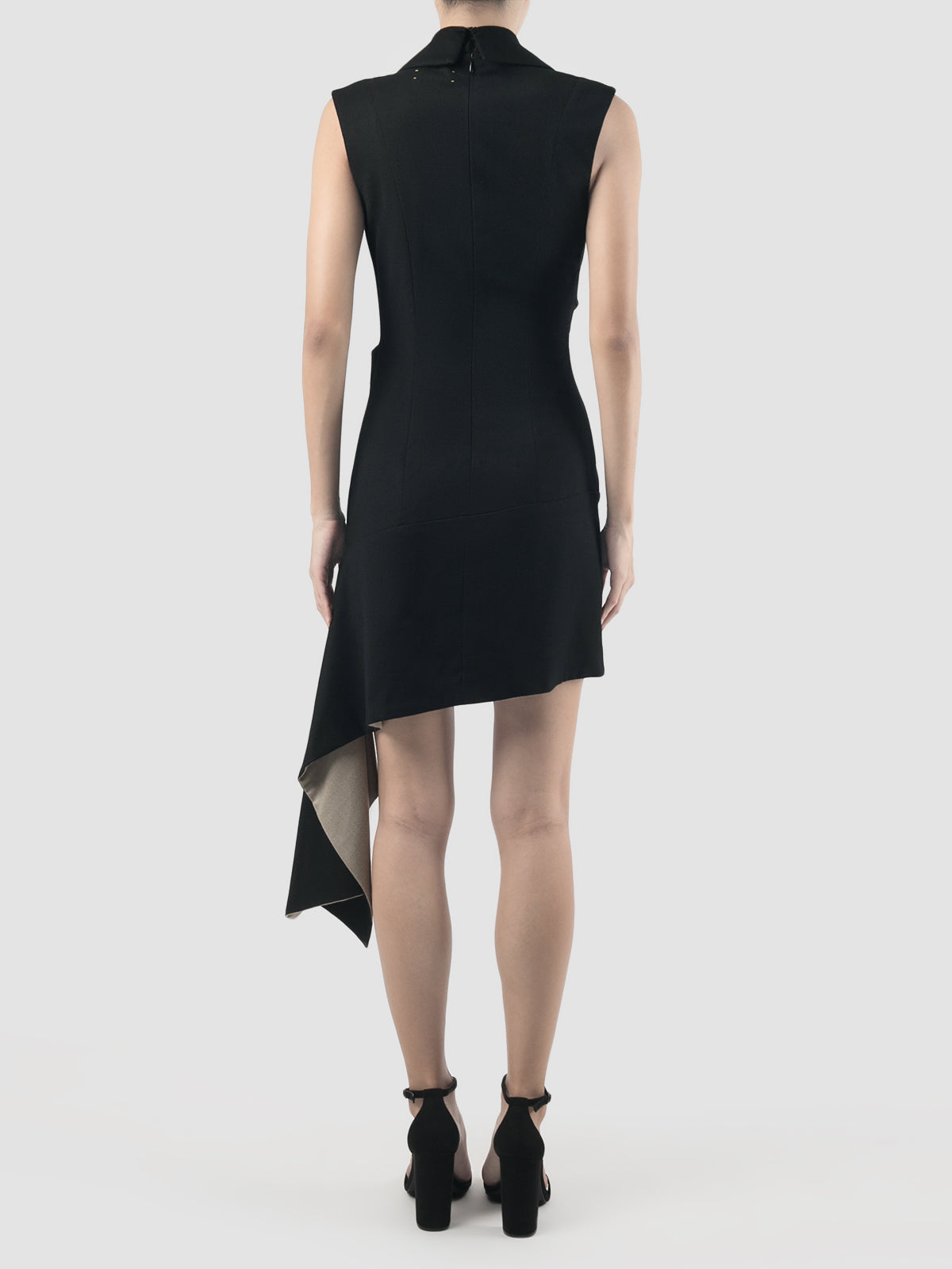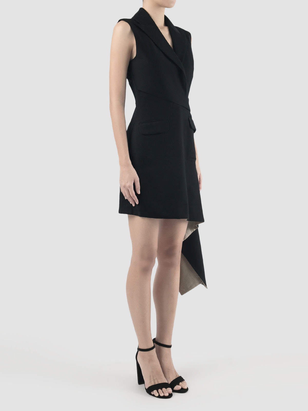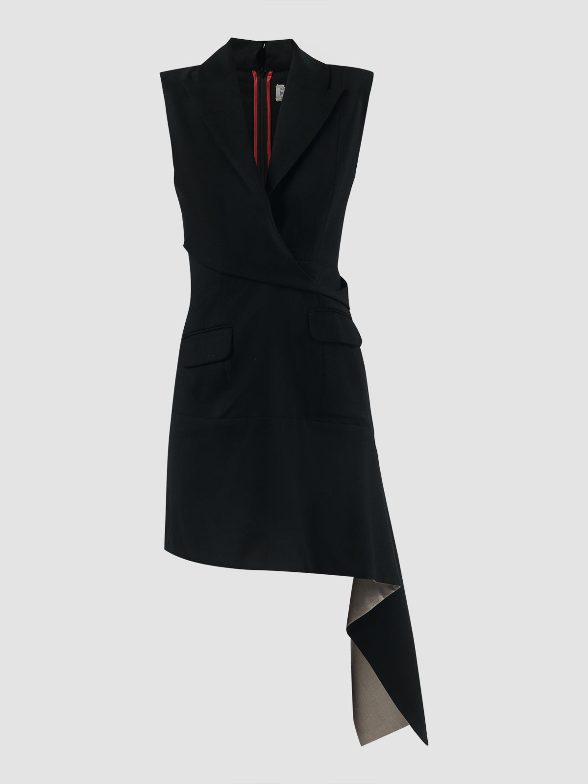 The classic notched collars are subtly cut diagonally towards the end and asymmetrical hems, enhancing the avant-garde-wrapped dress appearance with a dangling panel on one side.