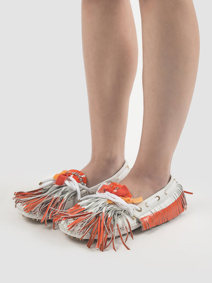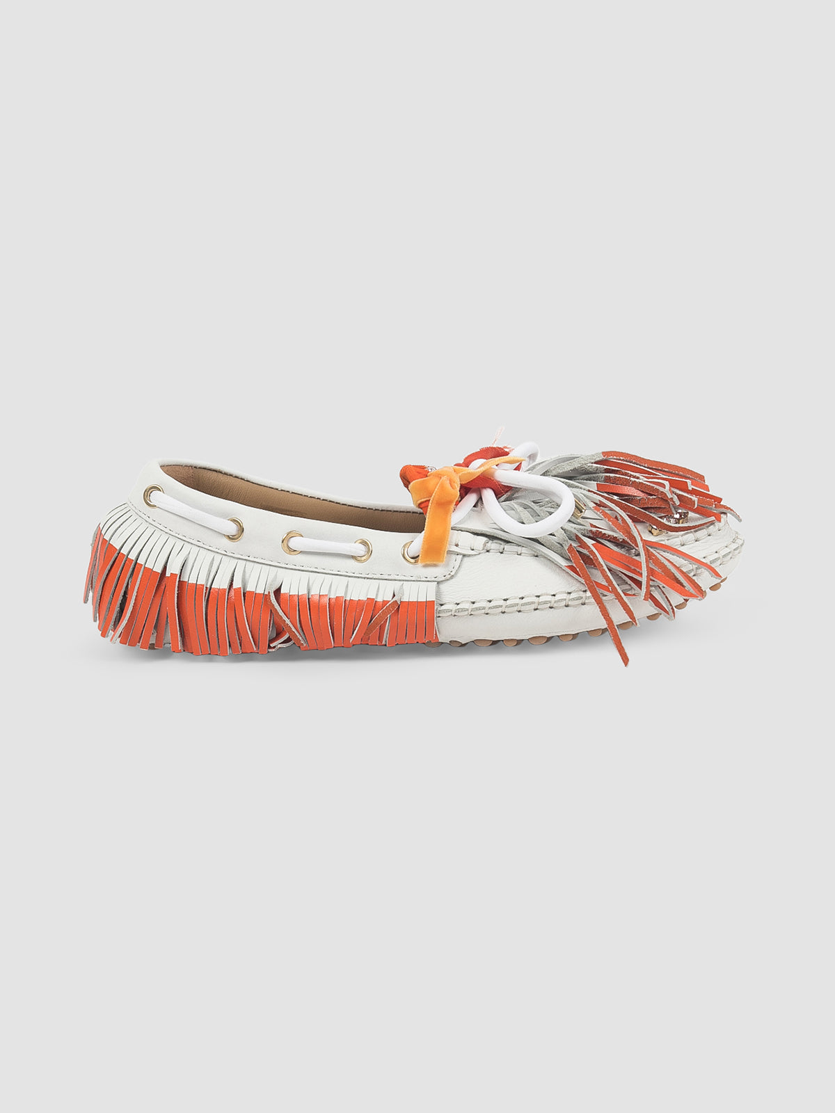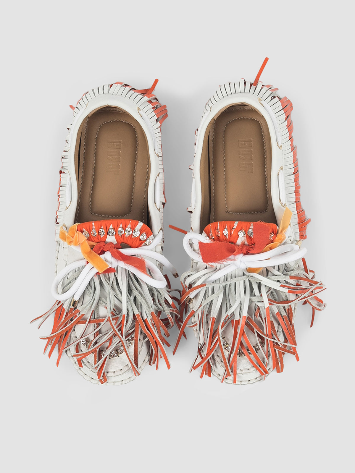 Handcrafted moccasins with fringes. Made with recycled ribbons, Italian fabric scraps, and crystals. Quilted leather insole and leather-rubber stud outsole.