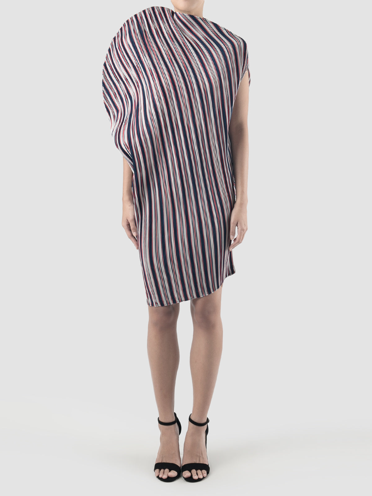 This midi dress features an asymmetrical shoulder design: one shoulder extends out with exaggerated volume, draping down to the elbow, while the other sleeve is short and tight.