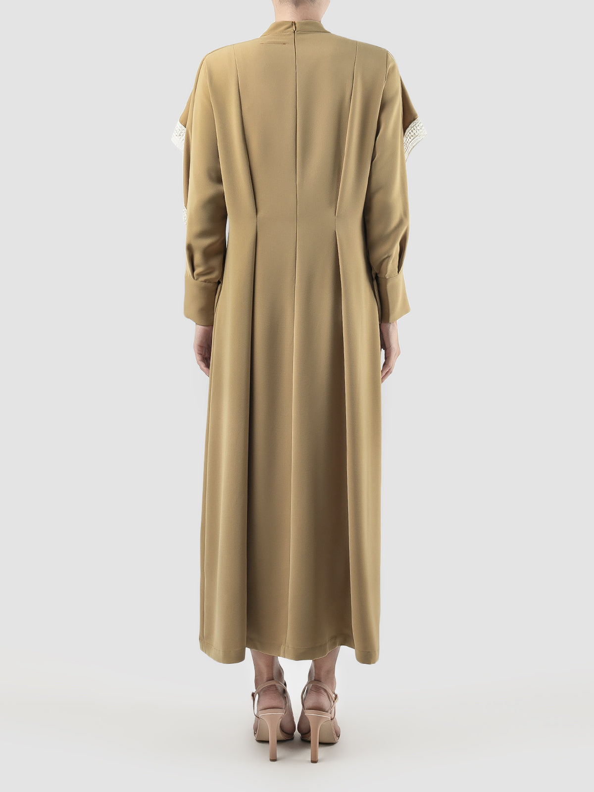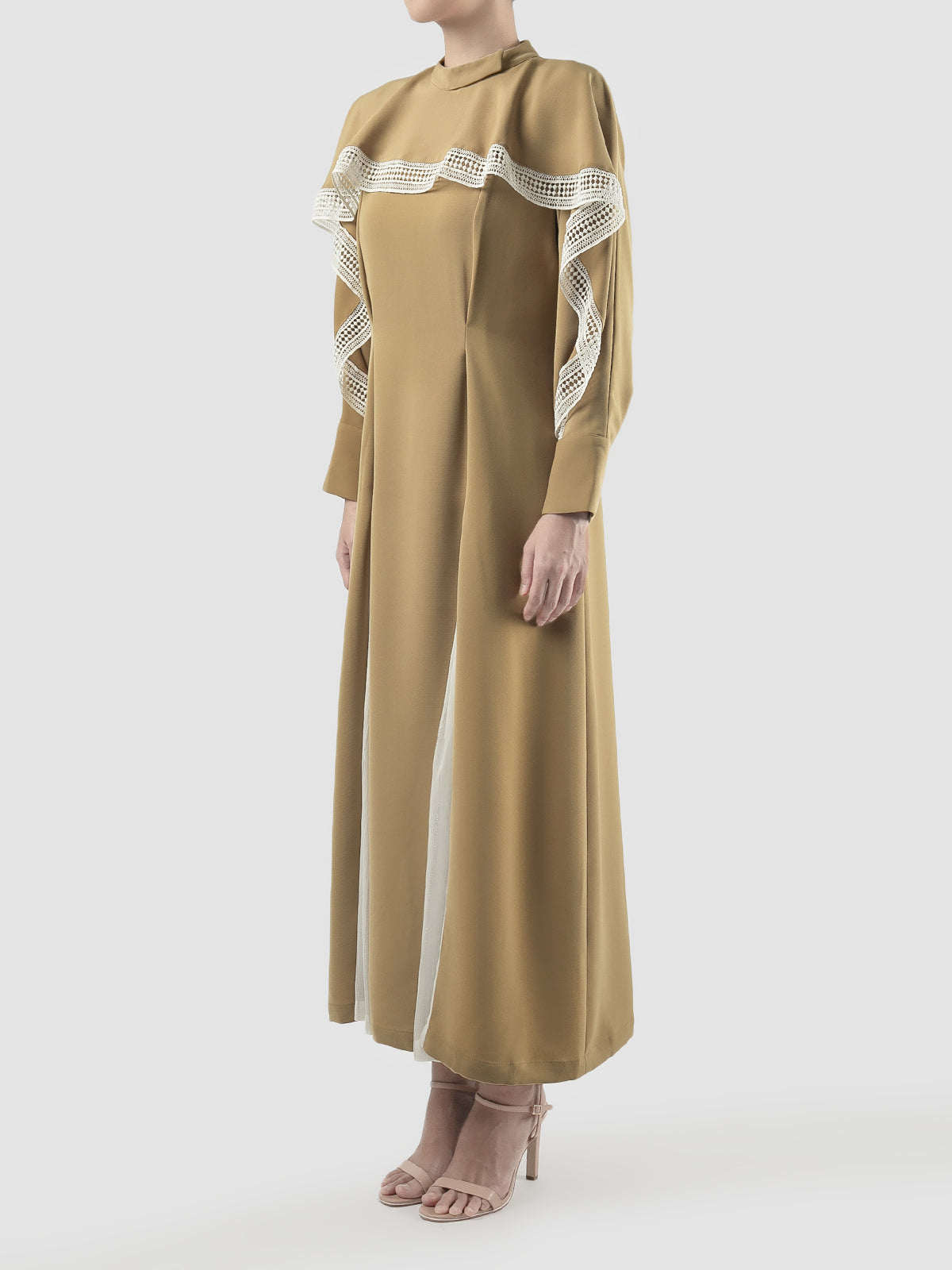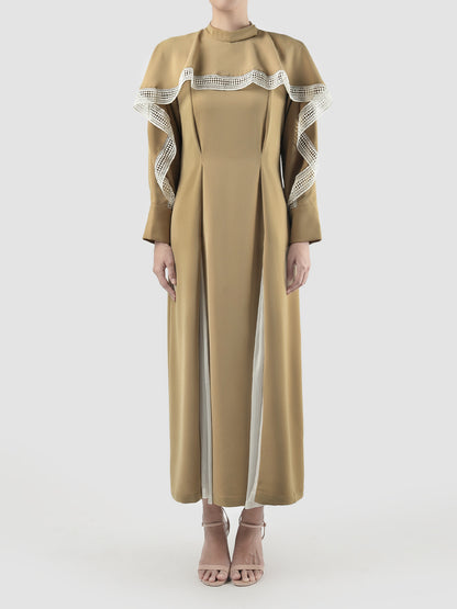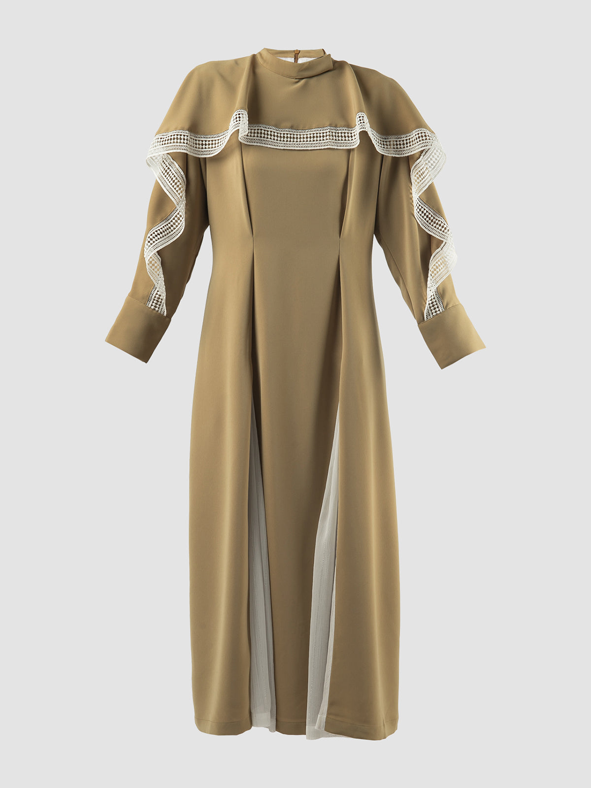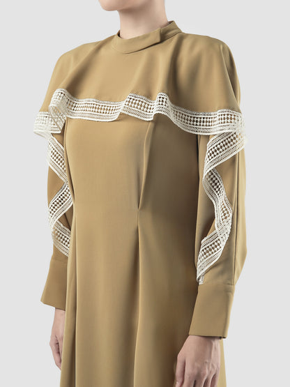 The tall round neckline snaps closed at the side, while intricate lace embellishment adorns the yoke and extends gracefully down to the sleeves.