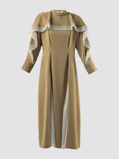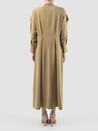 This long-sleeve dress harmoniously combines satin and linen-blend fabric, creating a captivating contrast in textures.