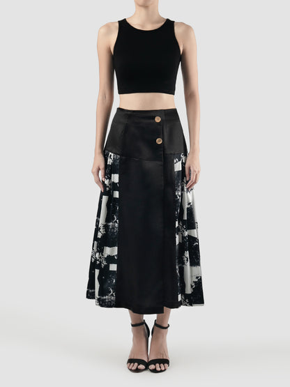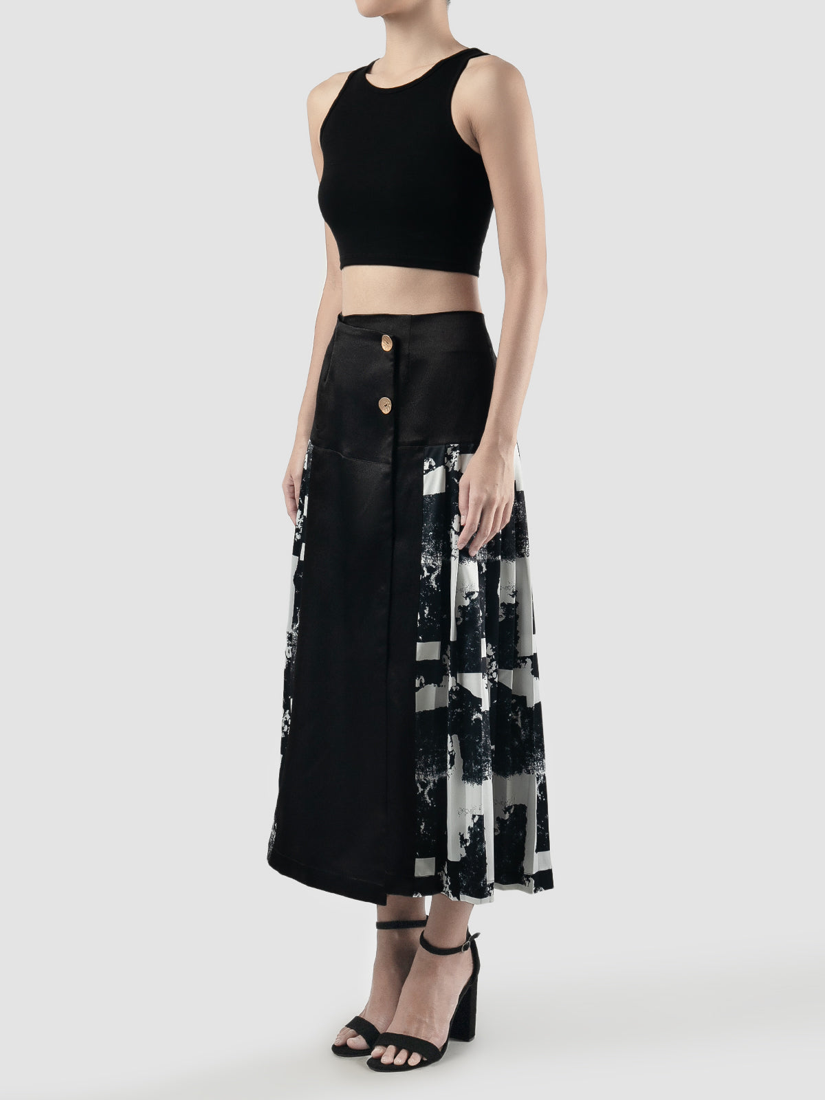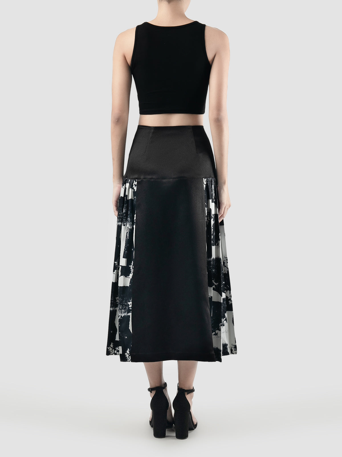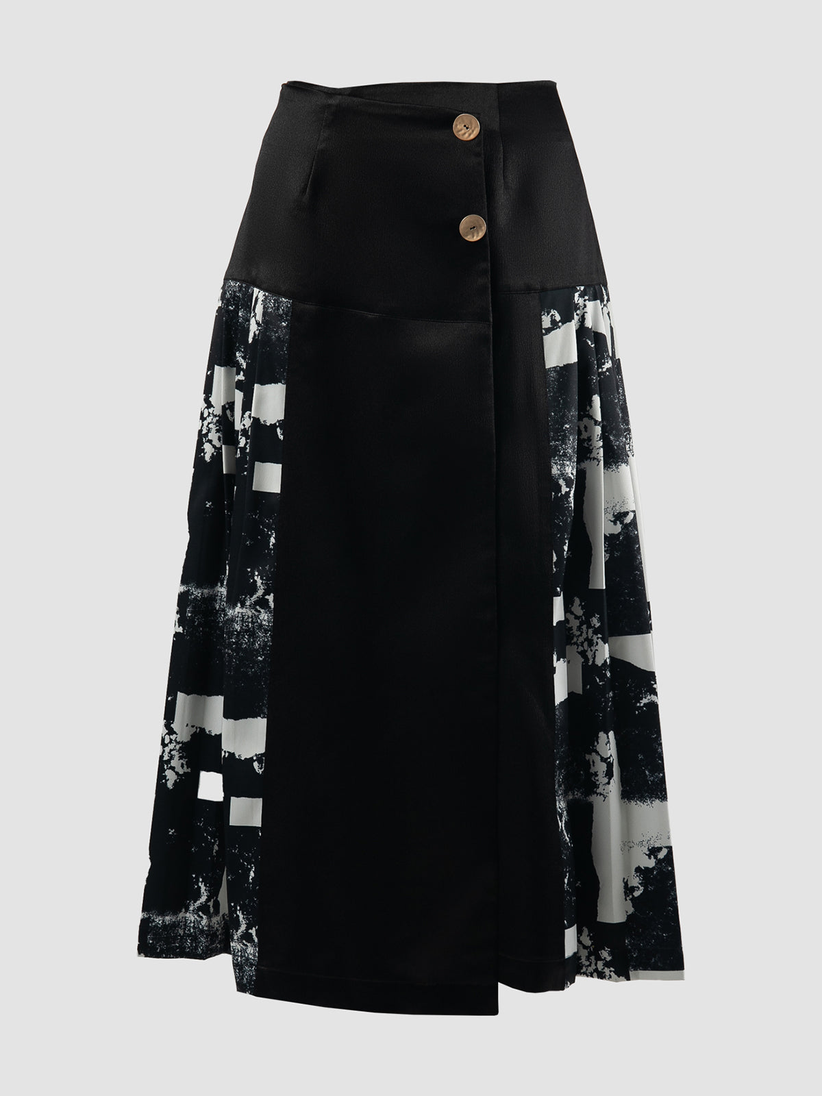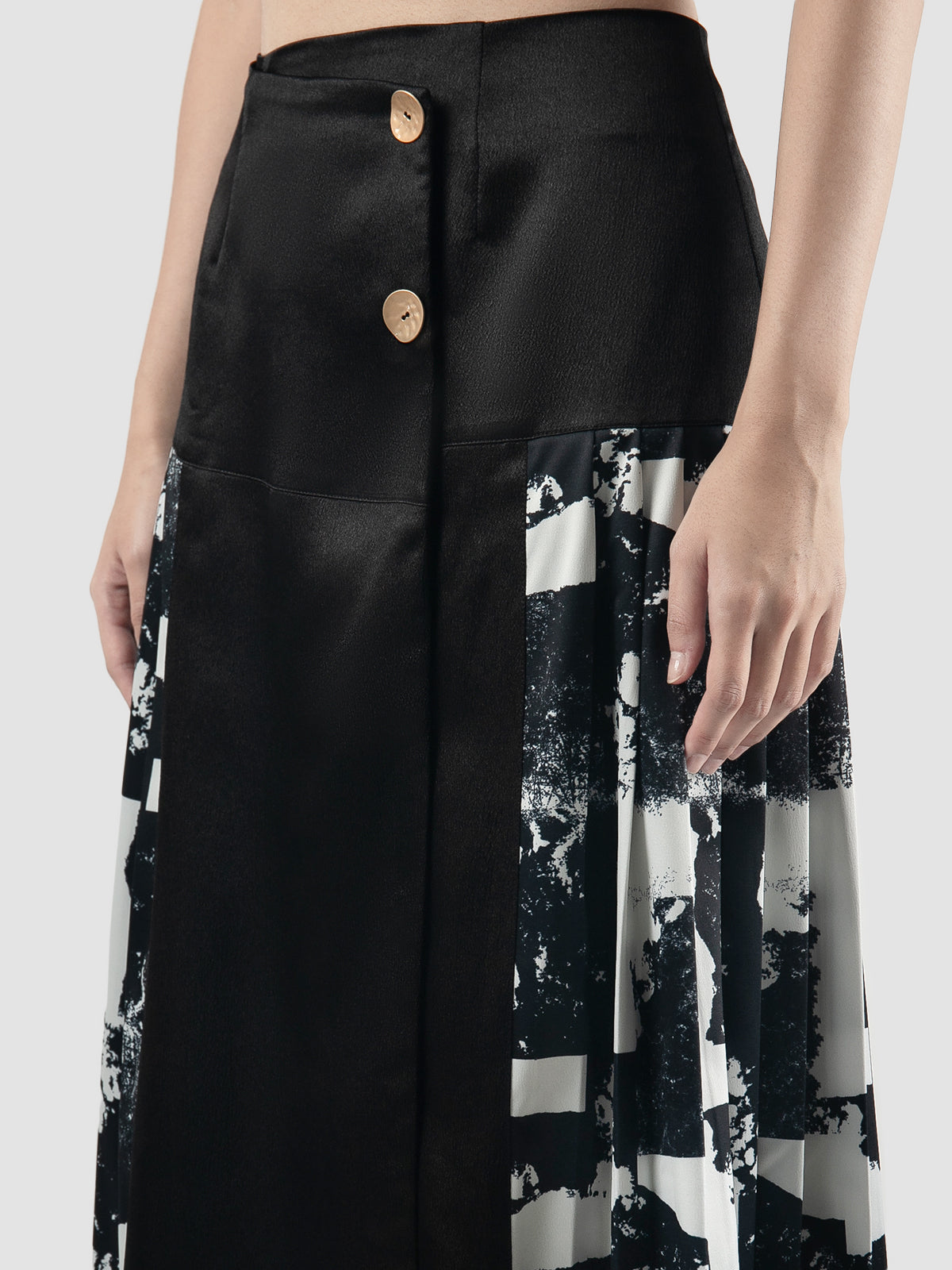 Pleated panels made from abstract printed fabrics adorn each side, creating a unique and voluminous look.